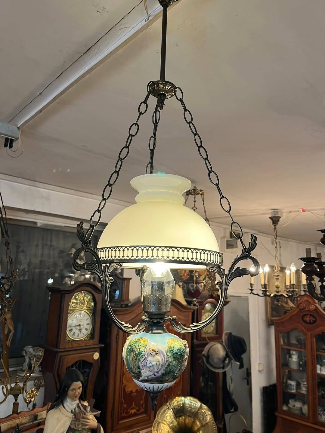 Lampă suspendată antică, stil Art Nouveau / Belle Époque – bronz și sticlă opalină pictată manual 850,00 RON 0,00 RON