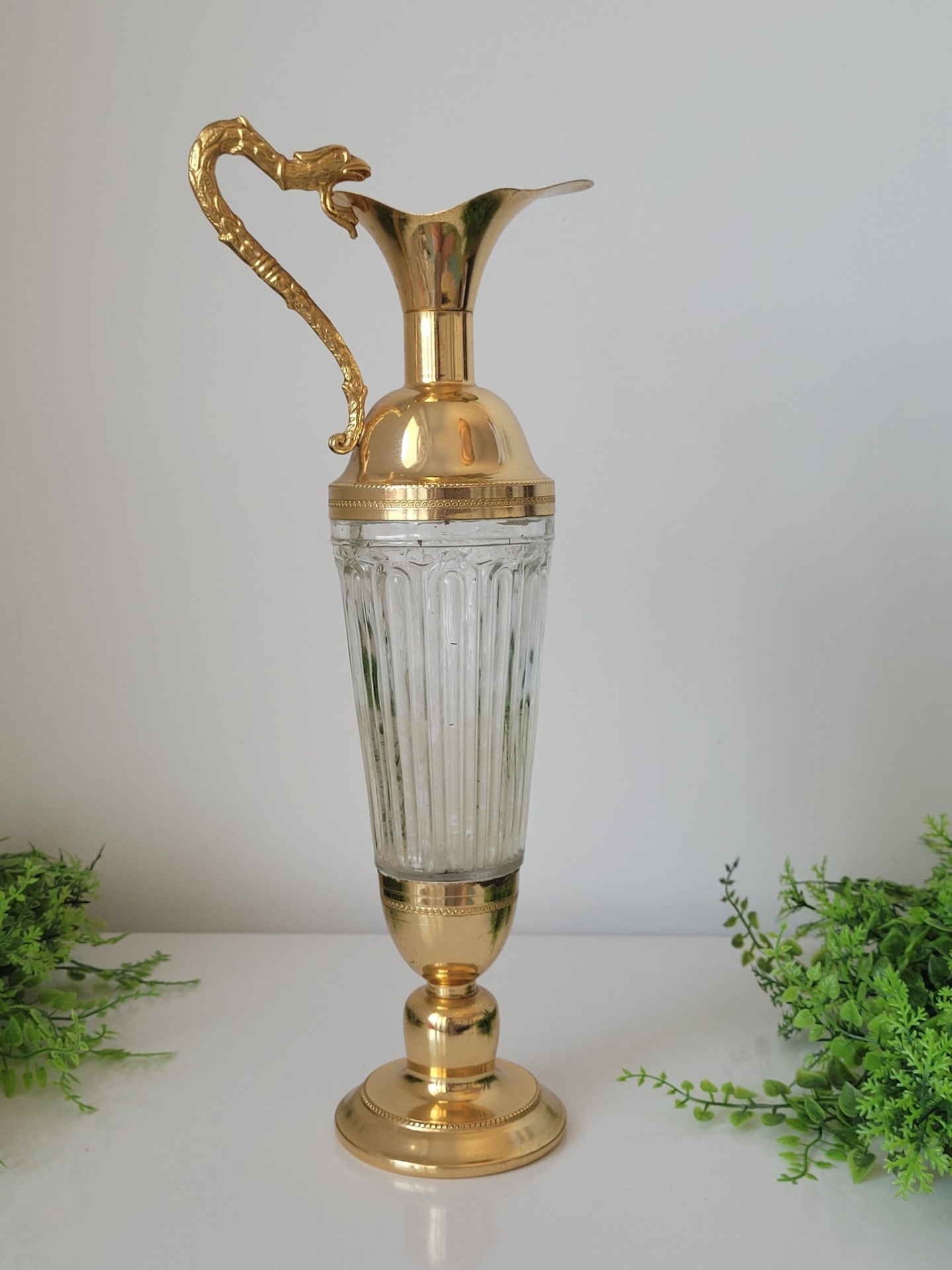 Carafă vintage din sticlă și metal aurit, cu dop și mâner stilizat, funcțională, Stoc epuizat 350,00 RON 0,00 RON