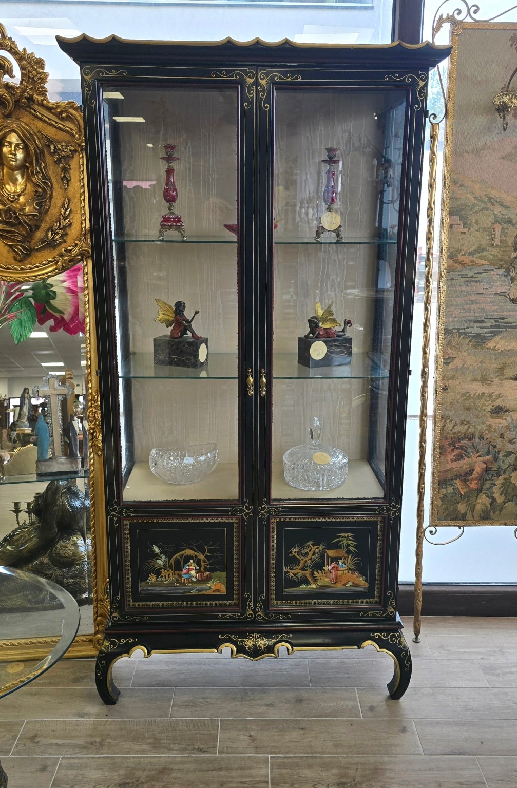 Vitrină deosebită în stil oriental, cu finisaj de lac negru lucios cu decorațiuni bogate aurii, 3.750,00 RON 0,00 RON