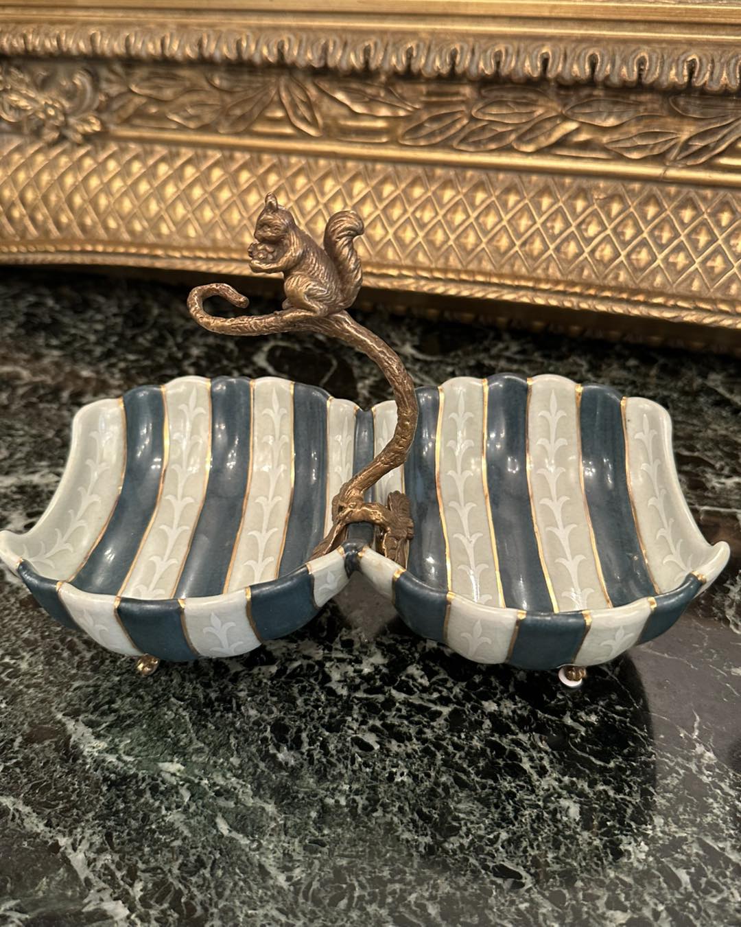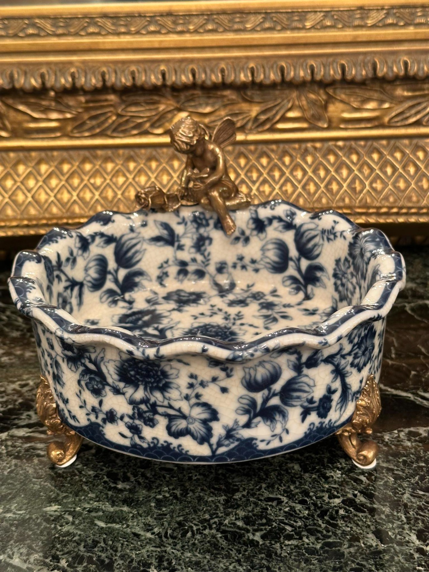 Fructieră din porțelan și bronz, cu detalii ornamentale și suport din bronz fin lucrat cu îngeraș. Stoc epuizat 1.250,00 RON 0,00 RON
