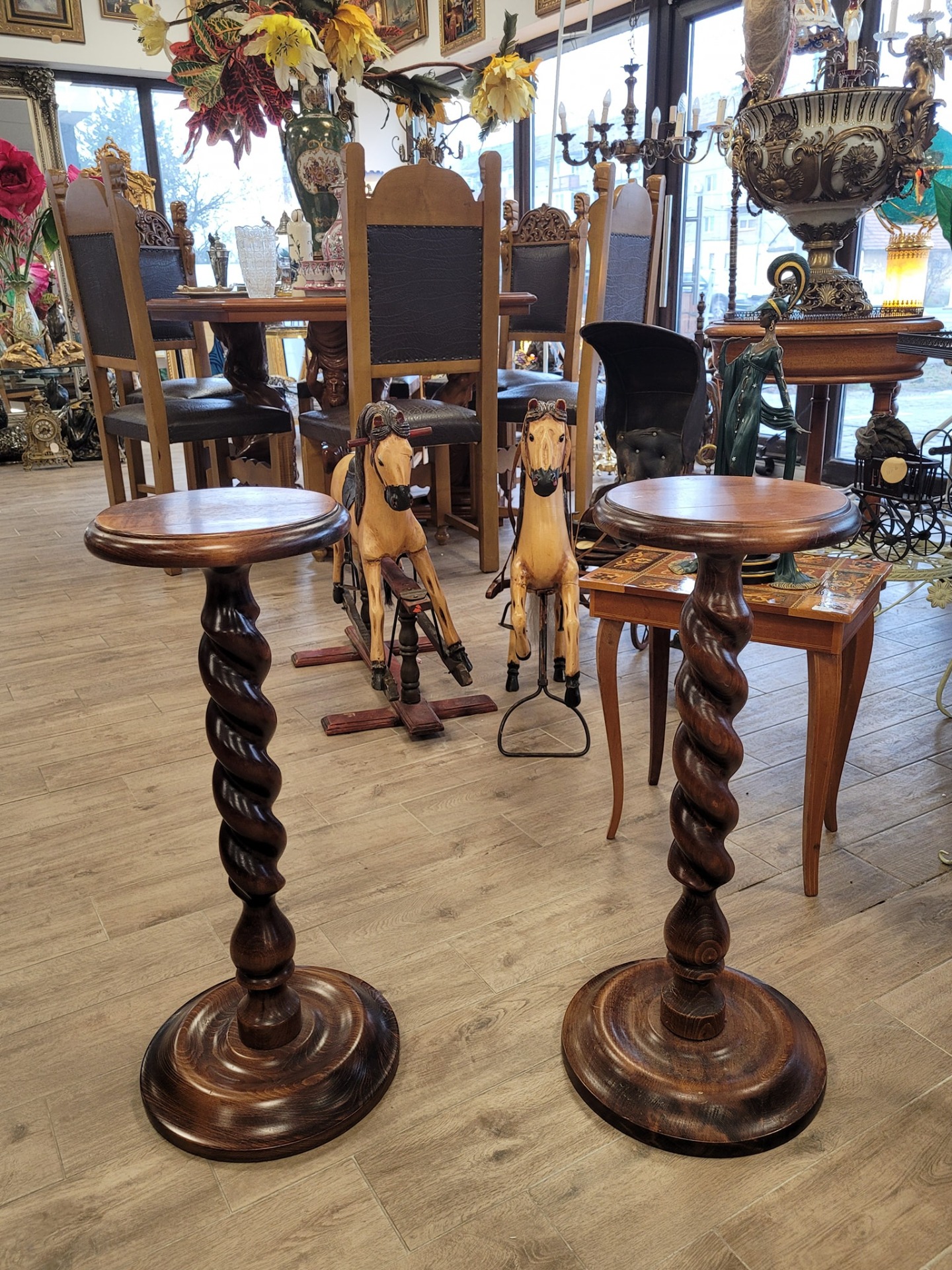 Pereche de suporți din lemn, cu nervuri naturale vizibile, stil Barley Twist, lucrate manual. Stoc epuizat 850,00 RON 0,00 RON