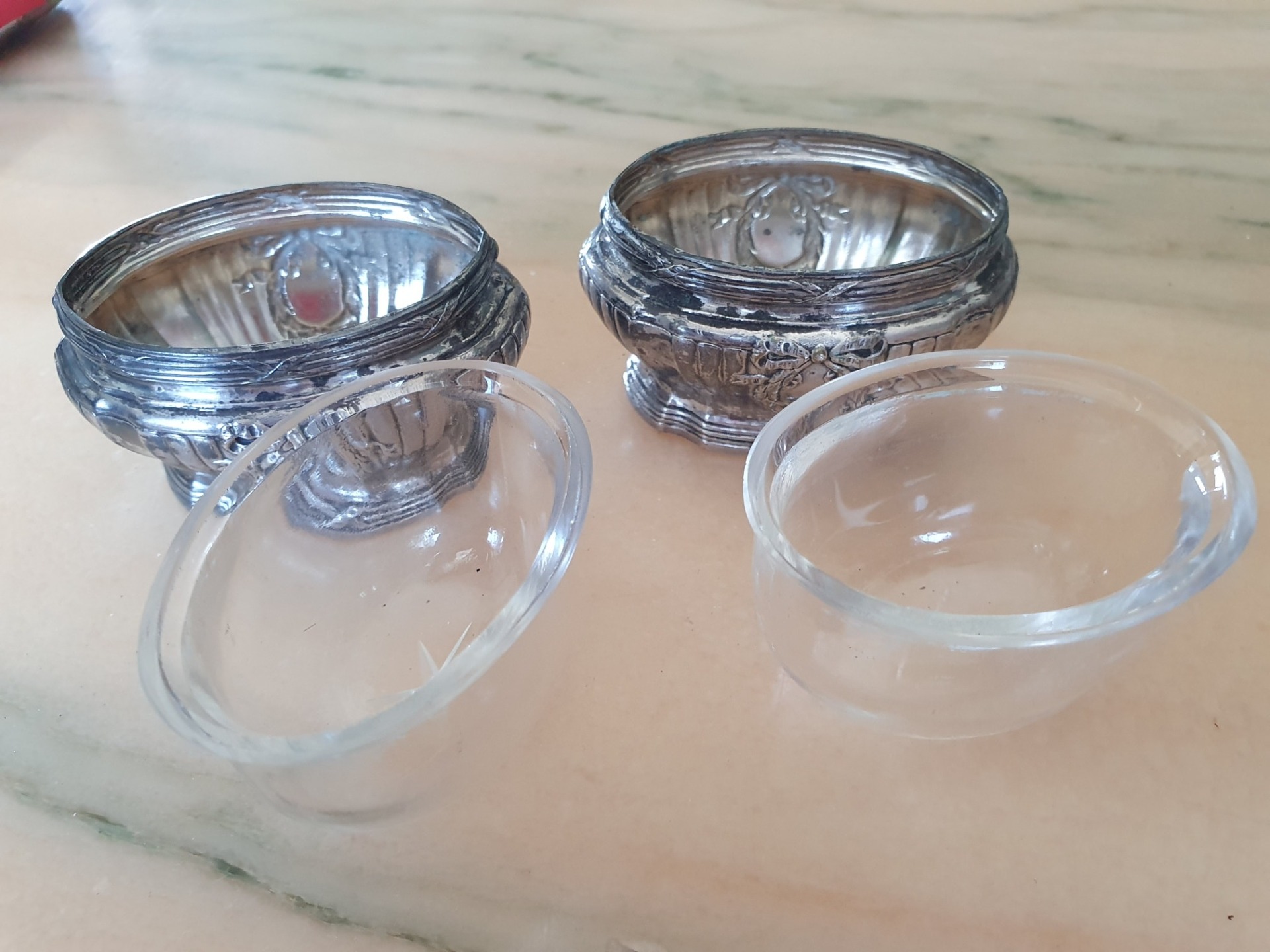 2 recipiente vechi din alama argintata si cristal,pentru servit icre negre,dulceturi,etc