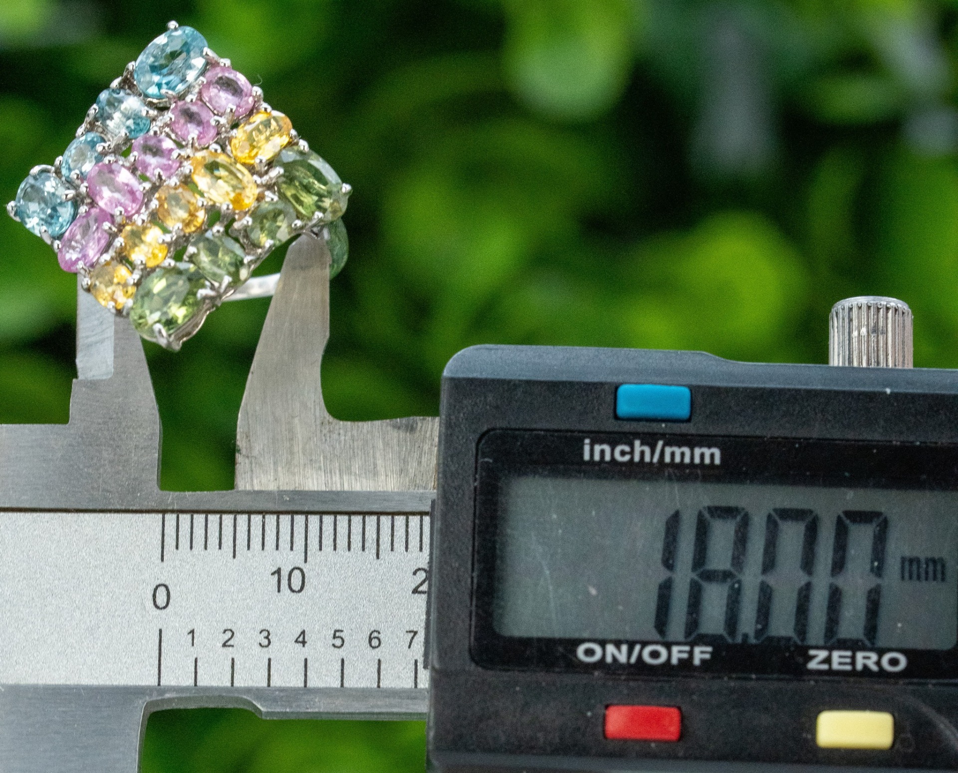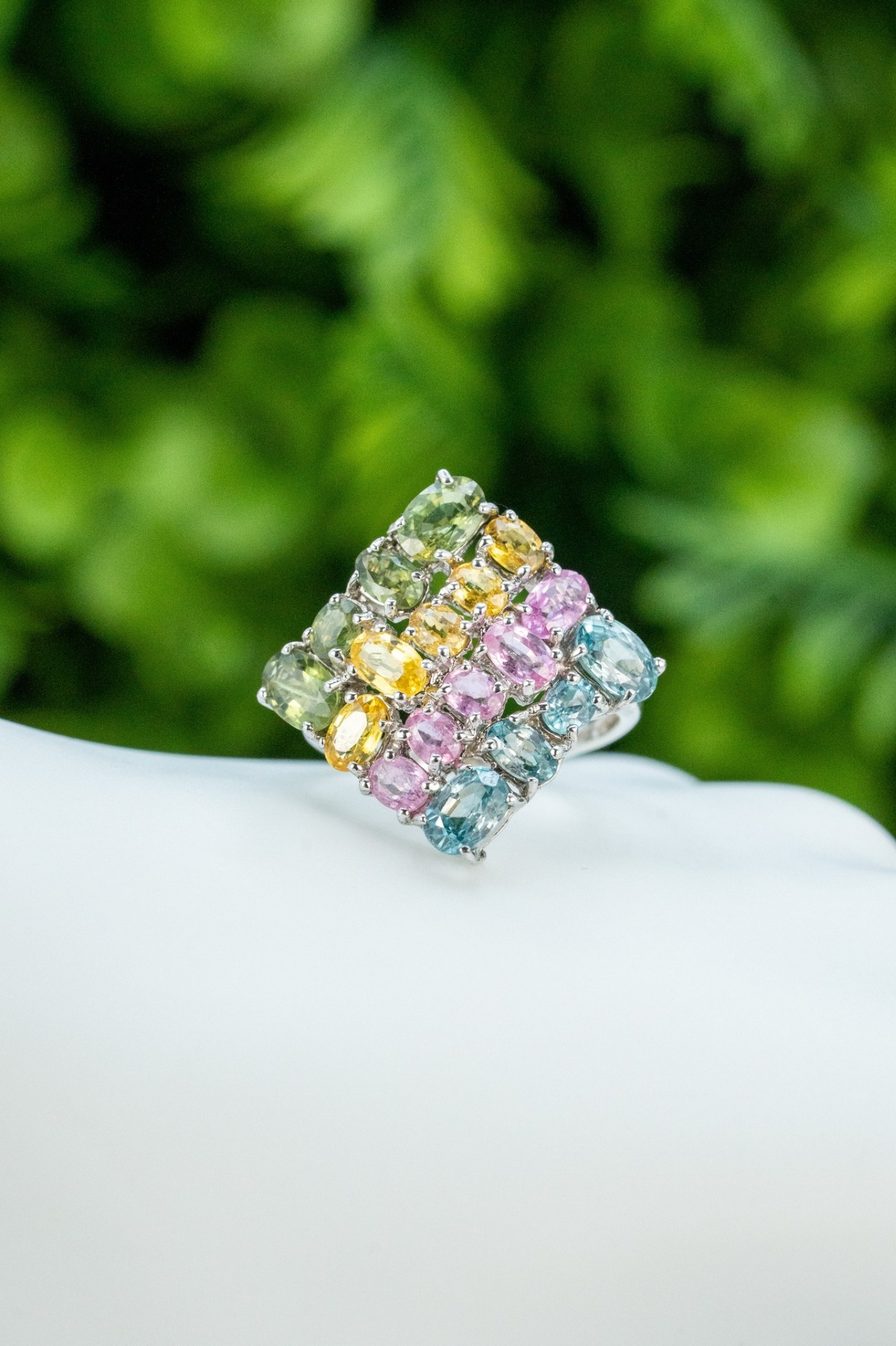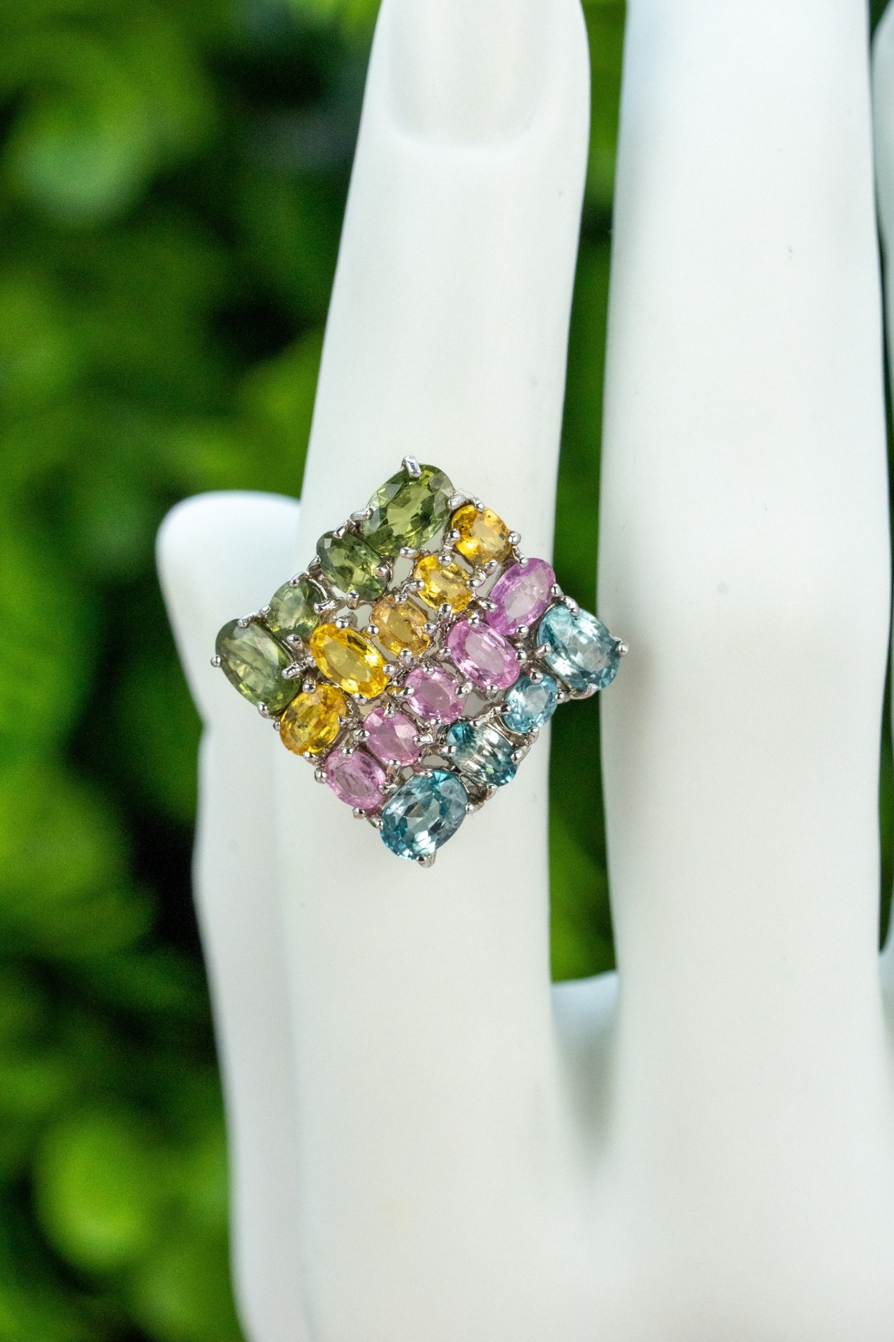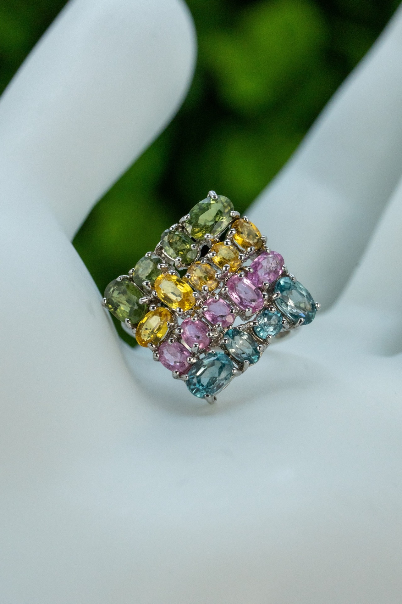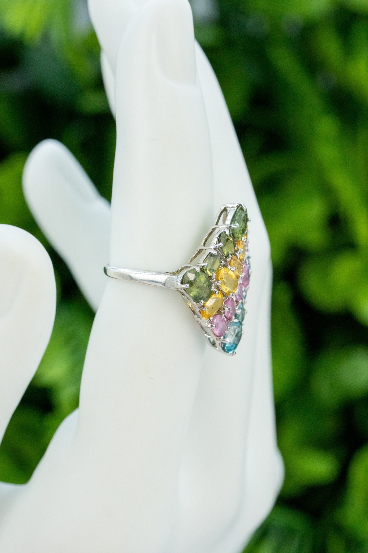 Inel vechi din argint, cu topaze naturale și safire de sinteza (verde, galben, roz).