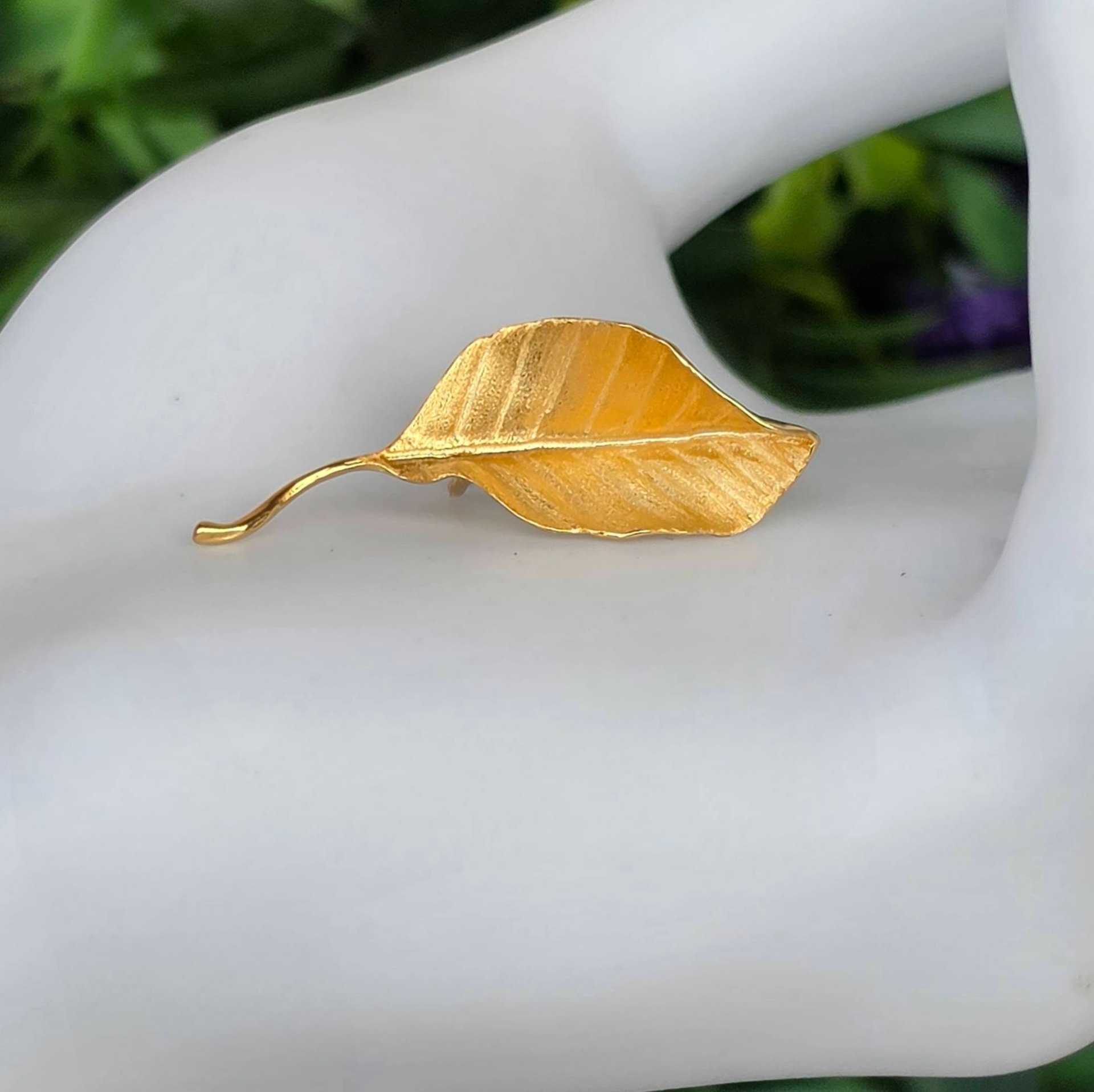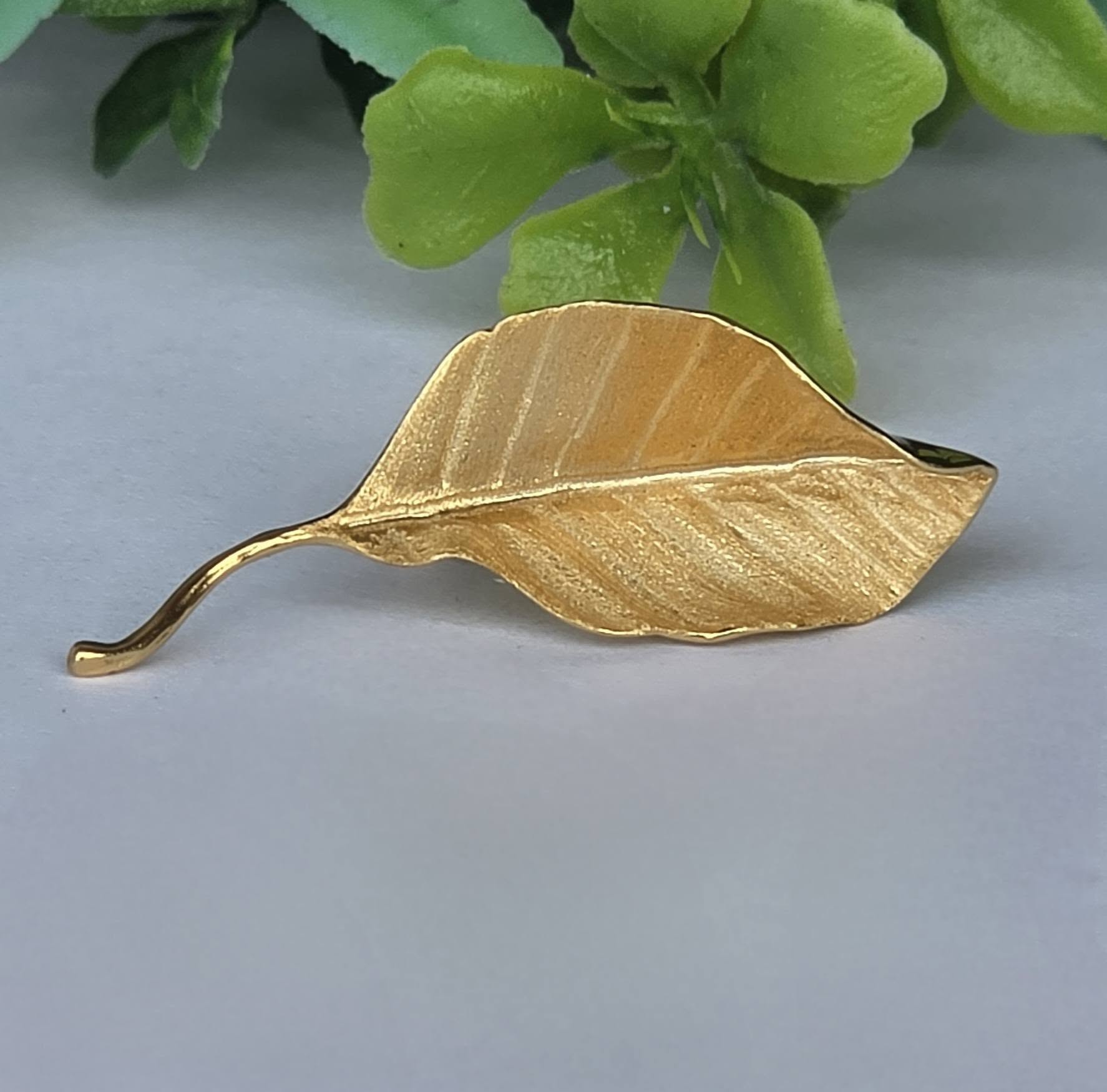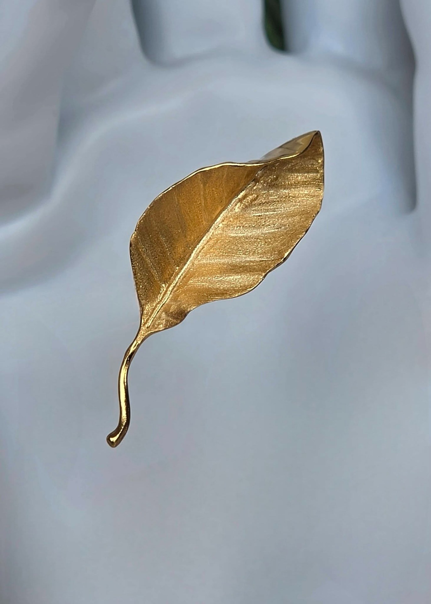 Ac de rever (broșă) contemporan superb, din argint placat cu un strat consistent de aur (vermeil), cu design organic tridimensional, stilizat sub forma unei frunze, cu șurub de prindere din metal aurit.