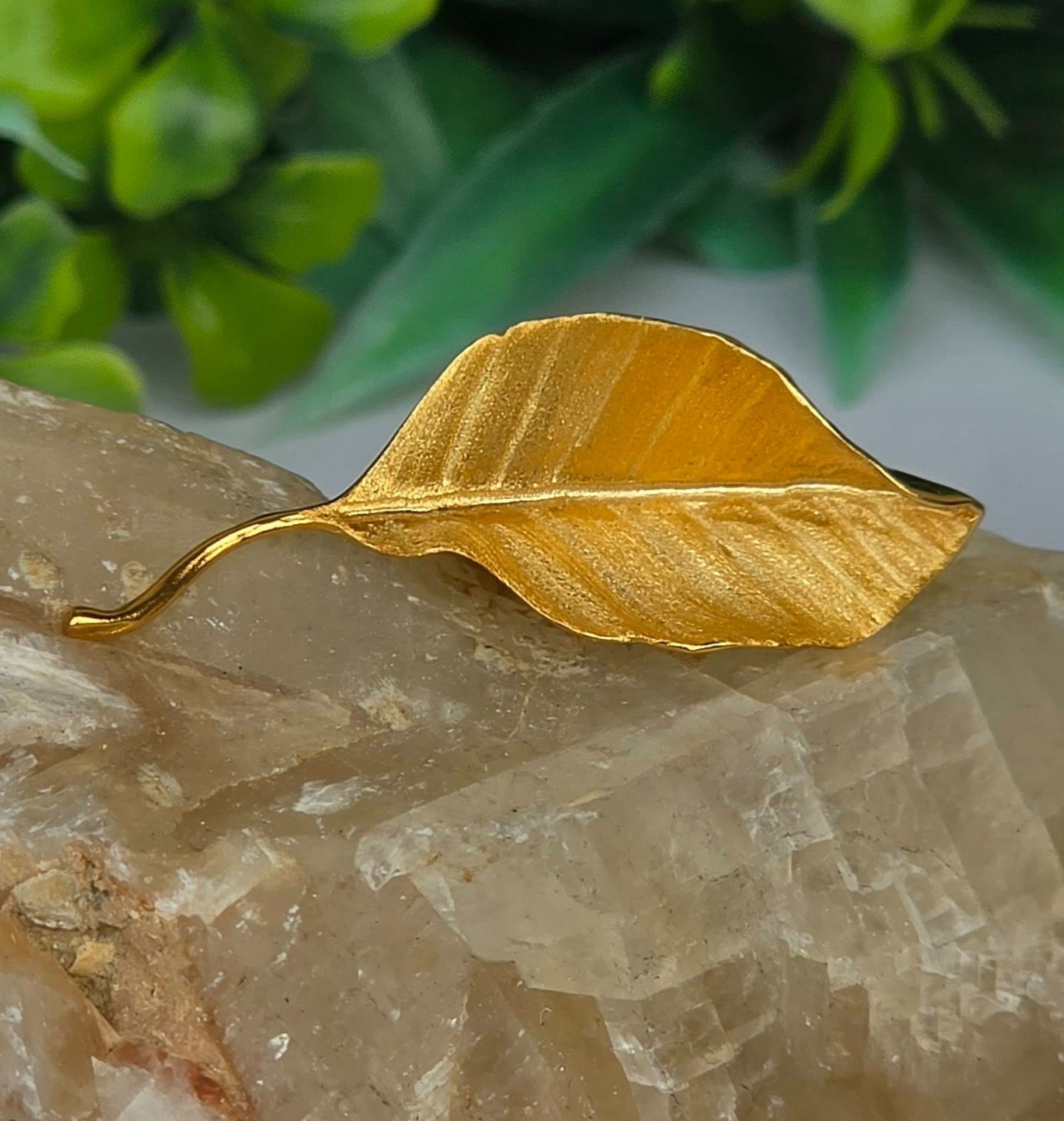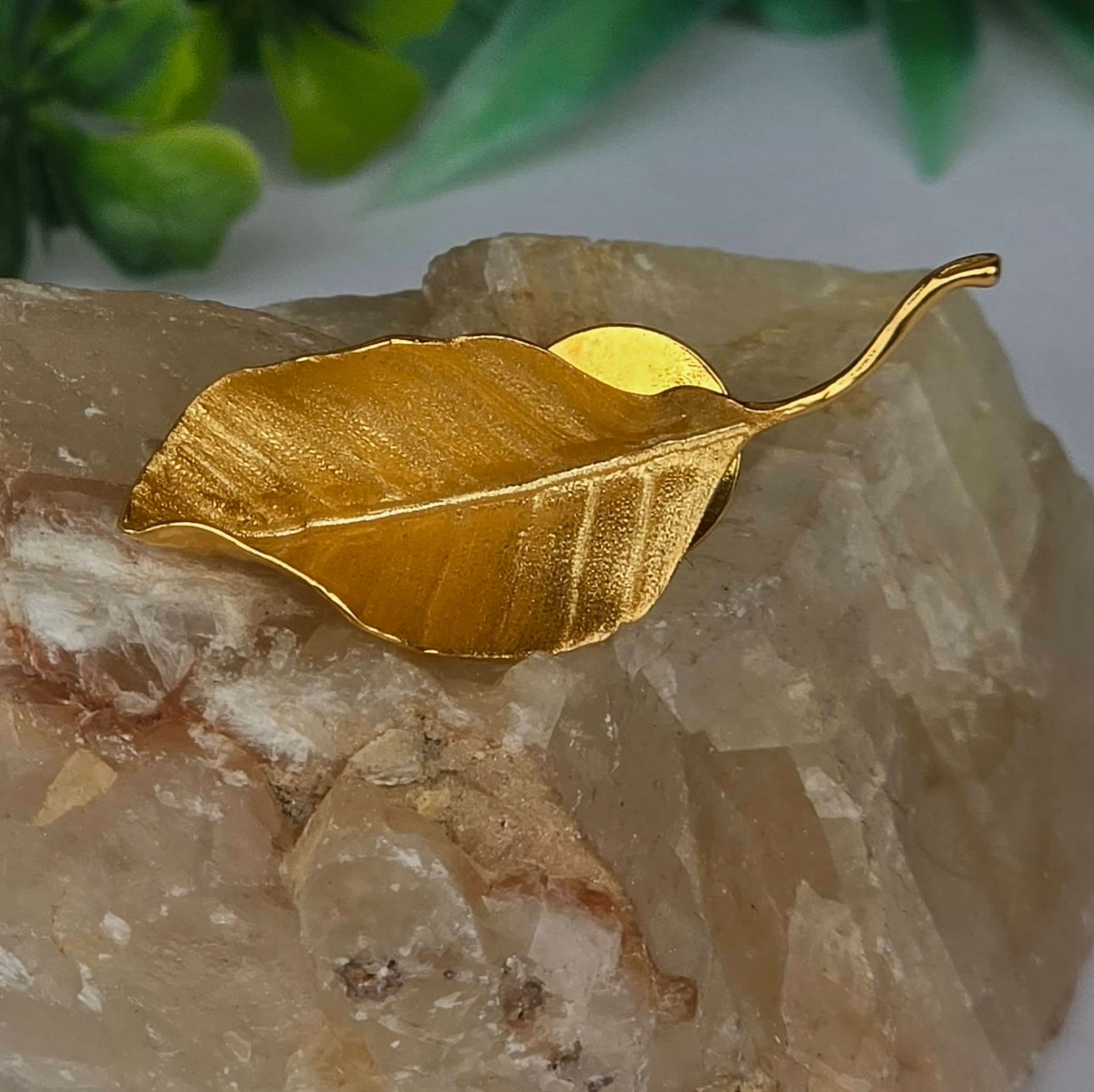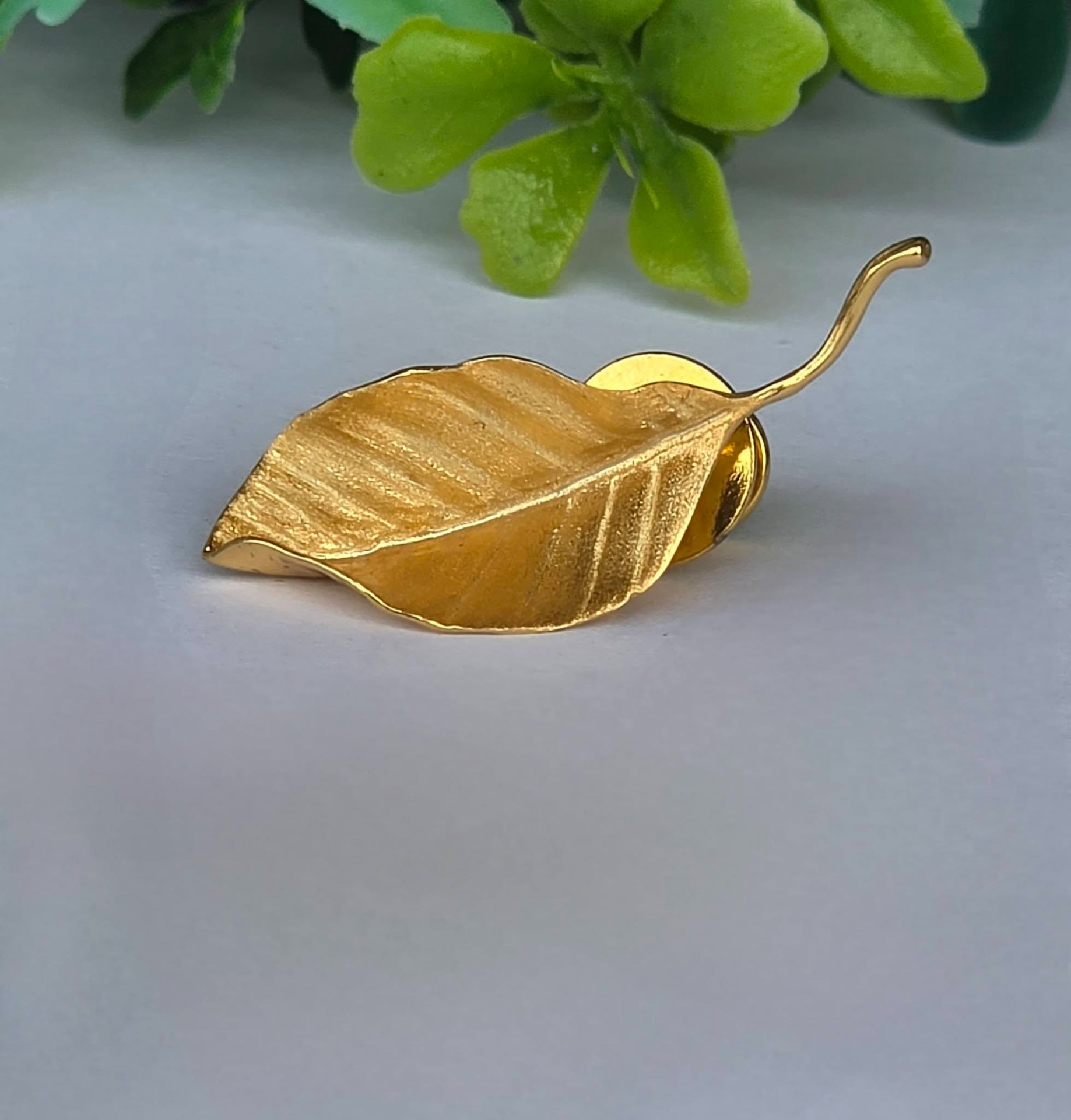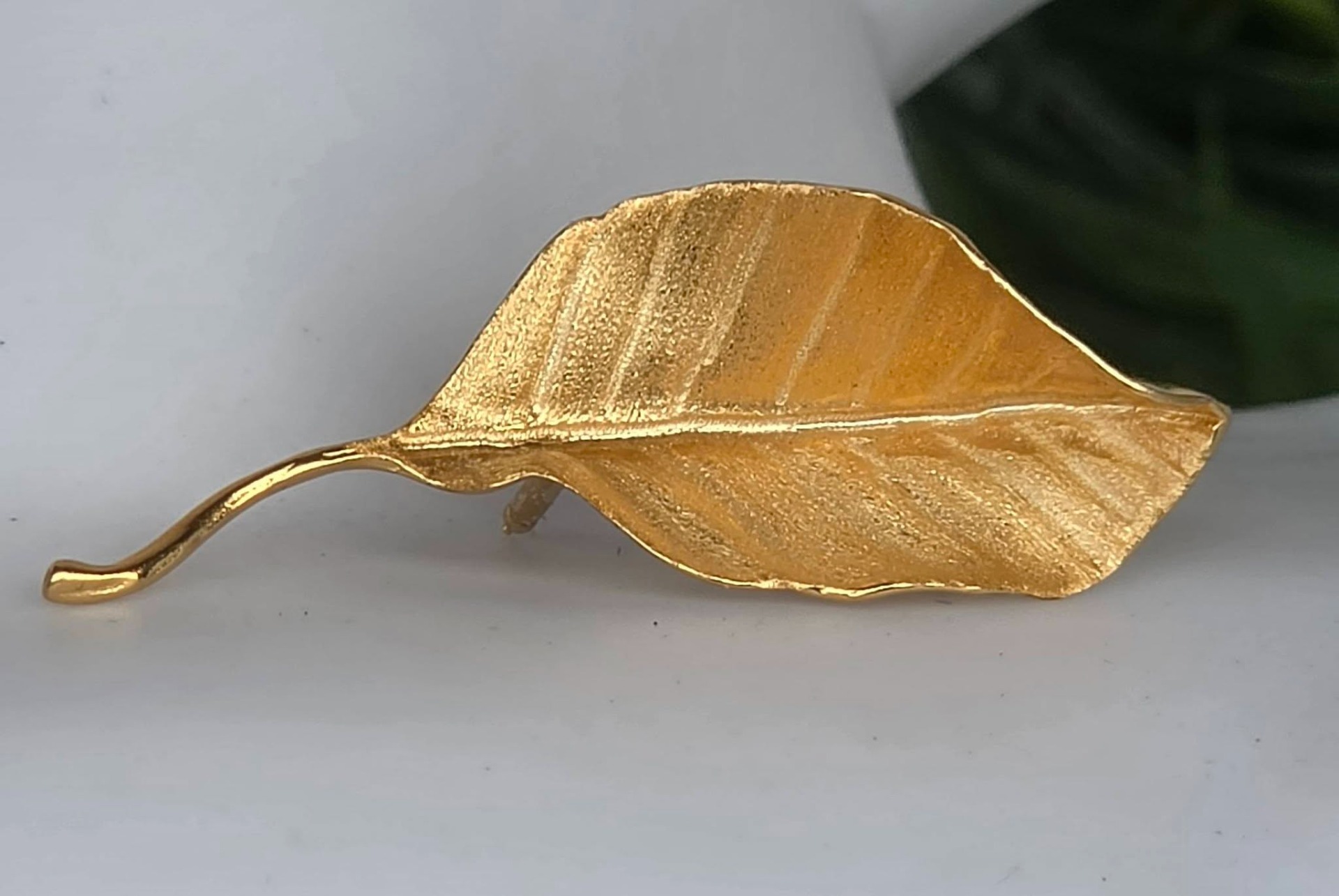 Ac de rever (broșă) contemporan superb, din argint placat cu un strat consistent de aur (vermeil), cu design organic tridimensional, stilizat sub forma unei frunze, cu șurub de prindere din metal aurit.