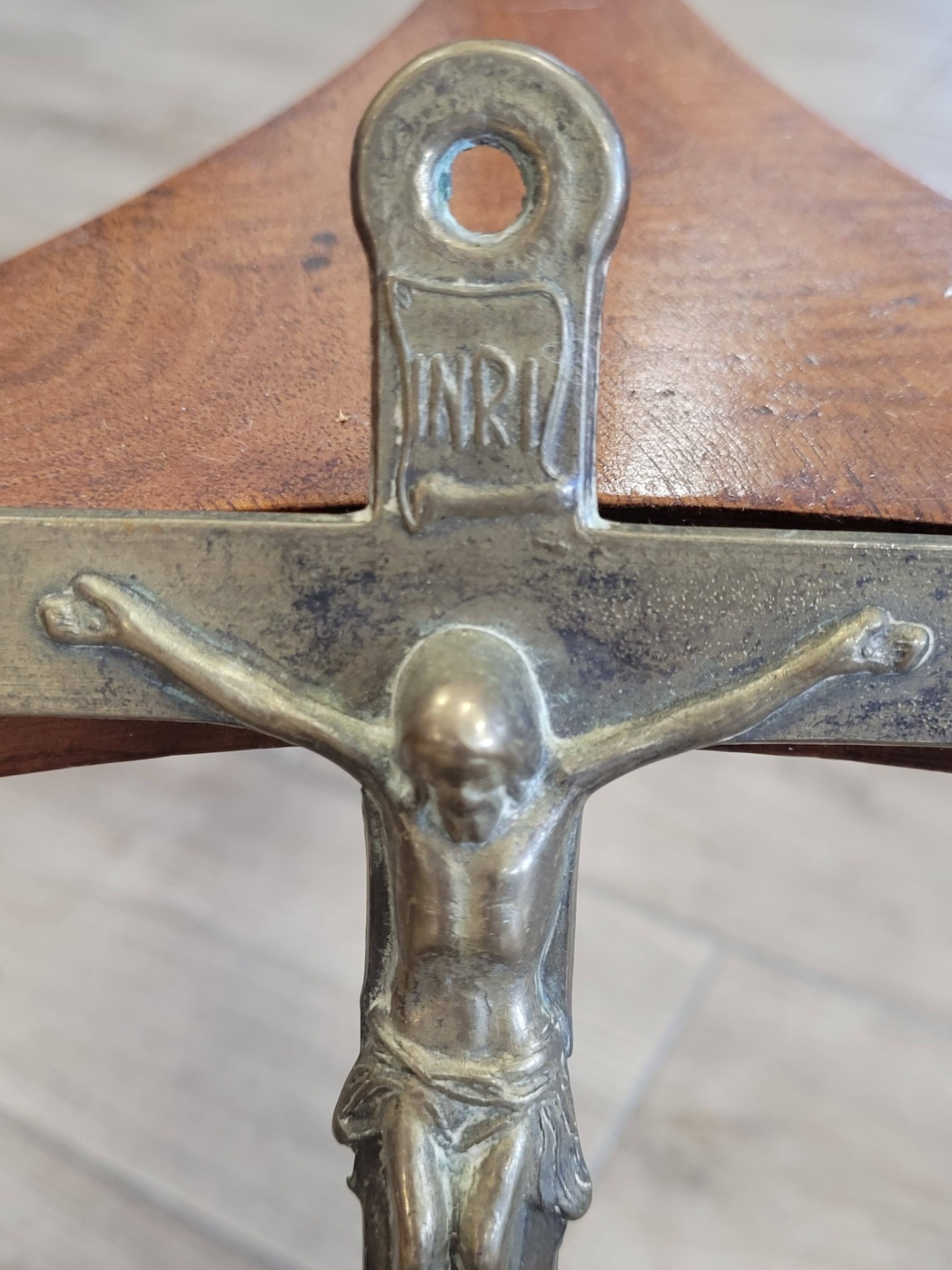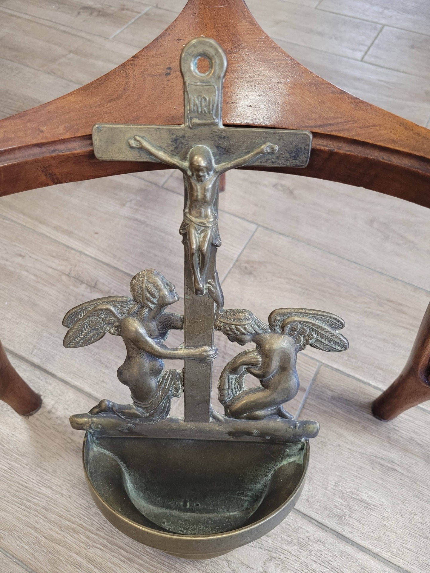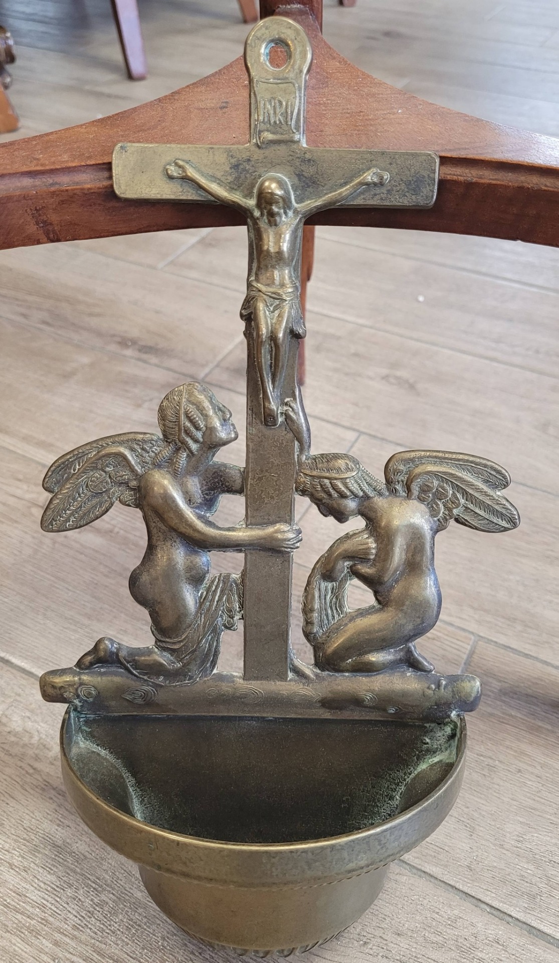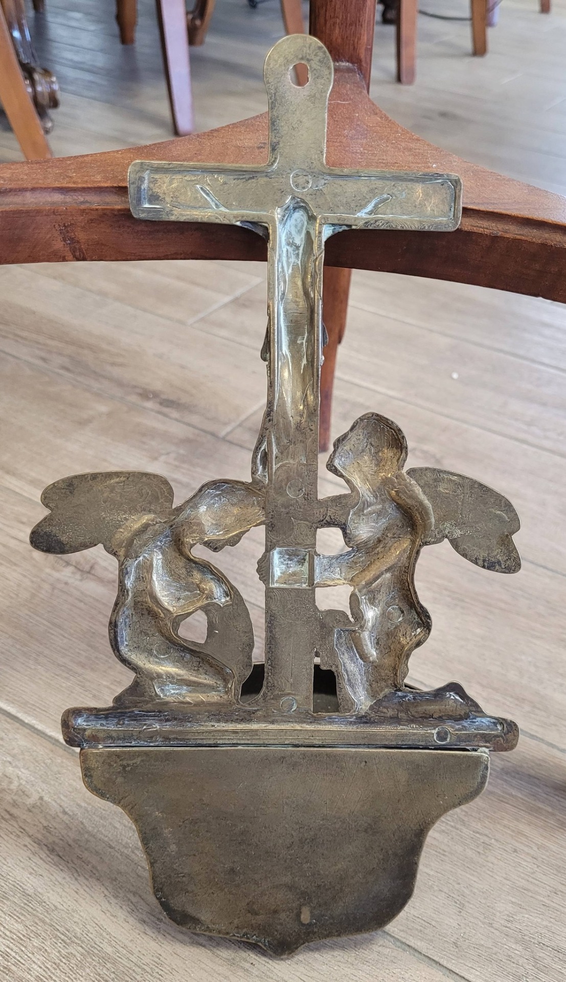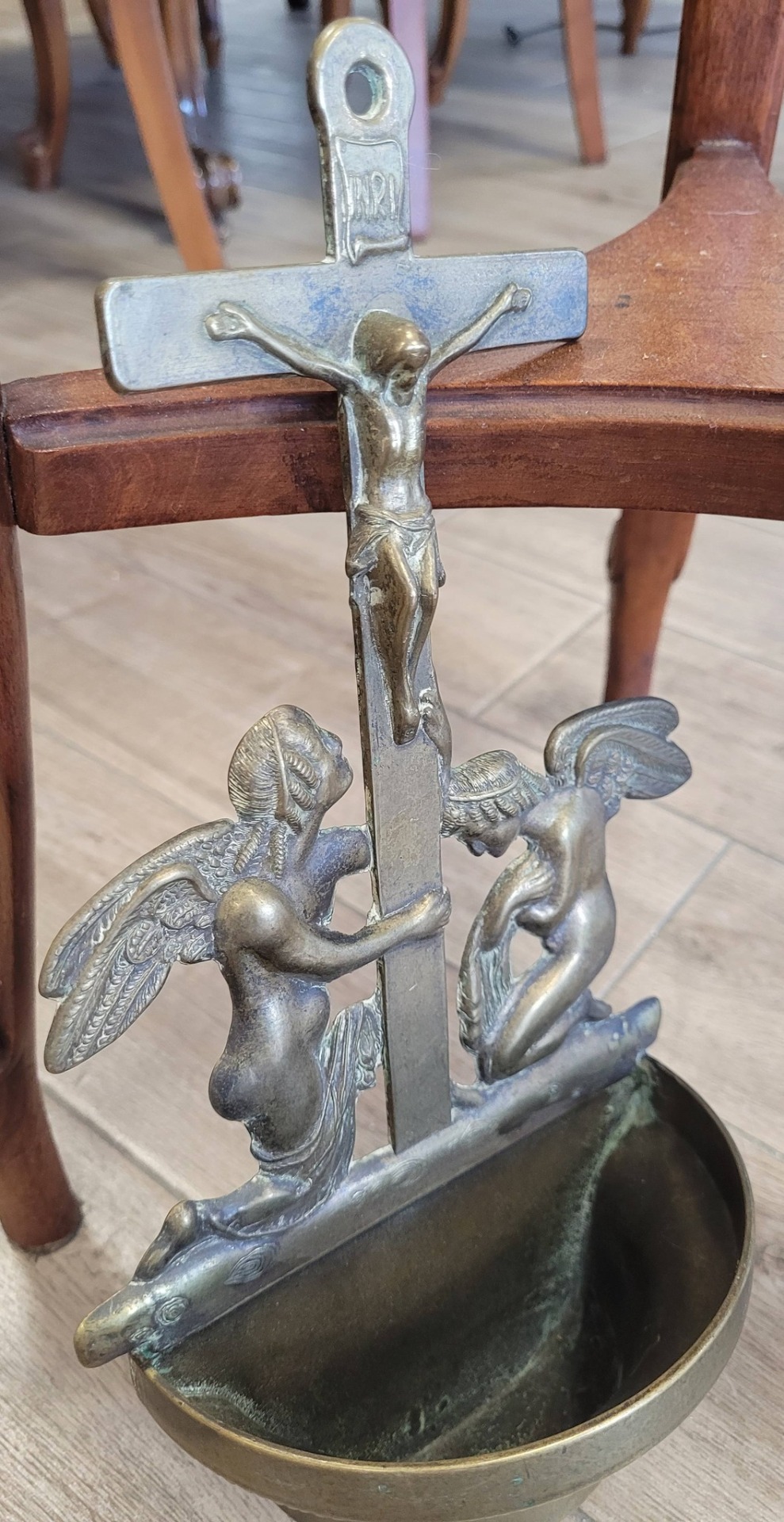 Agheasmatar (recipient pentru apa sfințită) vechi, de perete, din bronz, decorat cu Crucifix cu Îngeri, de colecție (sf.sec.XIX).