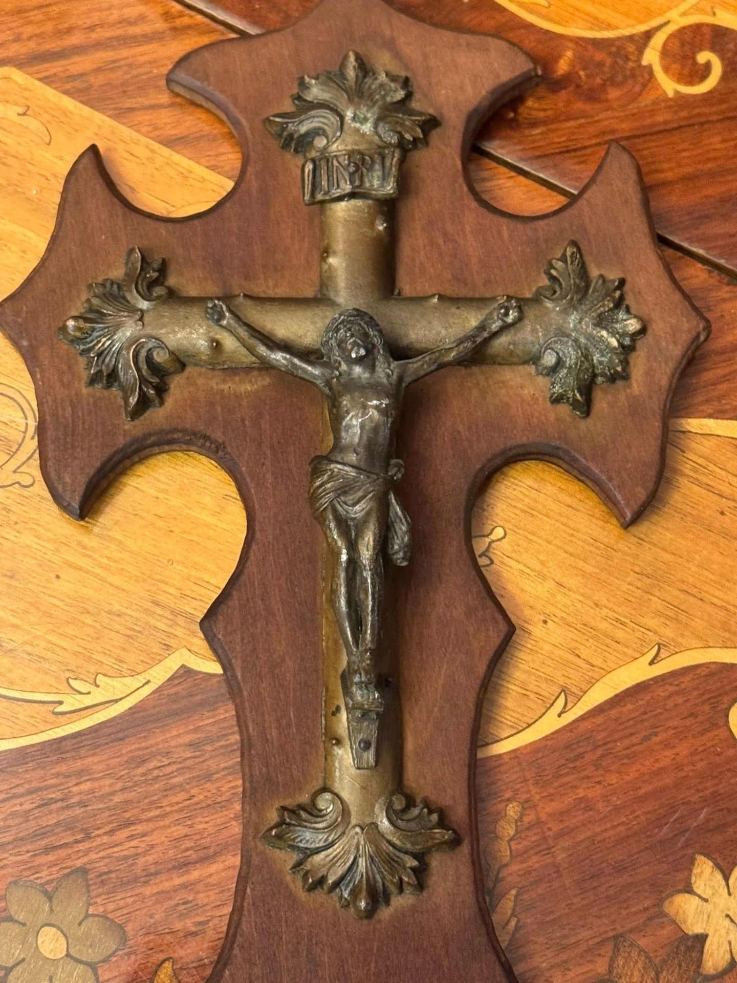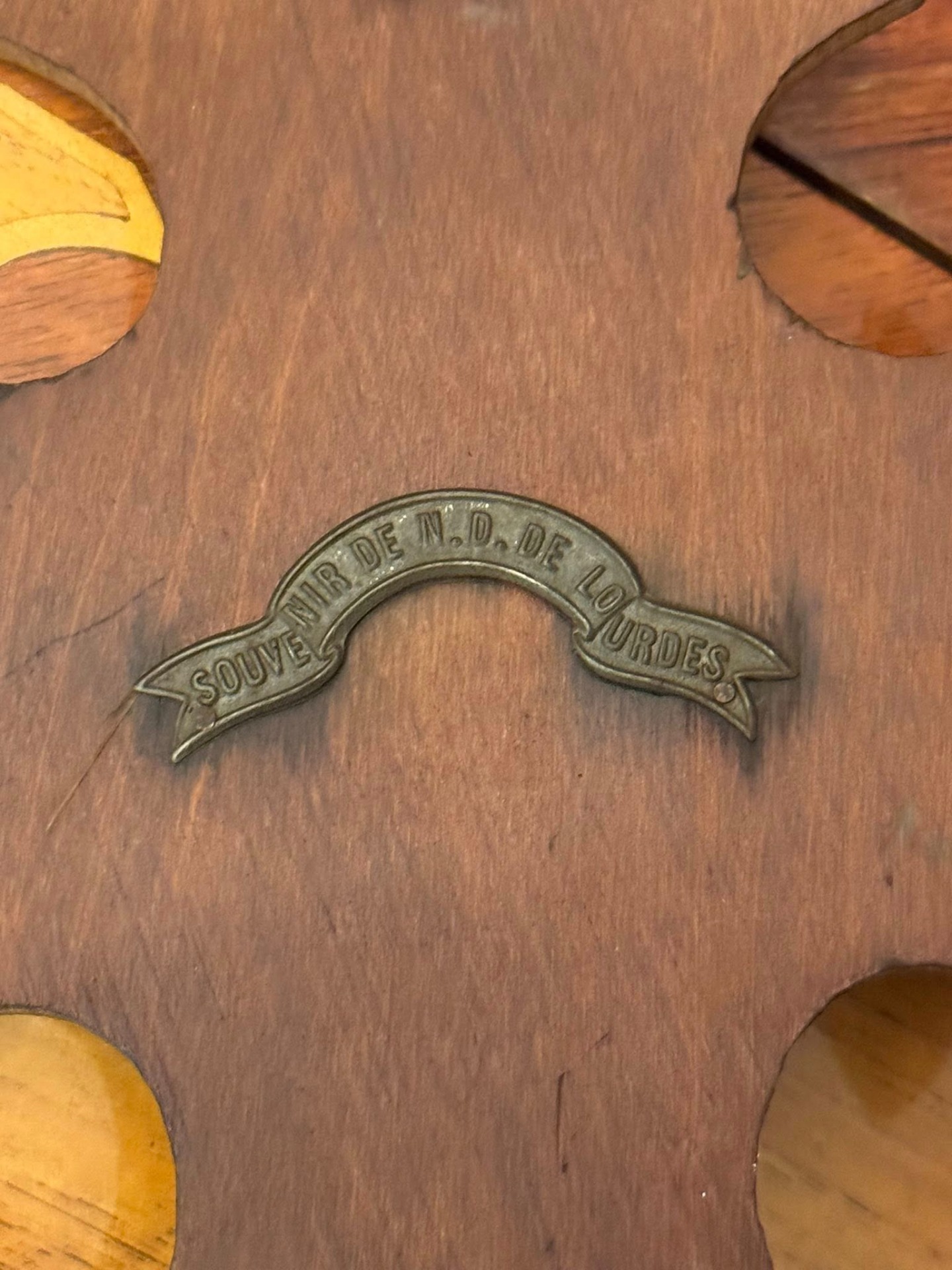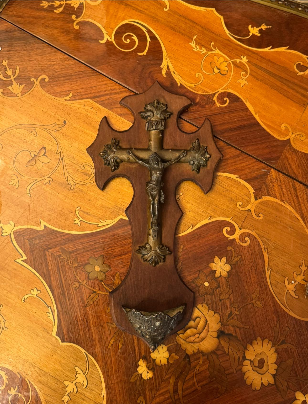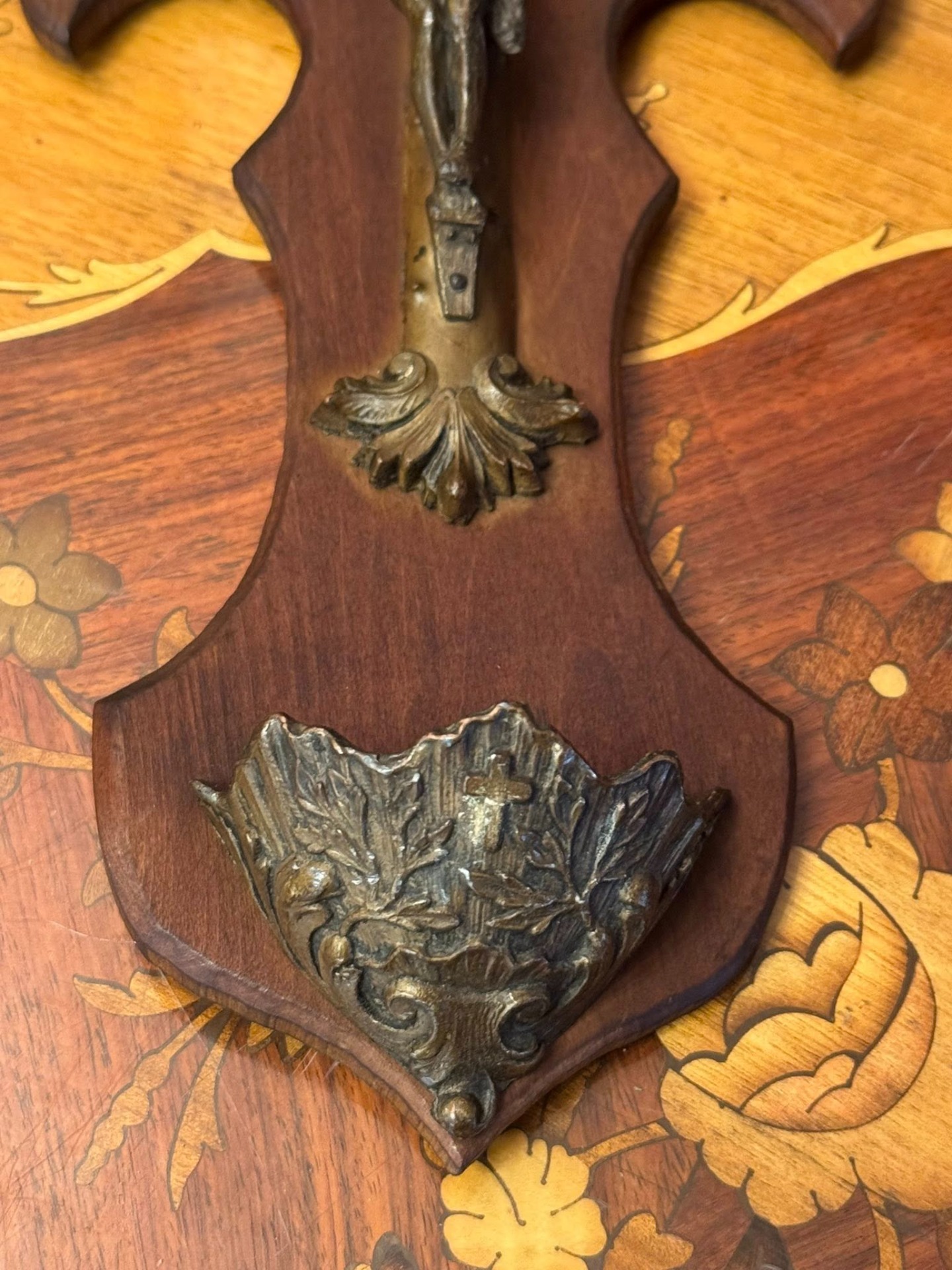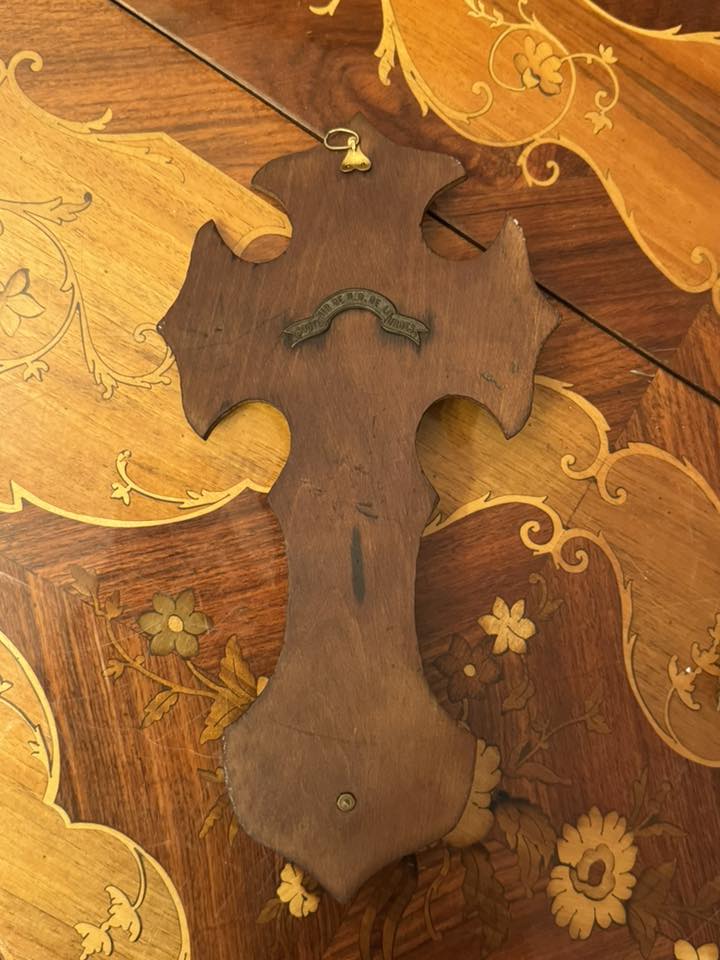 Aghiasmatar de perete realizat pe un suport de lemn sculptat în formă de cruce treflată, pe care este montat un crucifix.(Lourdes, Franța-1920)