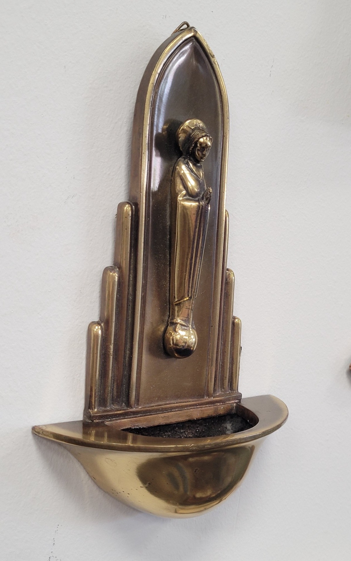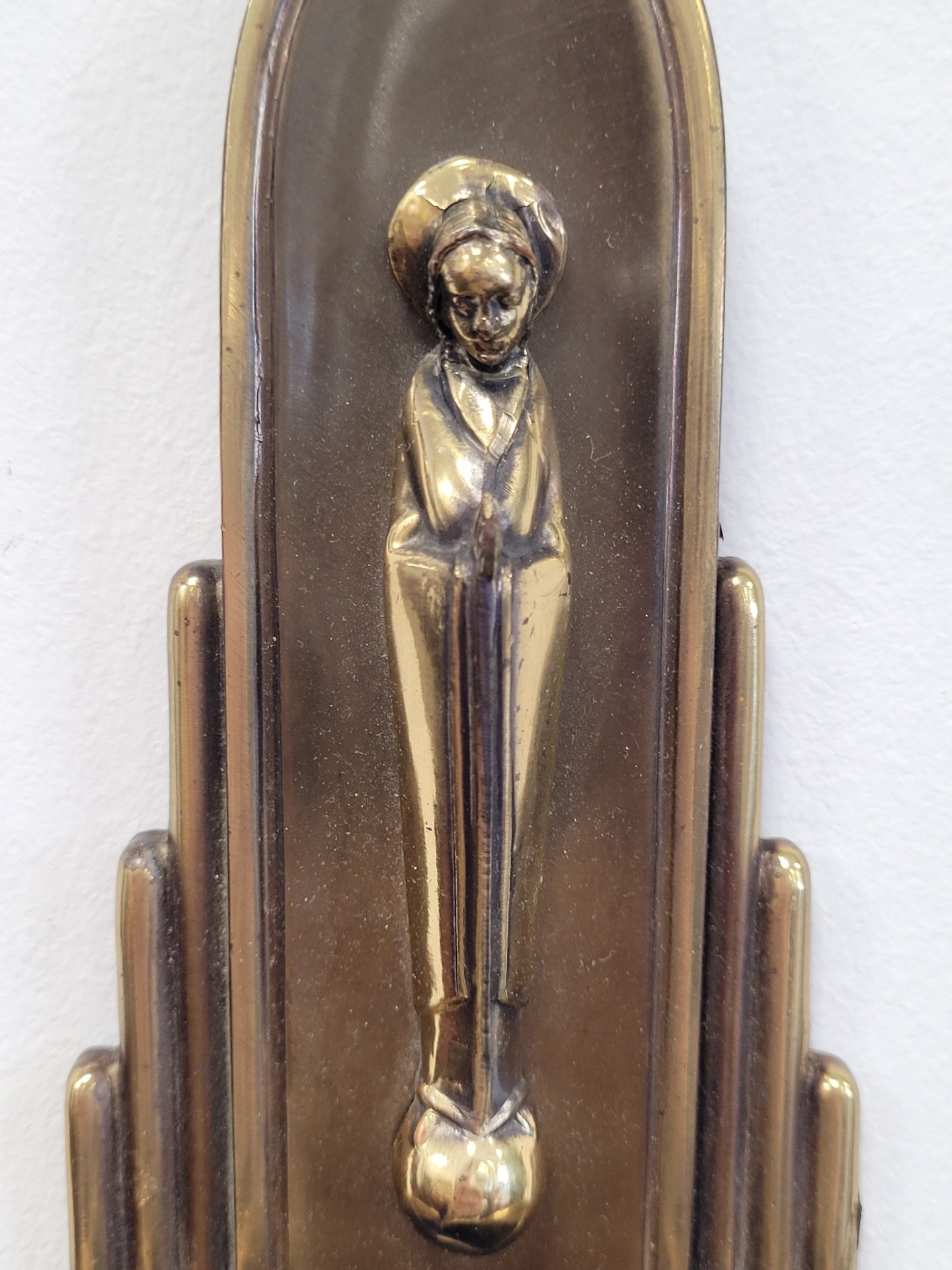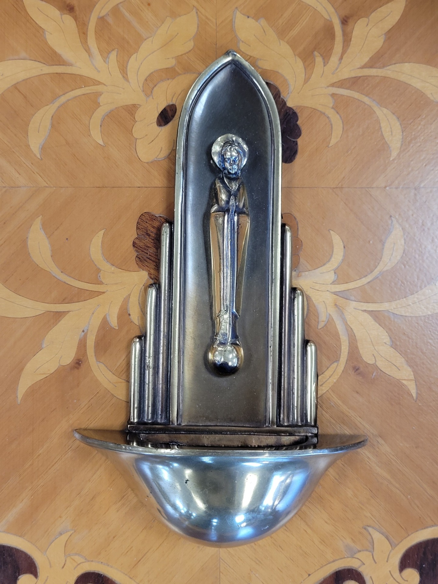 Aghiasmatar de perete,vintage, Art Deco, din bronz, reprezentare Fecioara Maria.