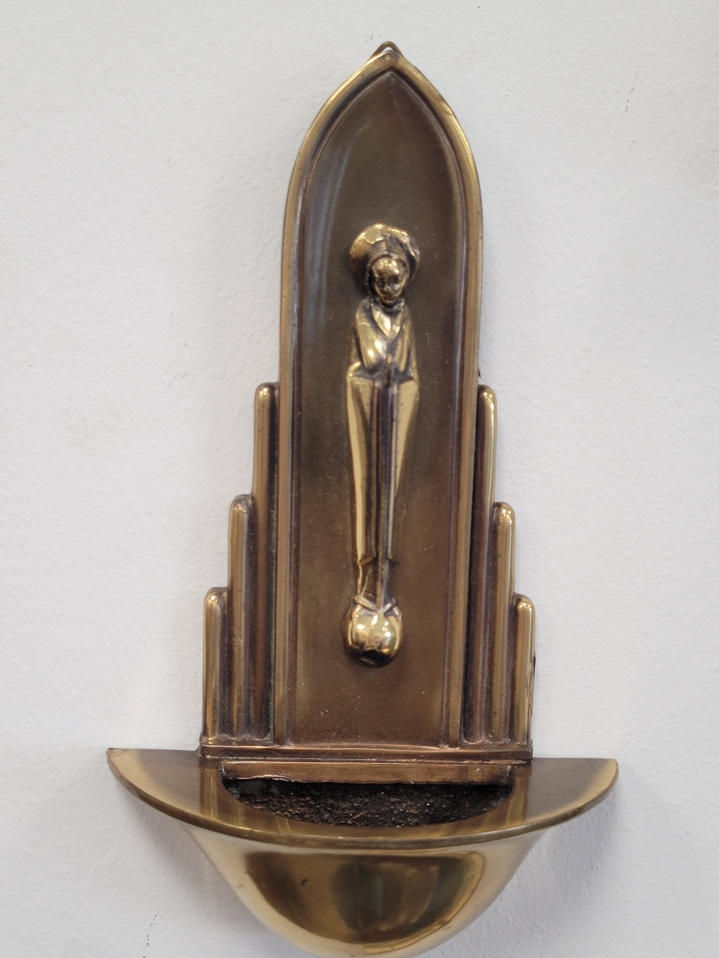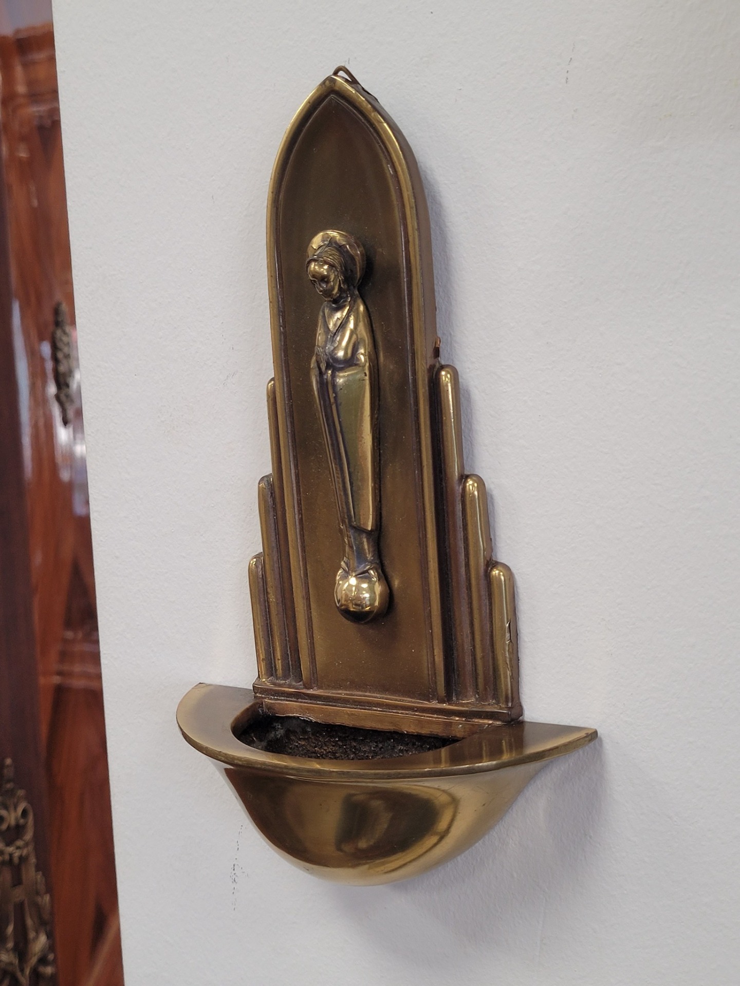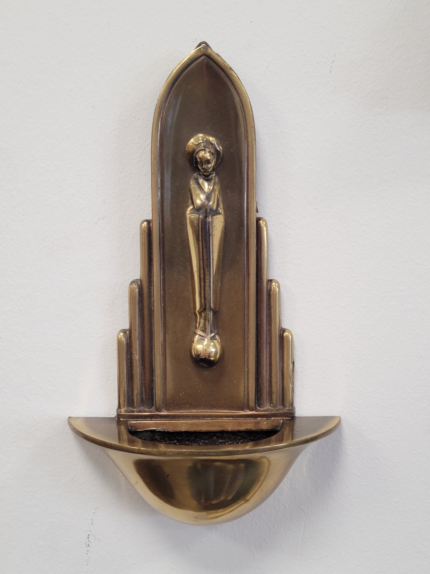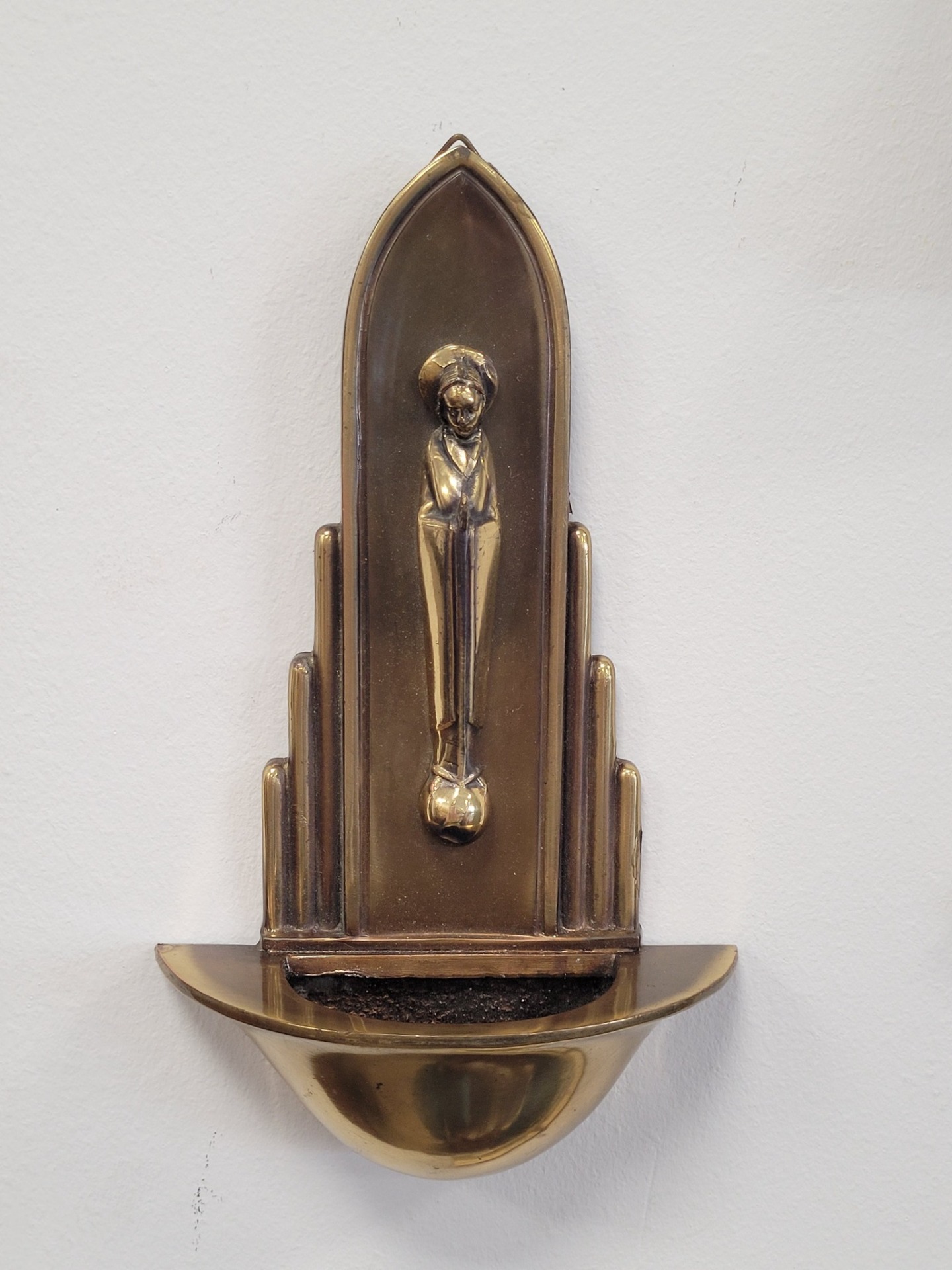 Aghiasmatar de perete,vintage, Art Deco, din bronz, reprezentare Fecioara Maria.