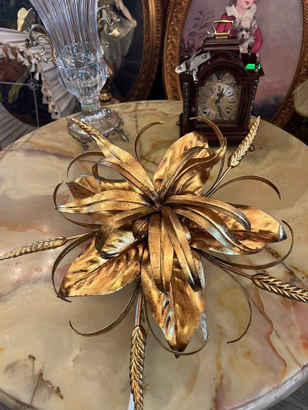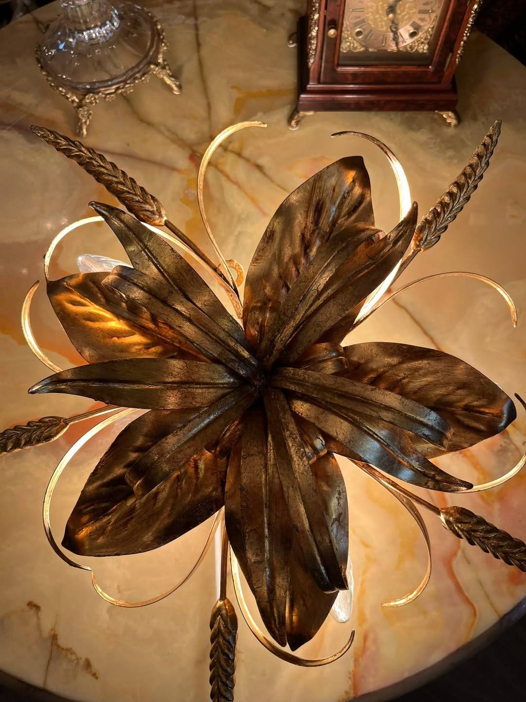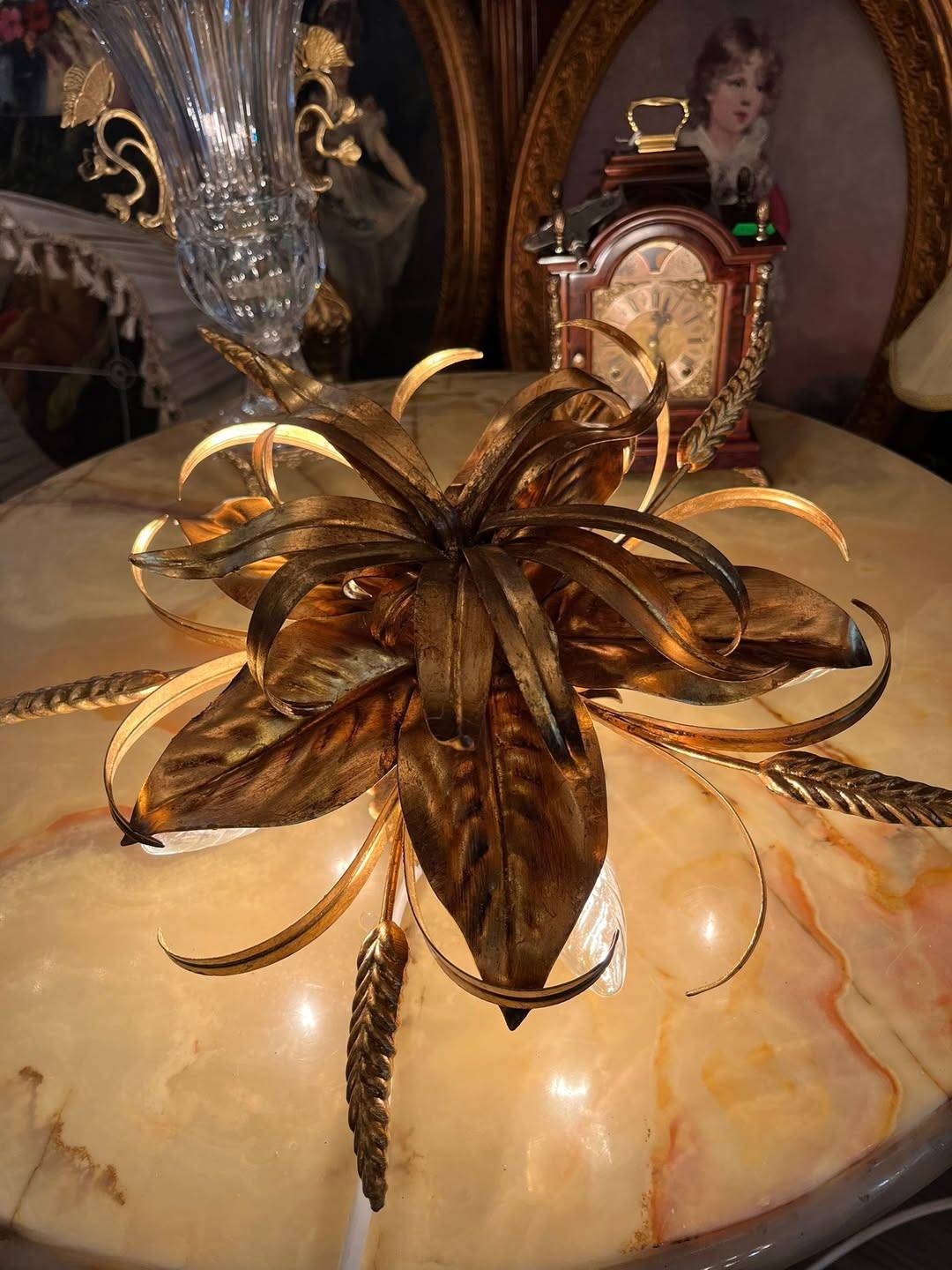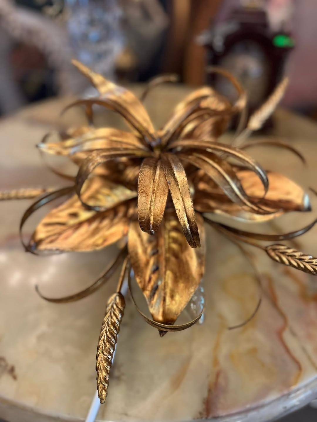 Aplică decorativă deosebită, realizată din metal cu finisaj auriu patinat, în formă de floare elegantă cu frunze și elemente decorative. Piesa este prevăzută cu 5 becuri și oferă o lumină caldă, plăcută, fiind atât un corp de iluminat, cât și un element decorativ de efect.