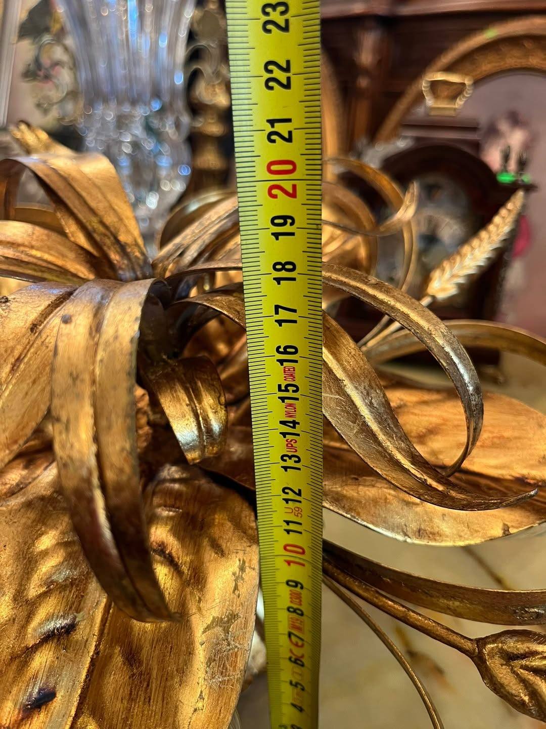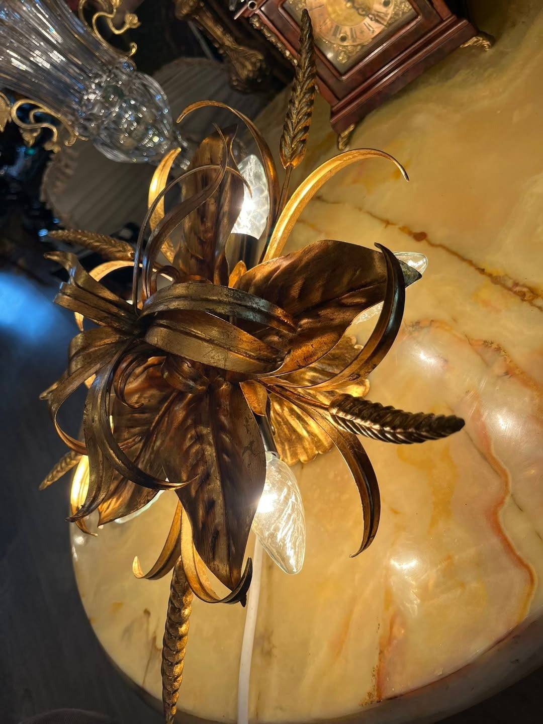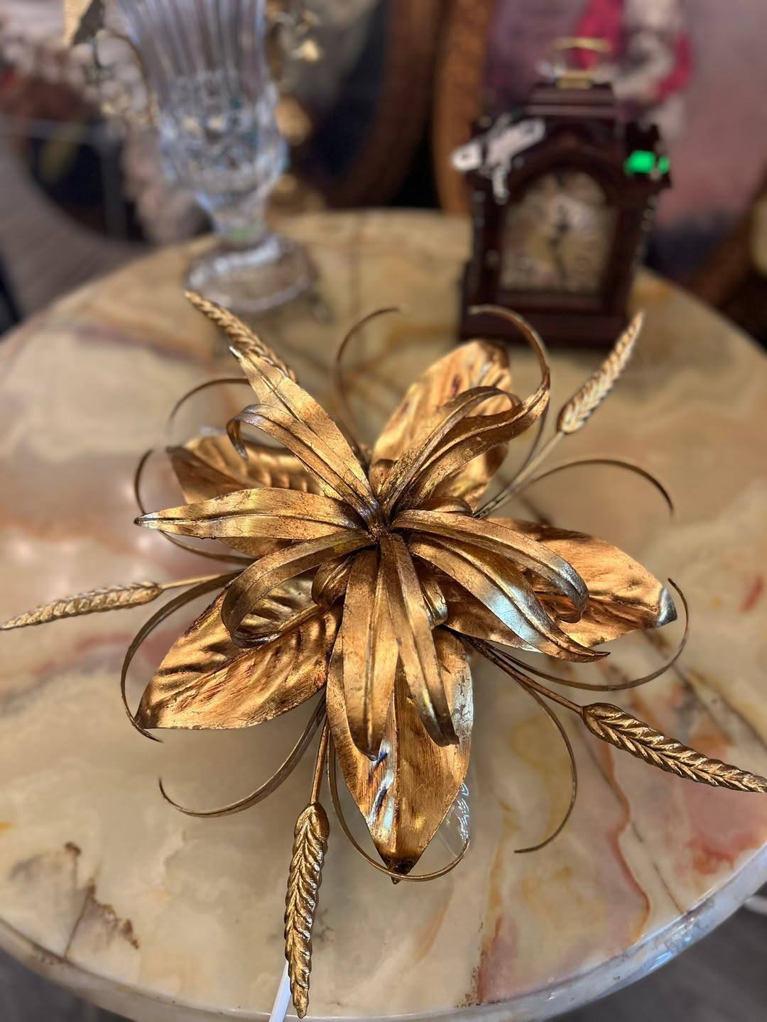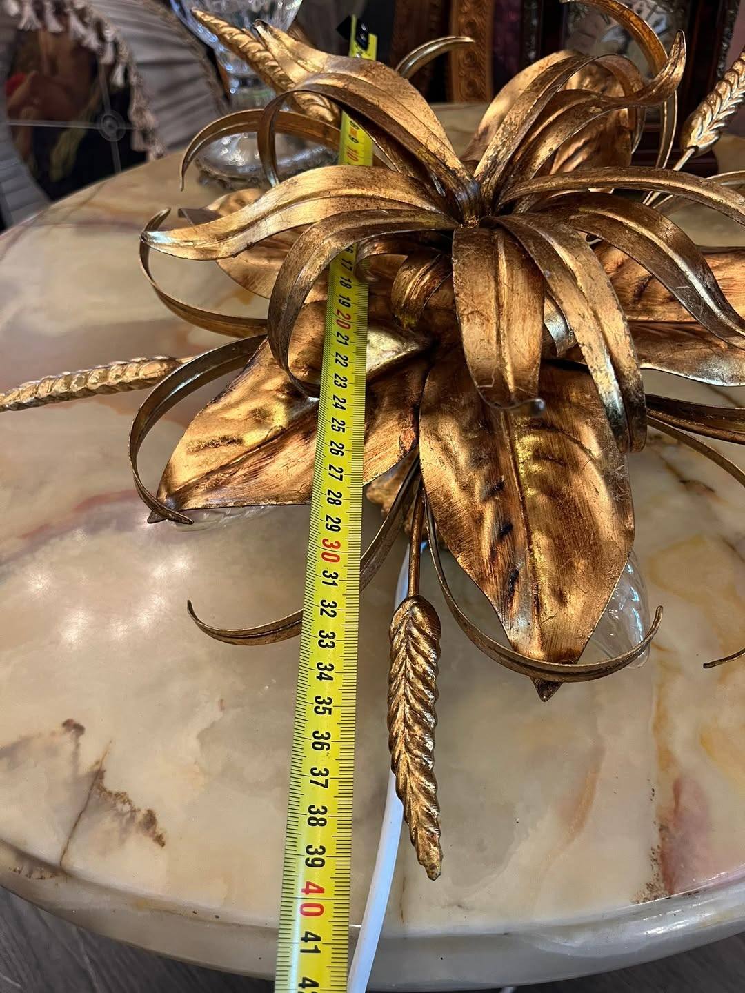 Aplică decorativă deosebită, realizată din metal cu finisaj auriu patinat, în formă de floare elegantă cu frunze și elemente decorative. Piesa este prevăzută cu 5 becuri și oferă o lumină caldă, plăcută, fiind atât un corp de iluminat, cât și un element decorativ de efect.