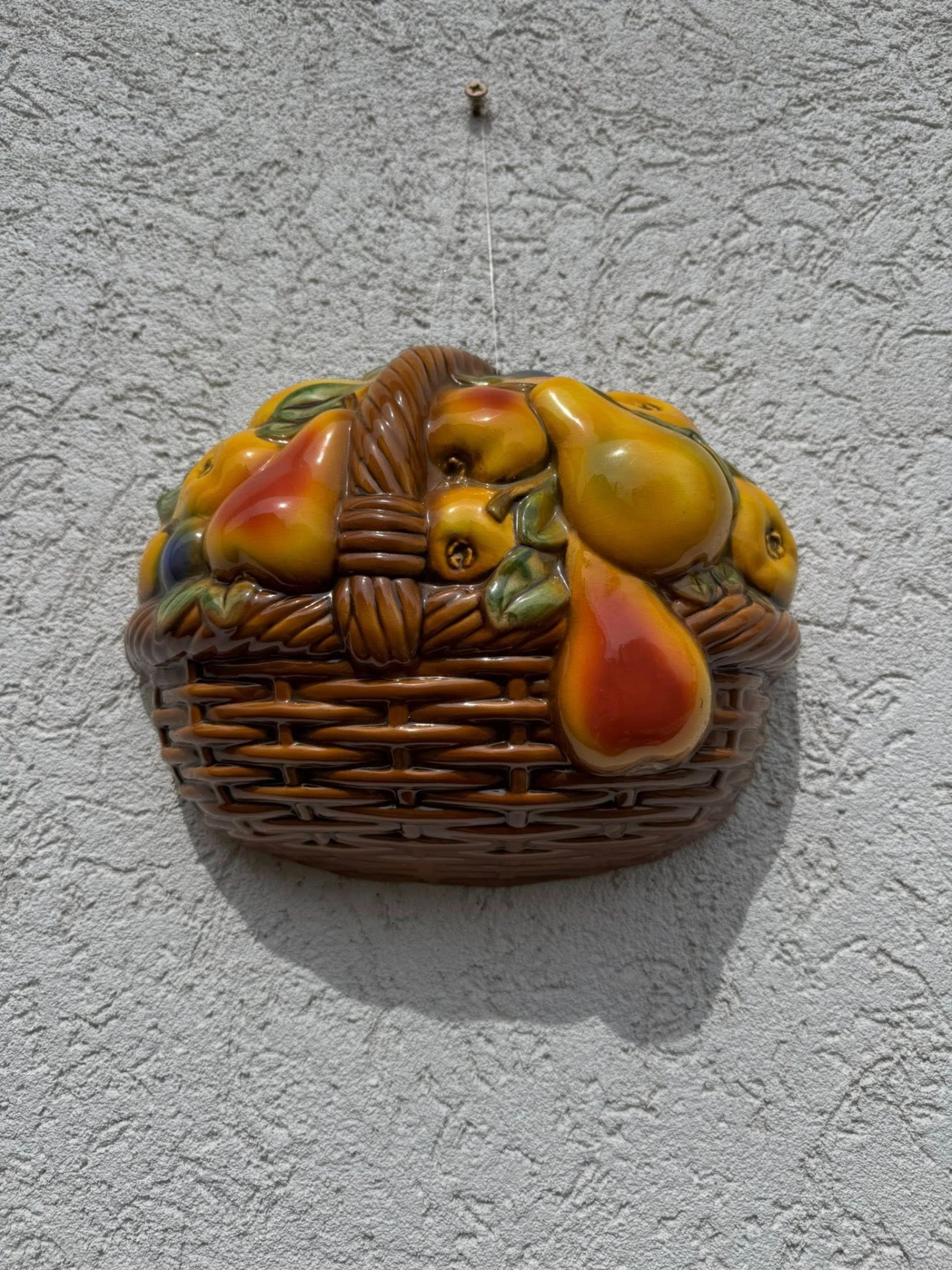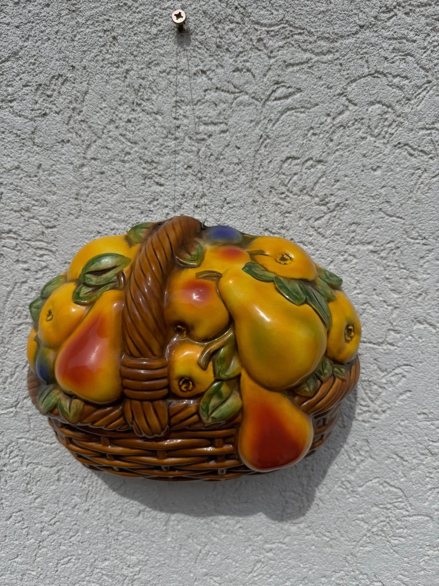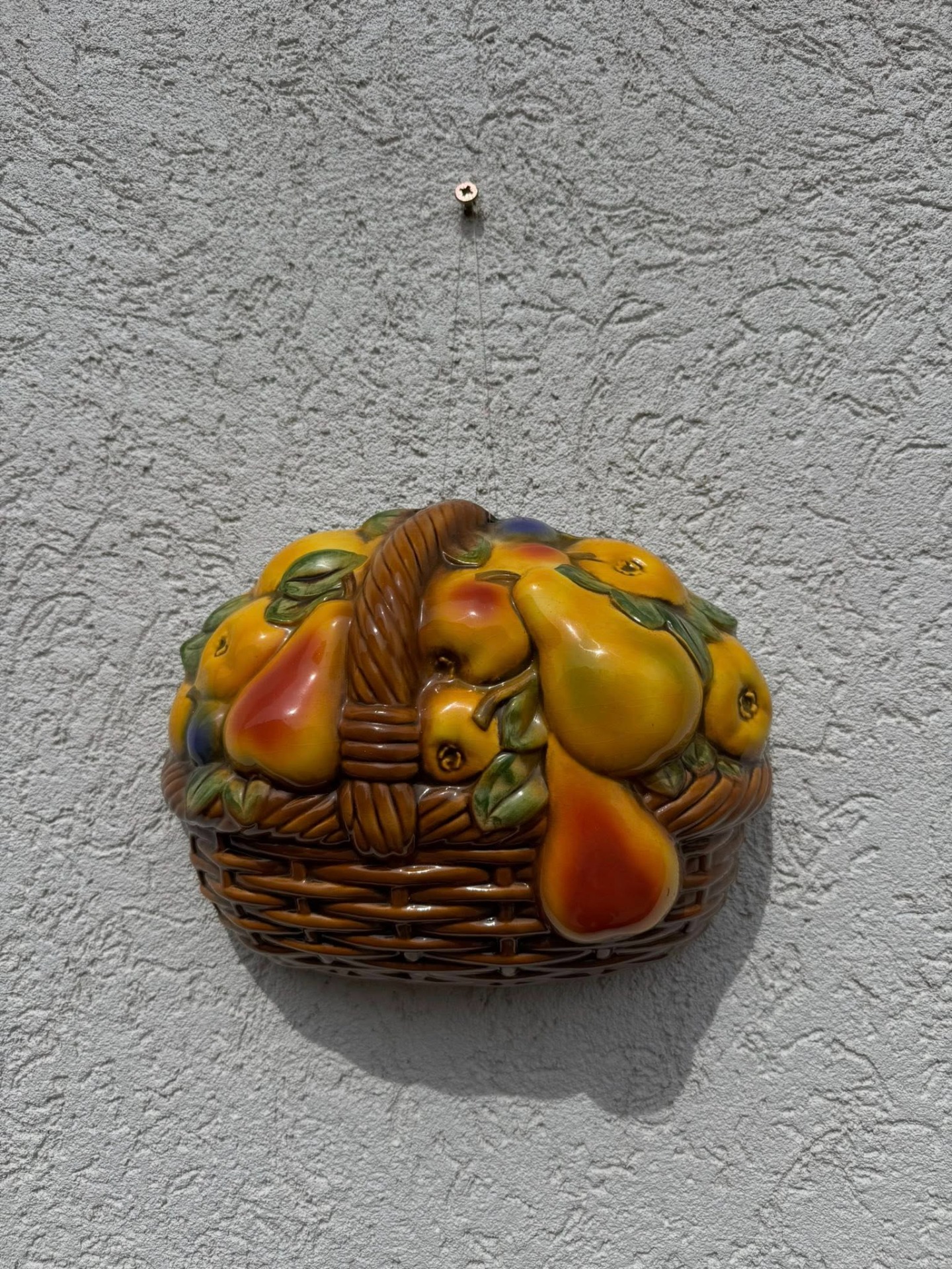 Aplicație decorativă de perete din porțelan, reprezentând un coș cu fructe,