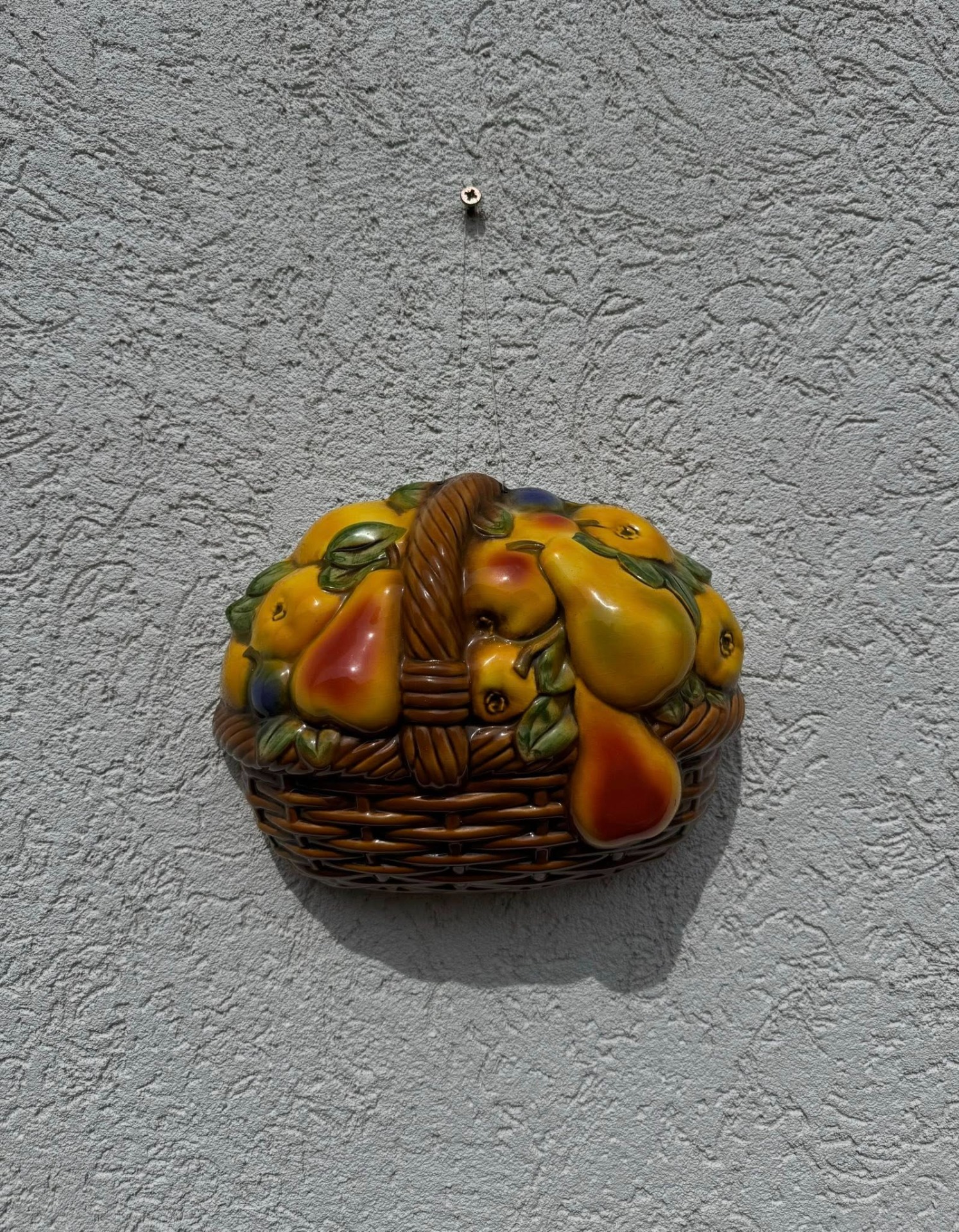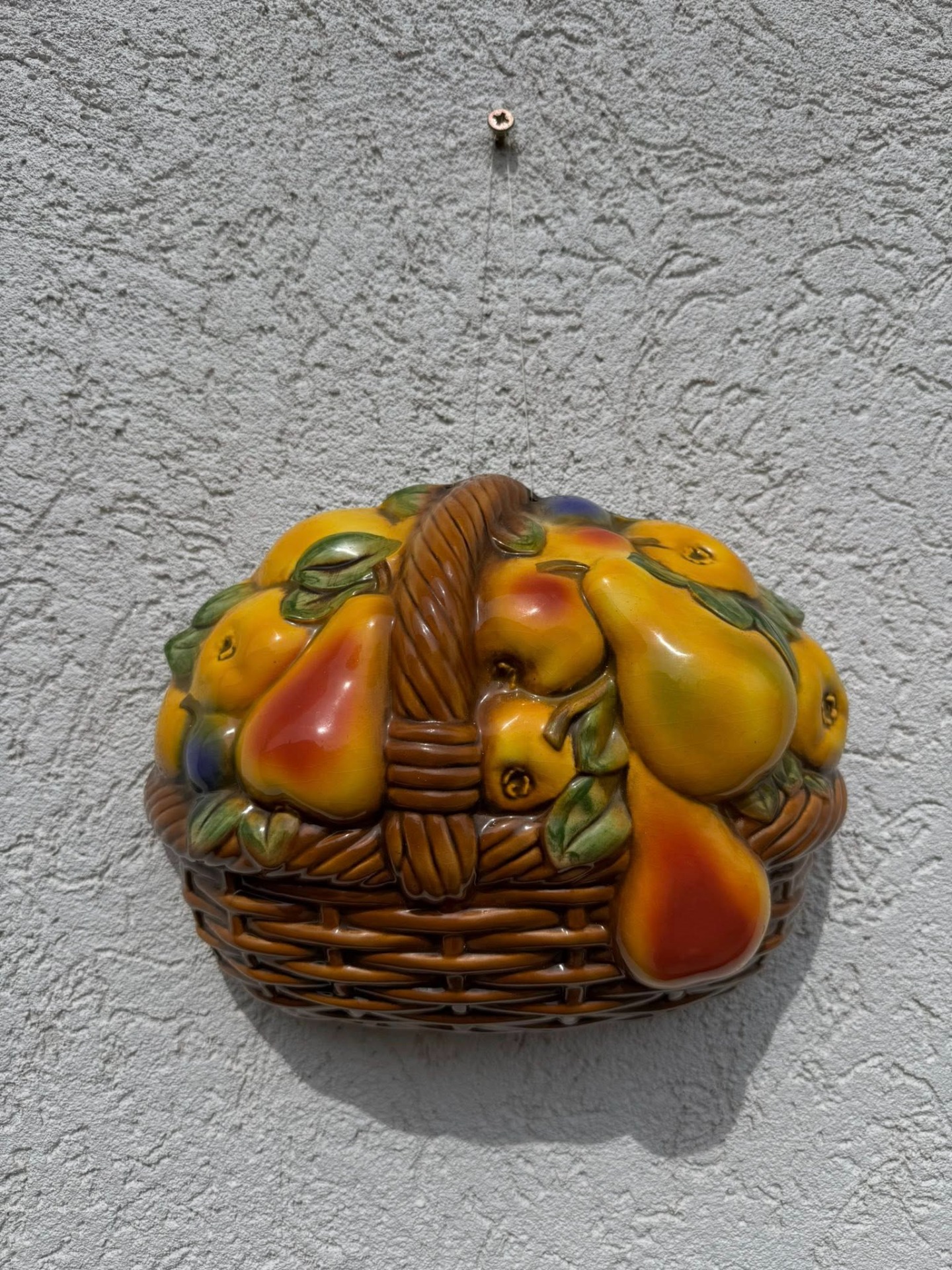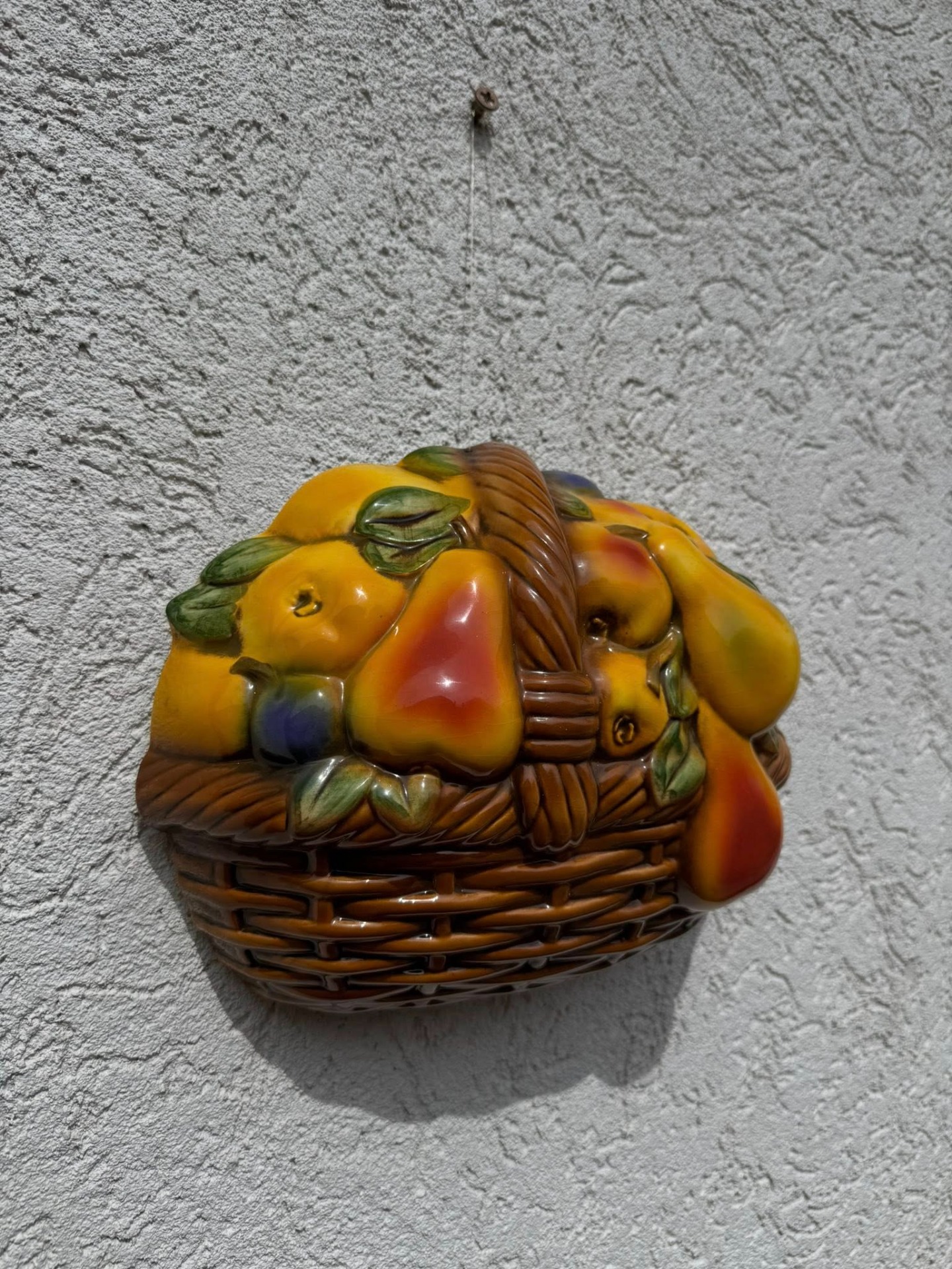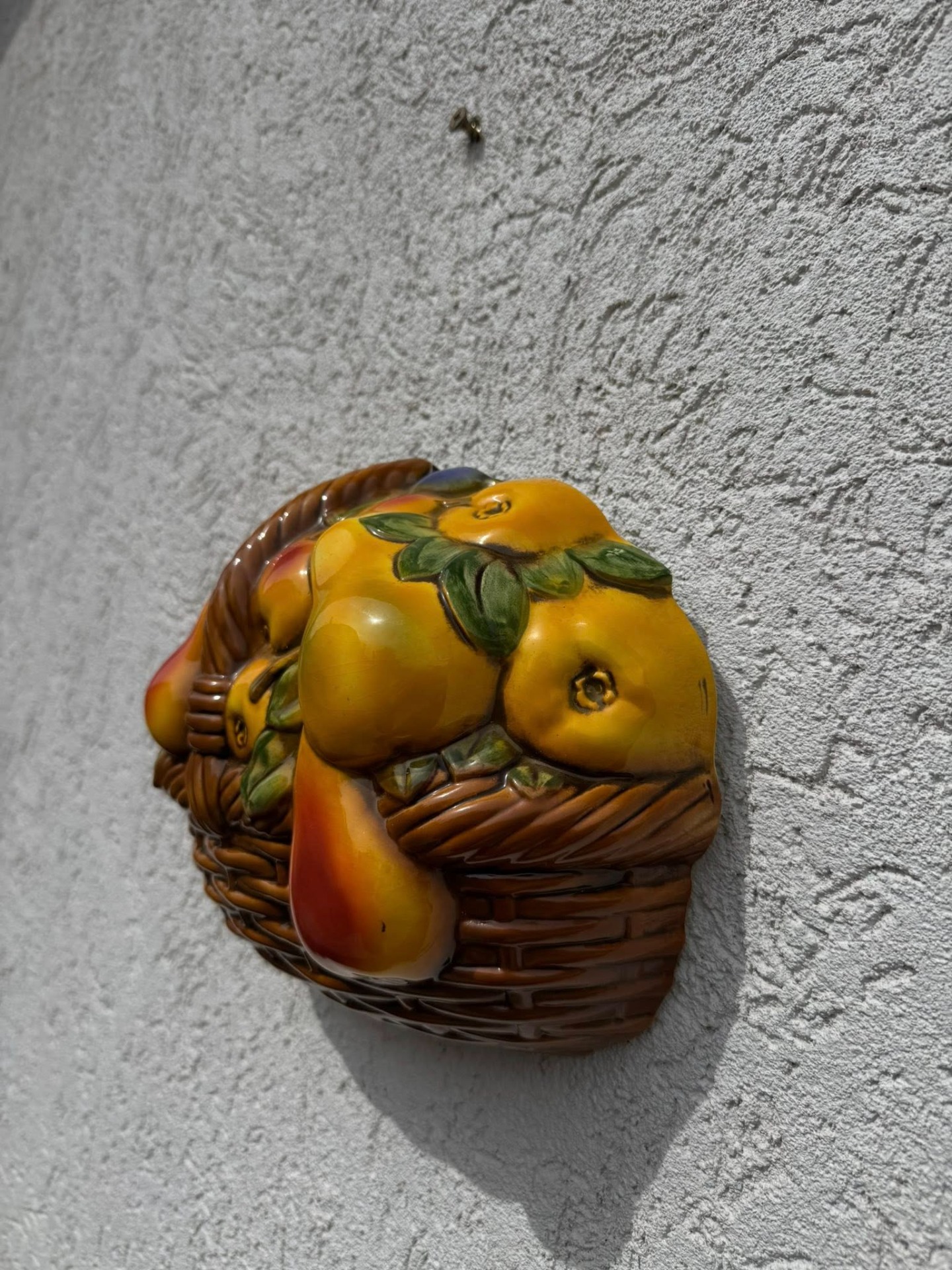 Aplicație decorativă de perete din porțelan, reprezentând un coș cu fructe,