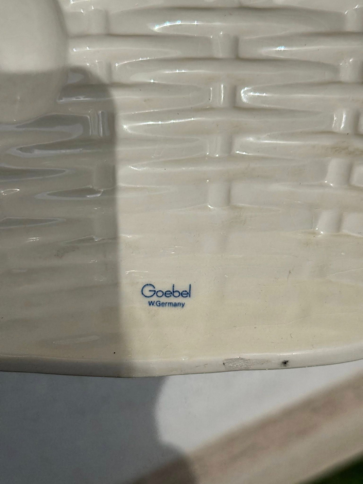 Aplicație decorativă de perete din porțelan, reprezentând un coș cu fructe, realizată de renumitul producător german Goebel.