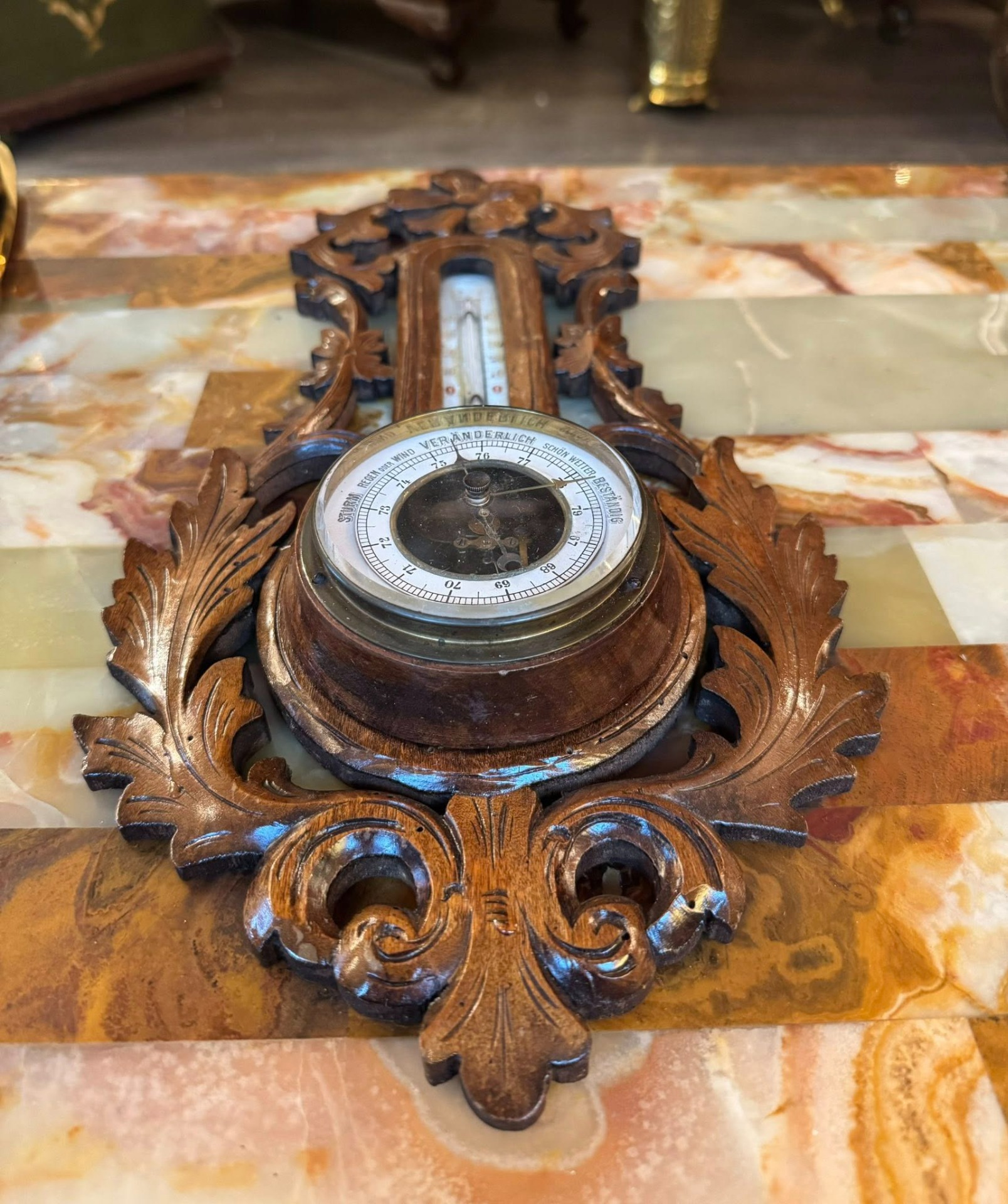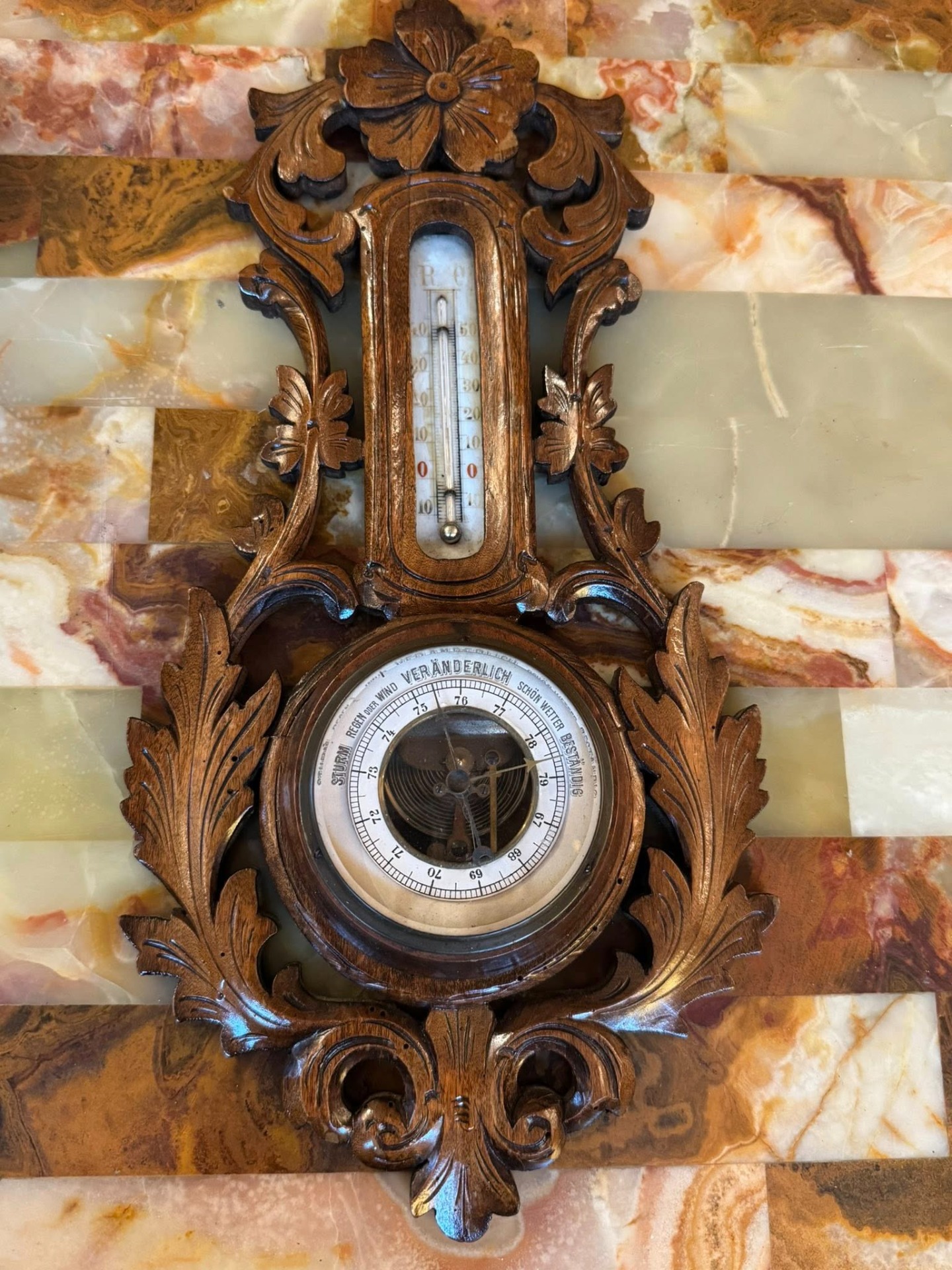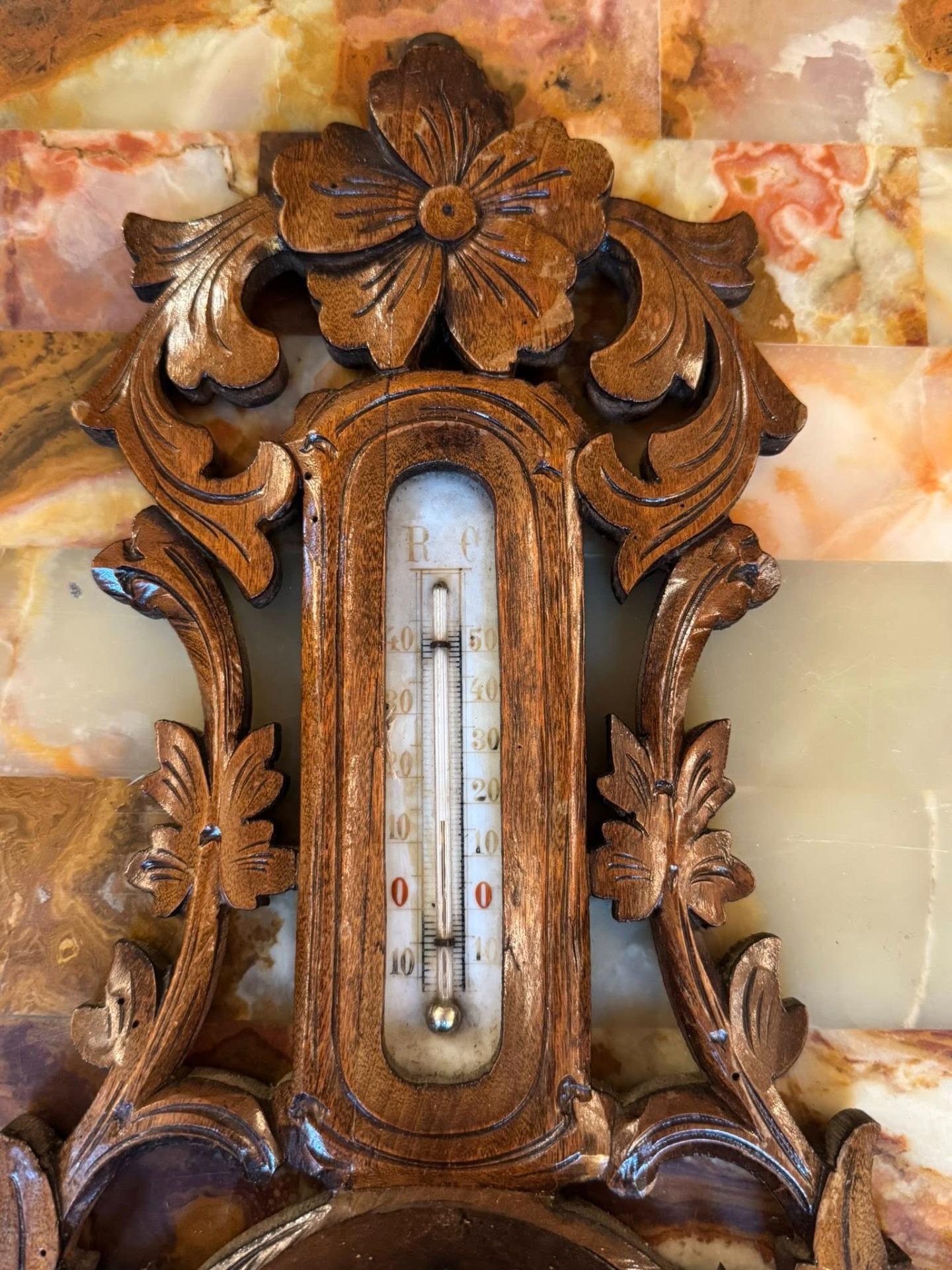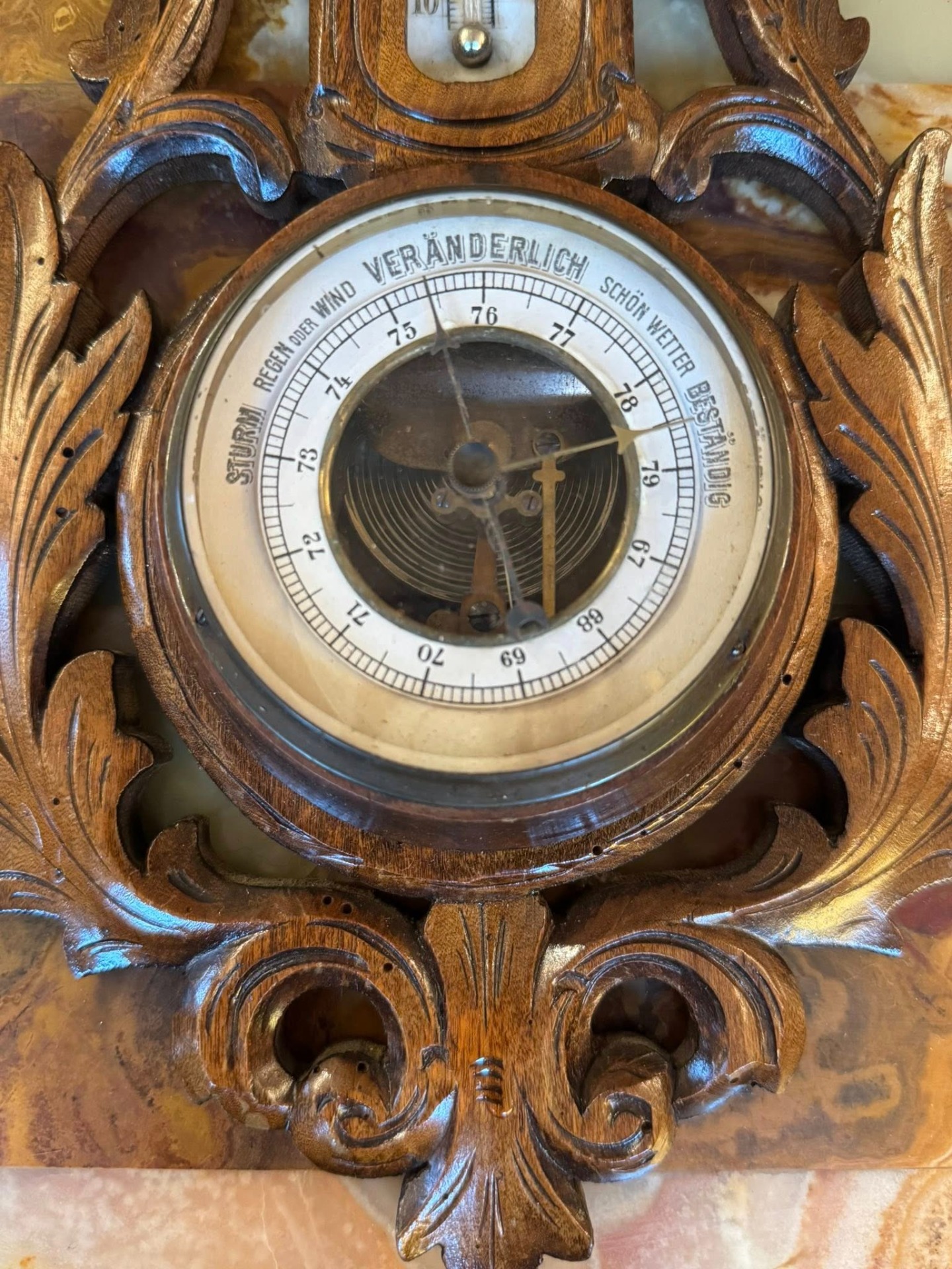 Barometru din lemn cu termometru, în stilul Neobaroc (cca 1900)
