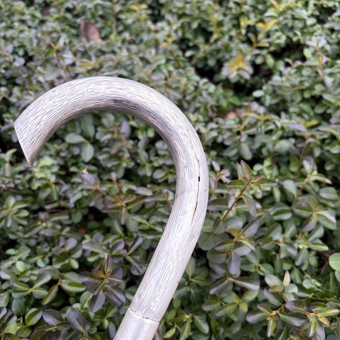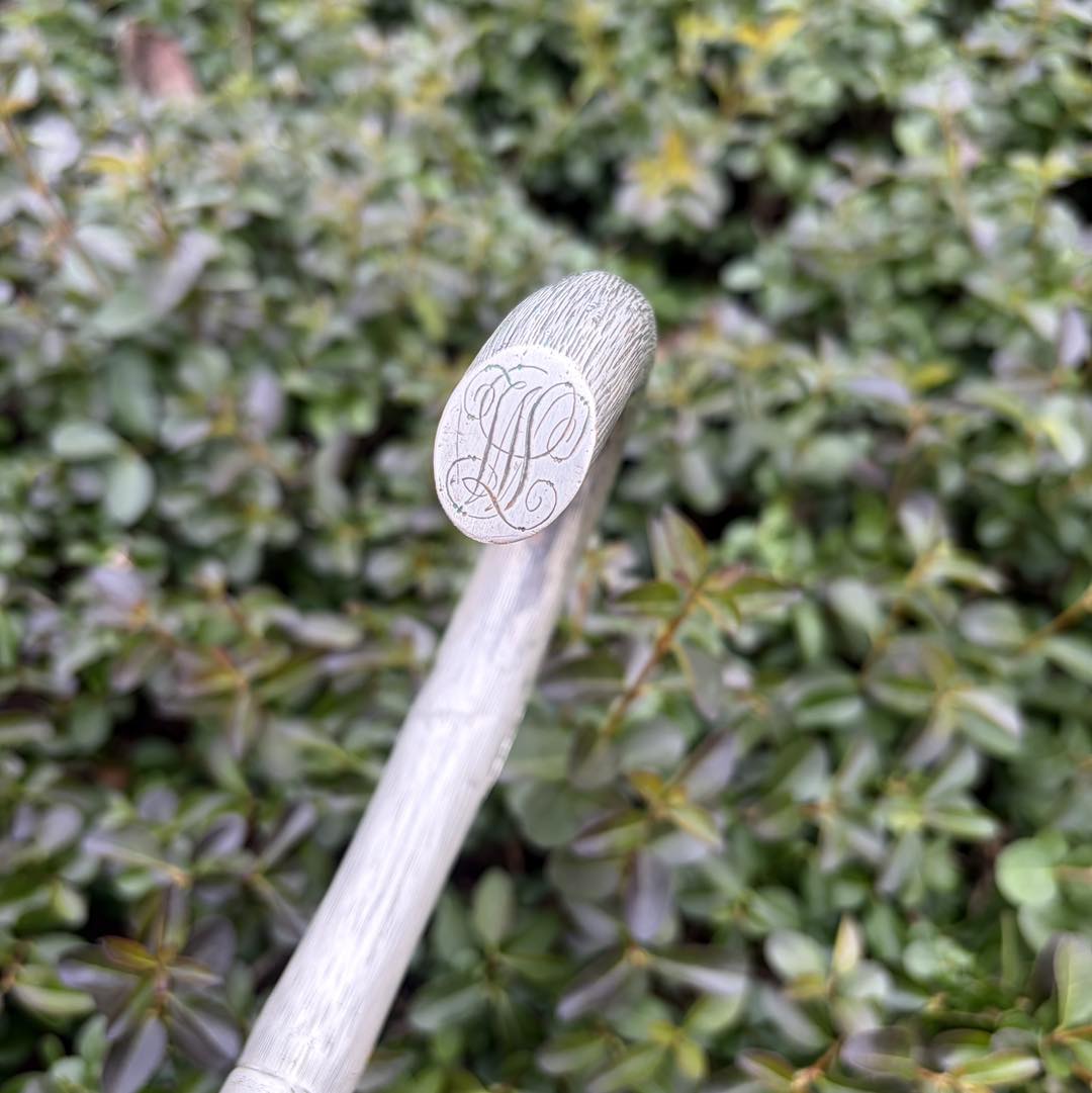 Mâner în formă de "C" (Crook handle): Este un stil clasic, ergonomic și elegant. Textura aplicată pe argint imită, cel mai probabil, scoarța de copac sau un material natural, o tehnică de decorare foarte populară în acea epocă pentru a oferi aderență și un aspect organic.