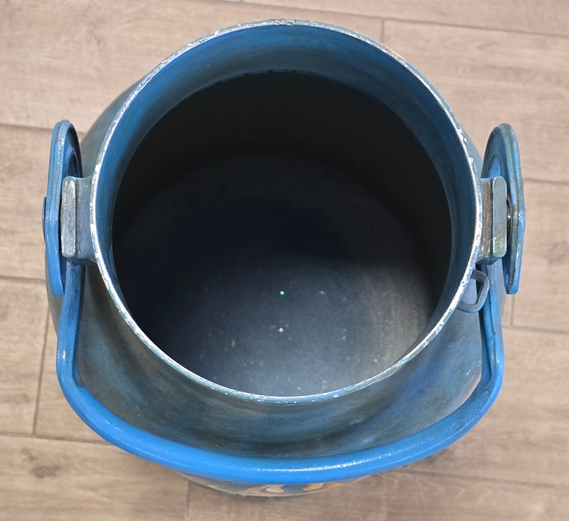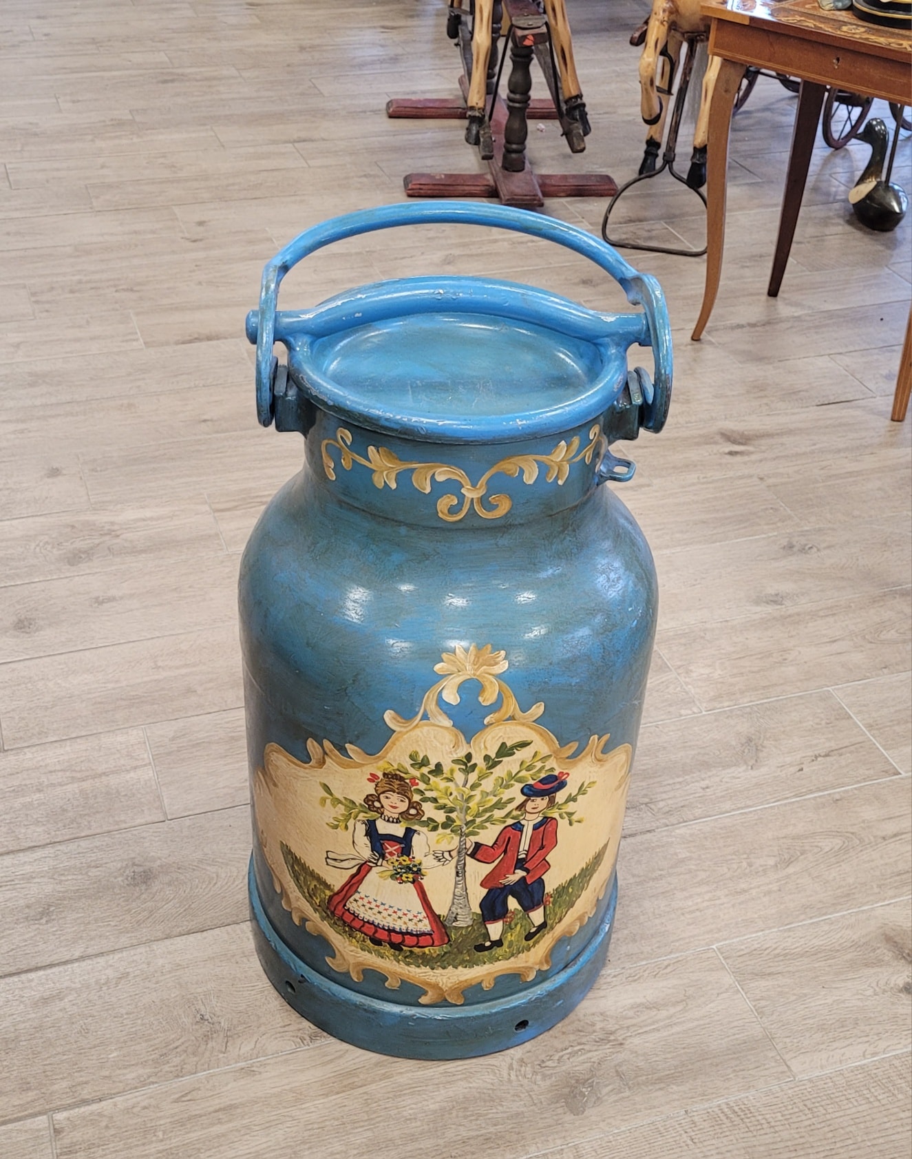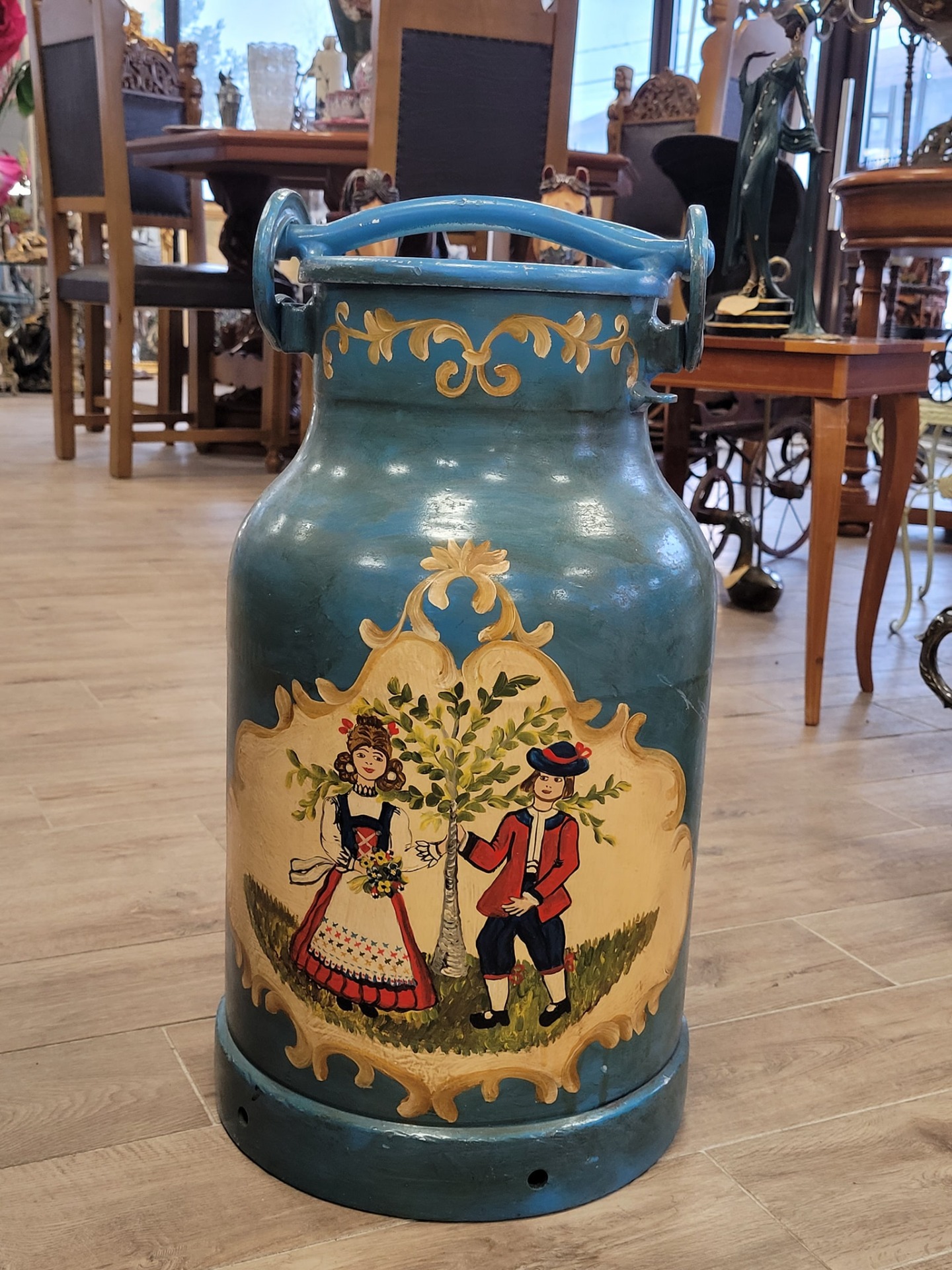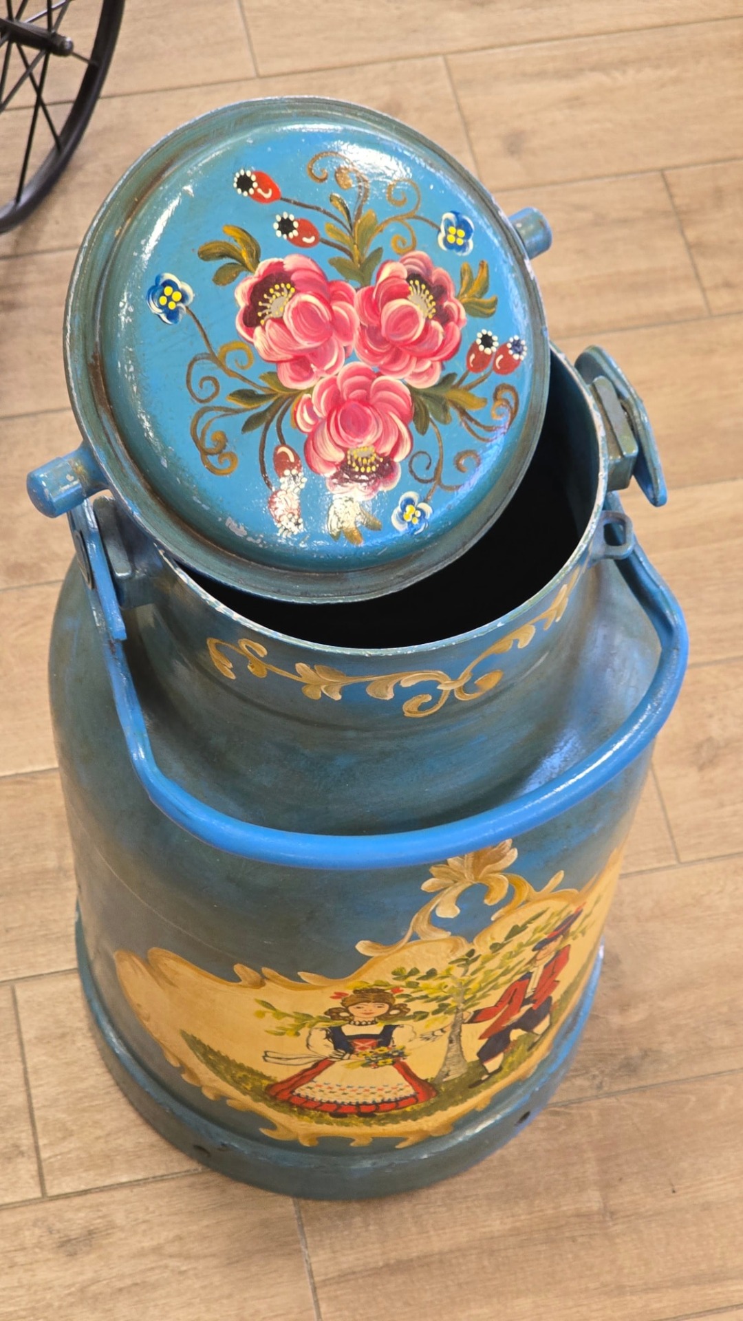 Bidon de lapte decorativ, vintage 1982, pictat manual, în stil rustic/bavarez, decorat cu scene tradiționale și flori pe un fond albastru superb.