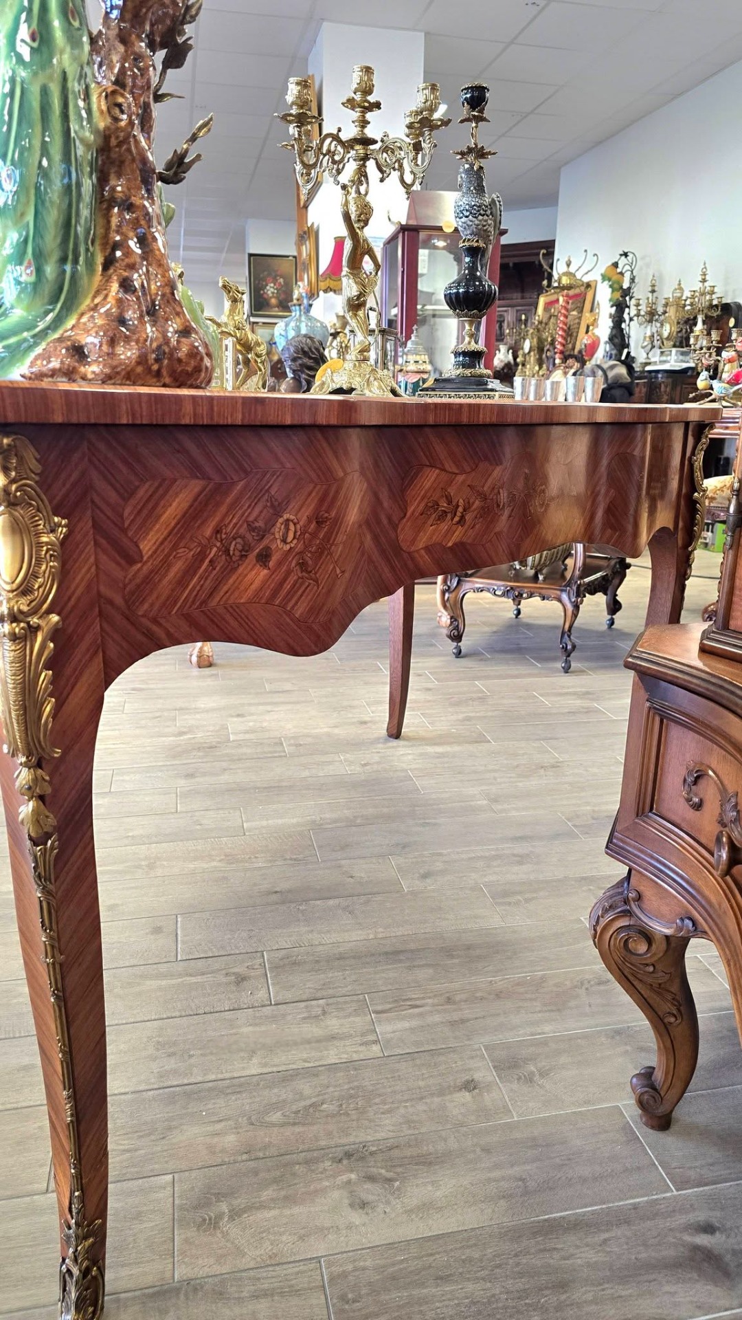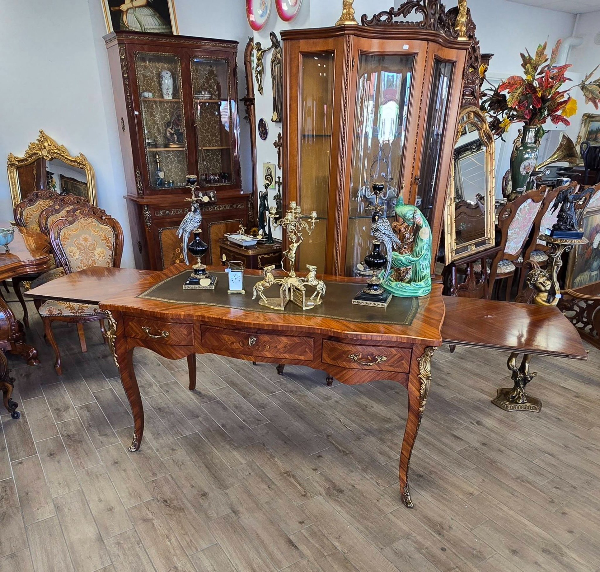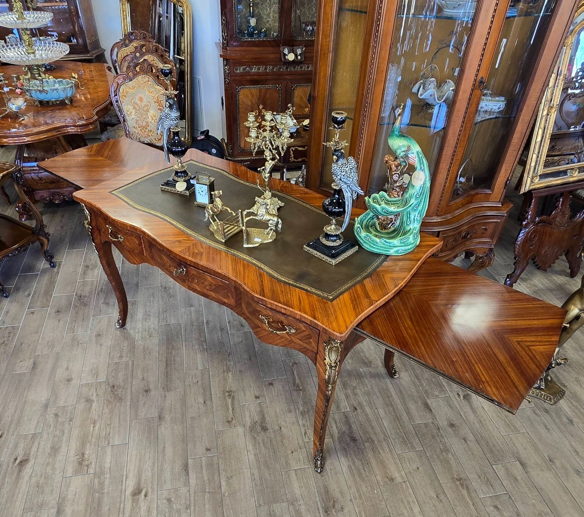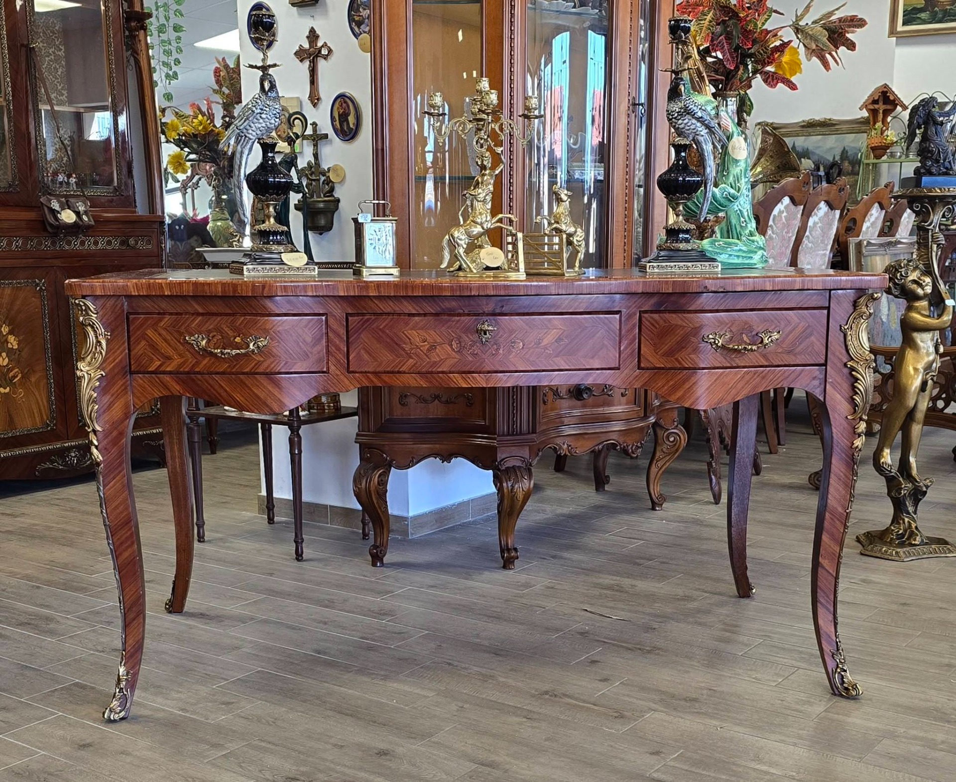 Birou deosebit stil Louis XV (Rococo) cu extensii laterale și marchetărie florală, o piesă de mobilier impunătoare și elegantă, ideală pentru un cabinet de lucru, bibliotecă sau un living rafinat.