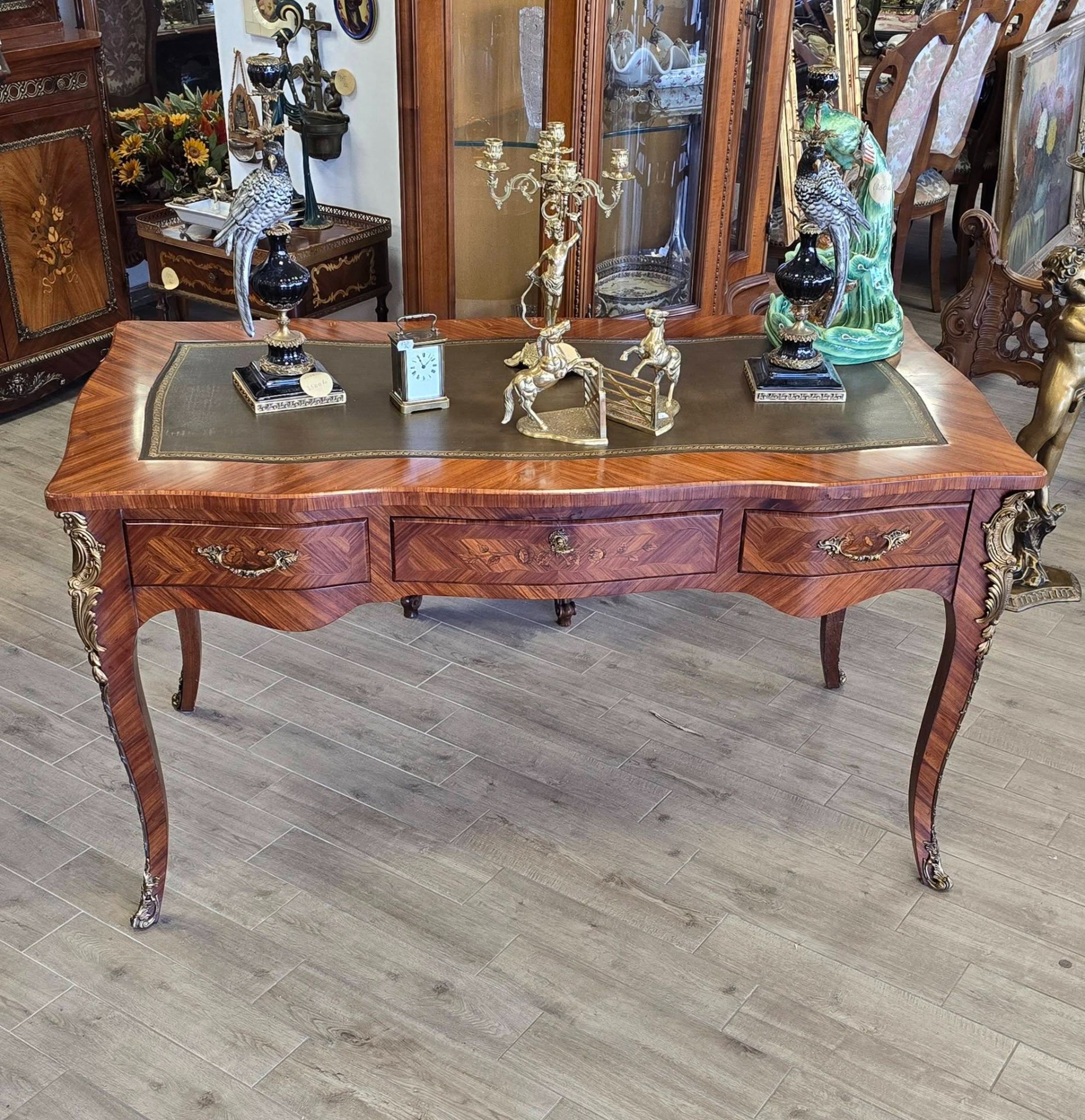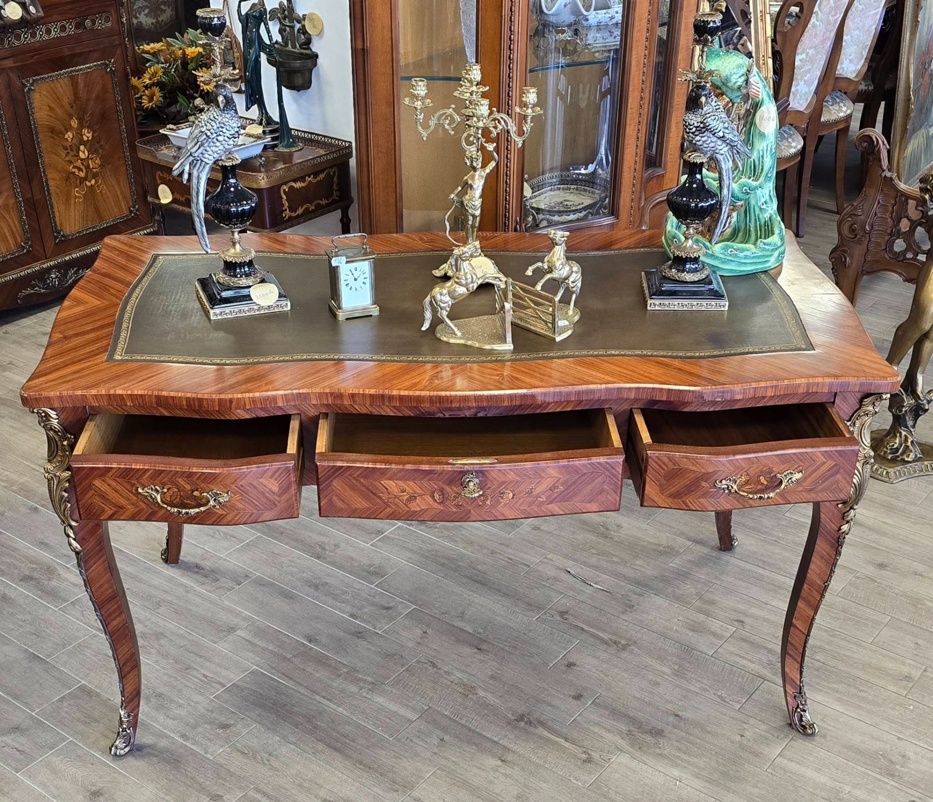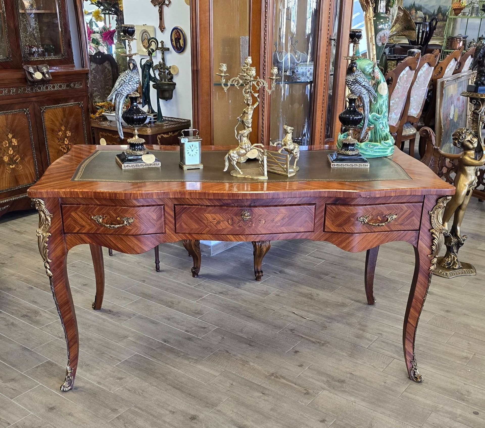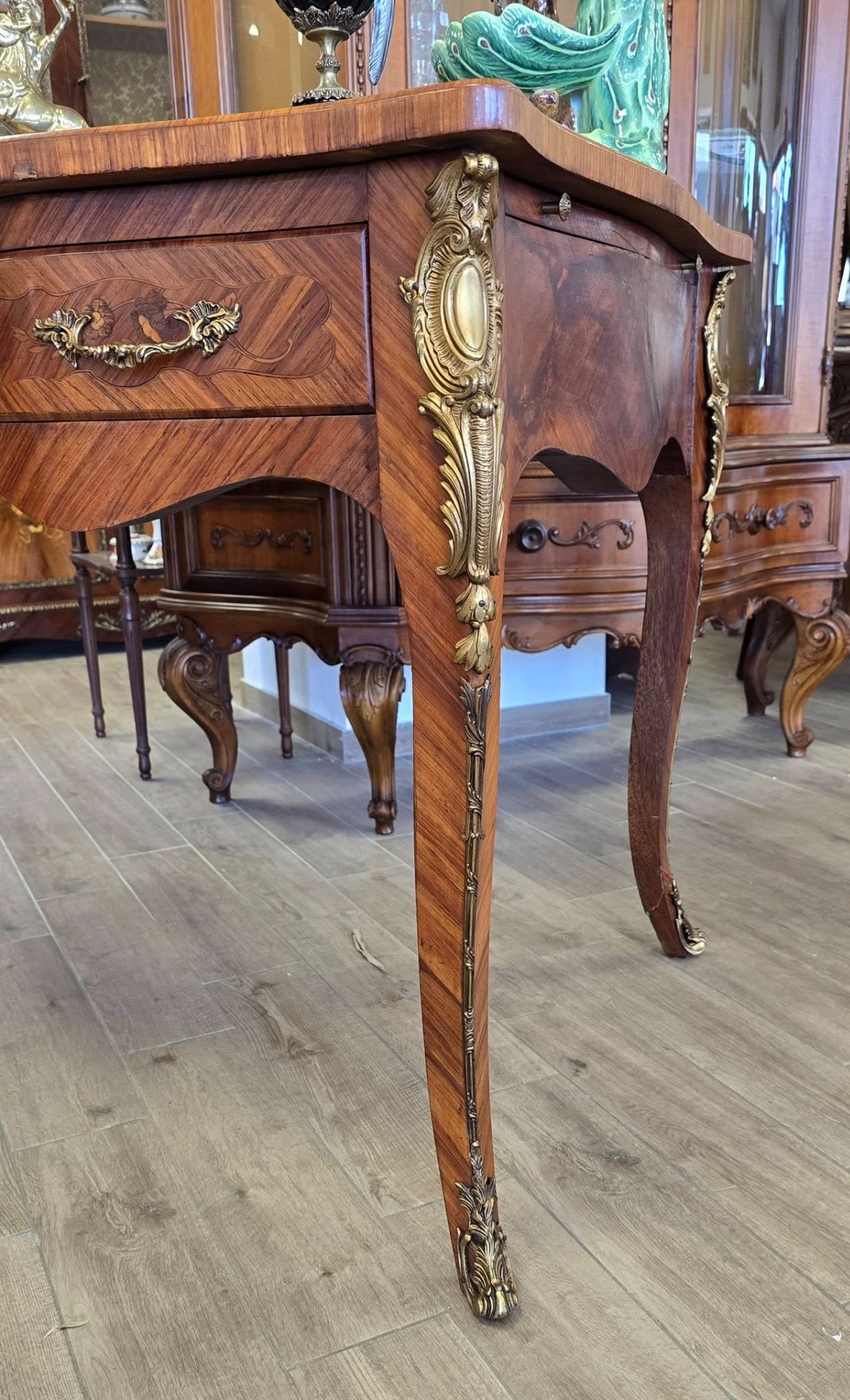 Birou deosebit stil Louis XV (Rococo) cu extensii laterale și marchetărie florală, o piesă de mobilier impunătoare și elegantă, ideală pentru un cabinet de lucru, bibliotecă sau un living rafinat.