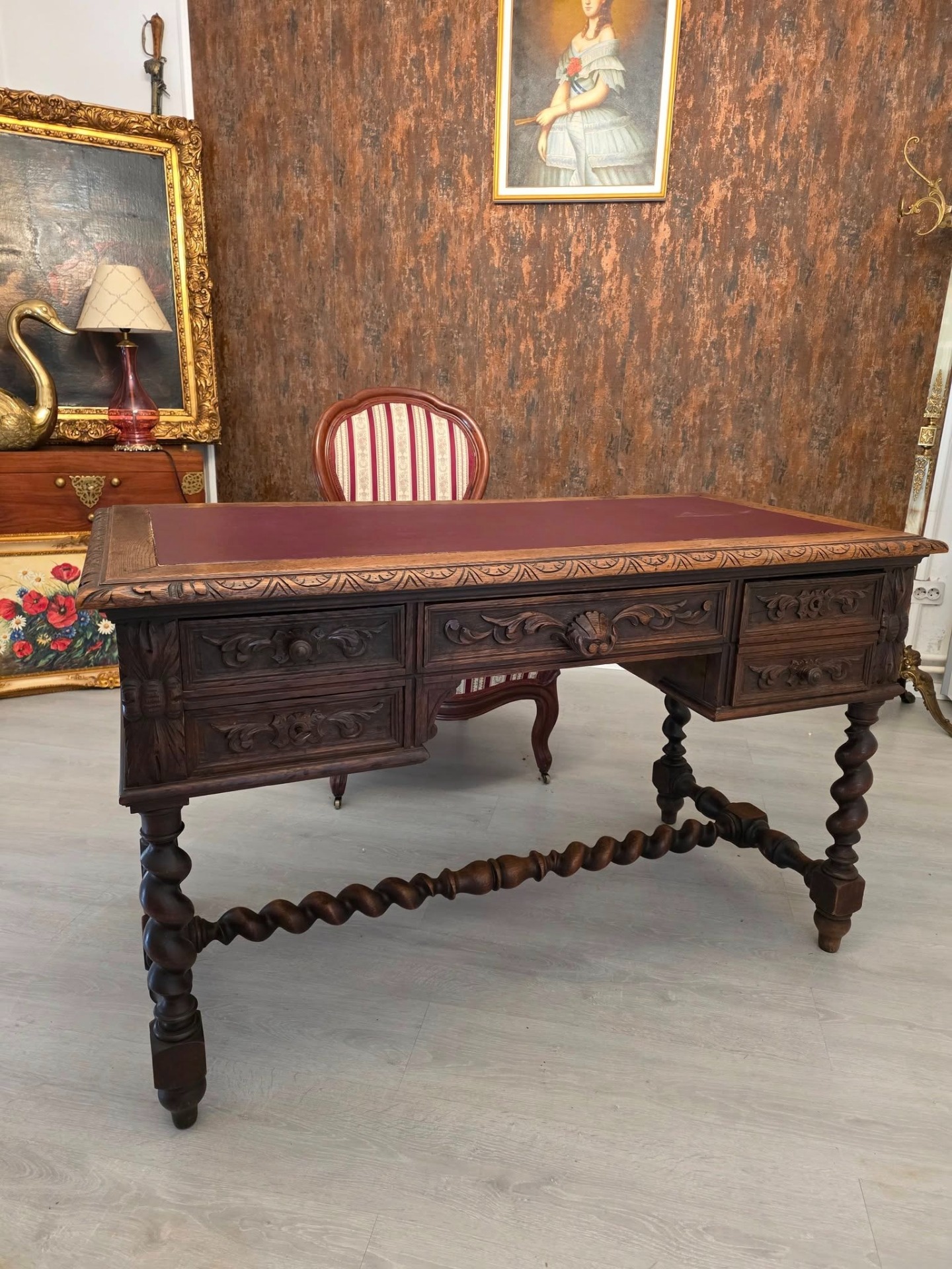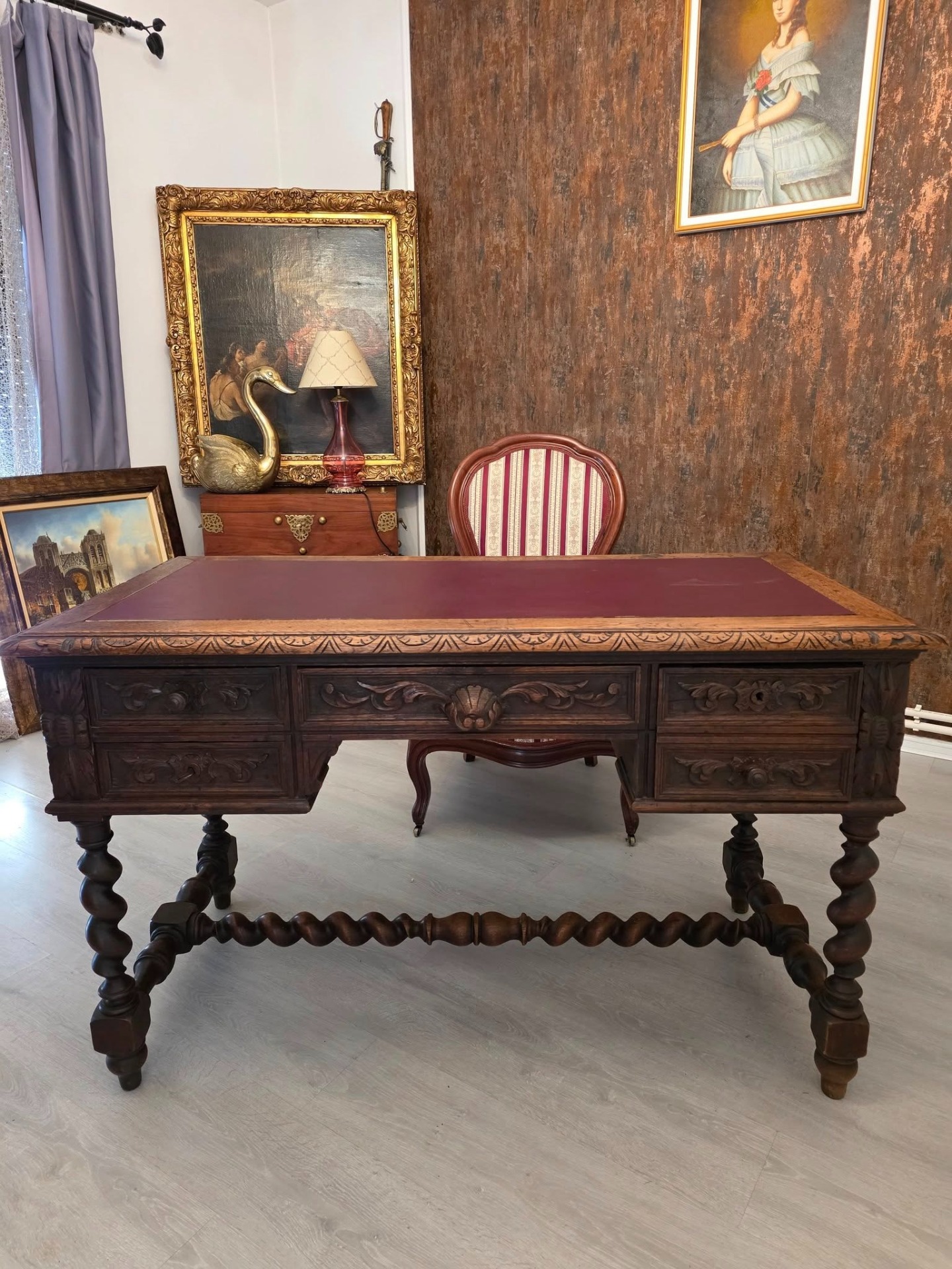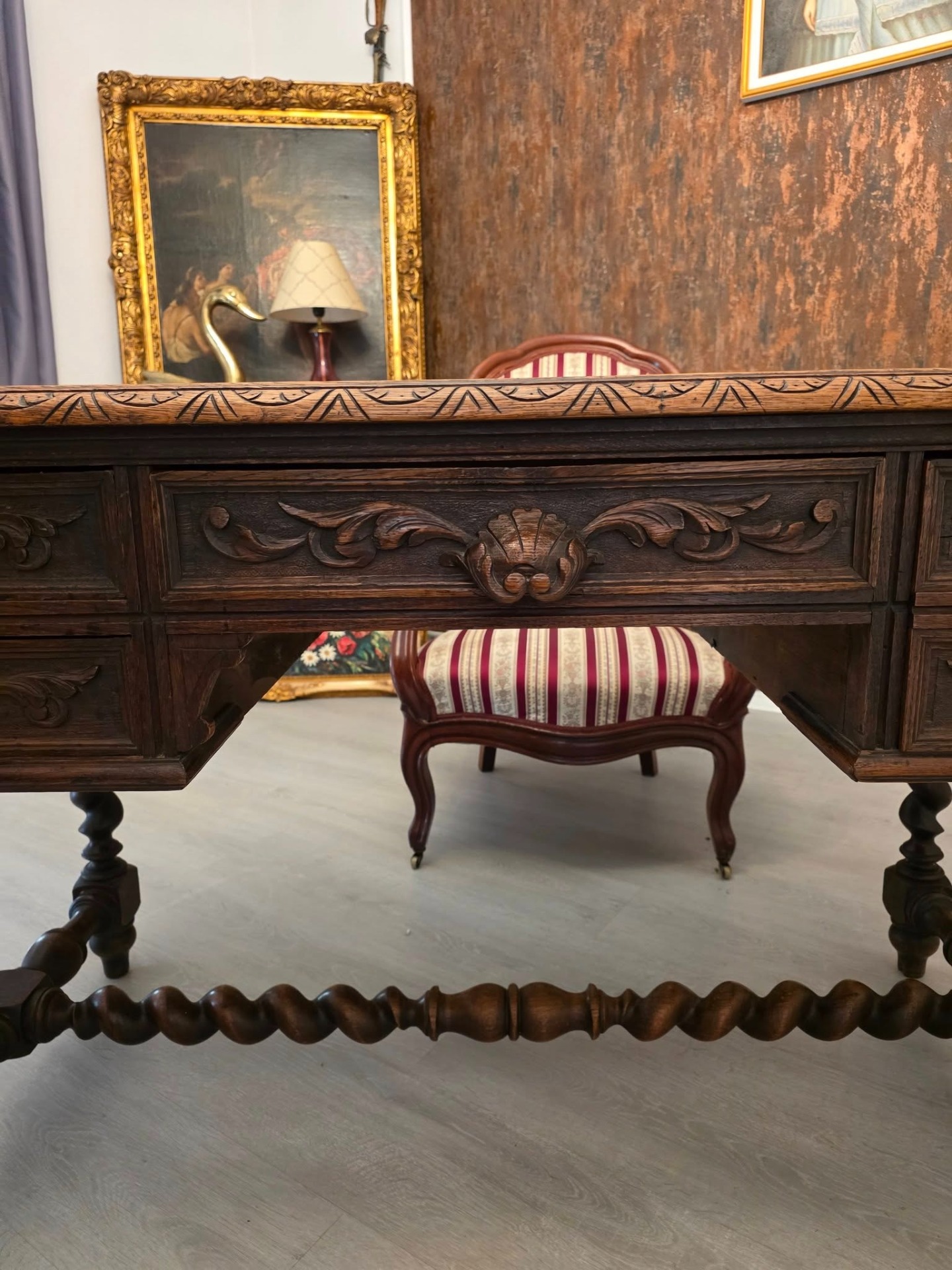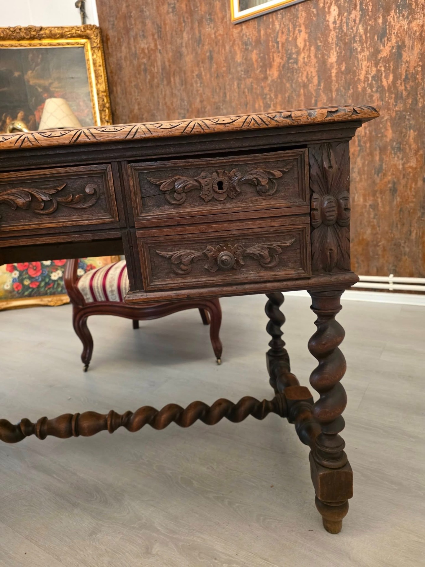 Birou masiv din lemn sculptat – stil renascentist / baroc, cu picioare torsadate