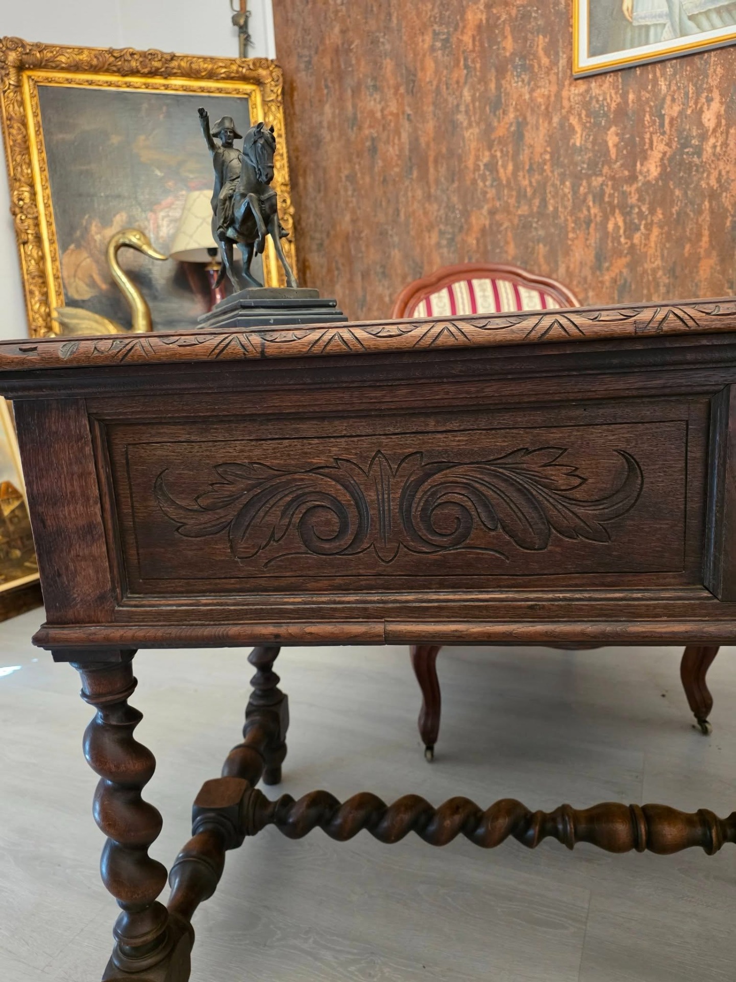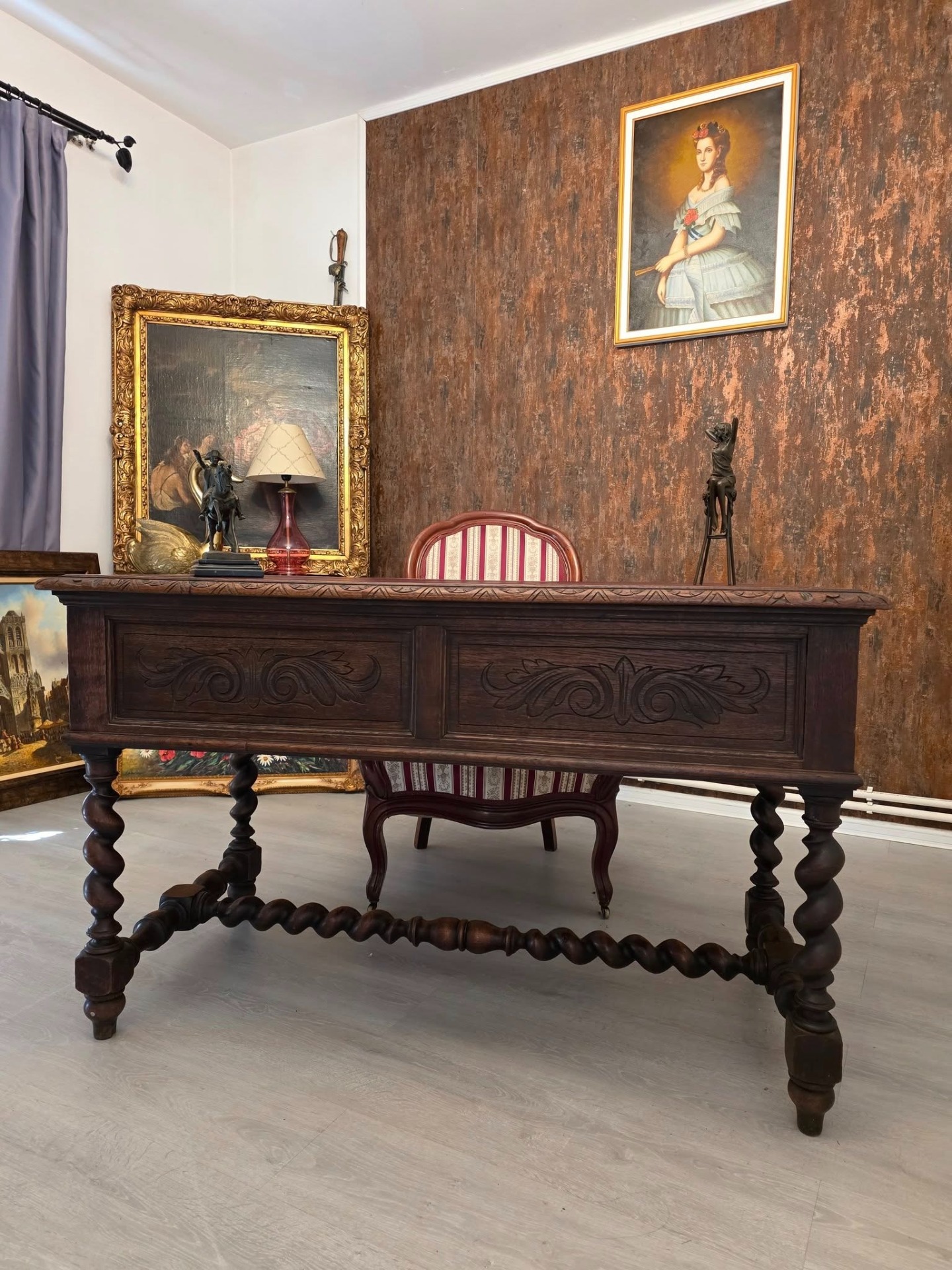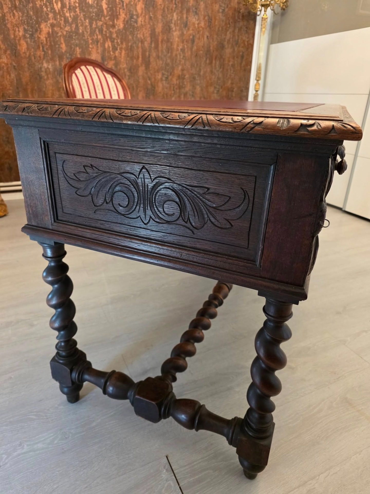 Biroul se remarcă prin picioarele torsadate, motivele florale sculptate în relief și detaliile de pe muchii, toate executate cu măiestrie.