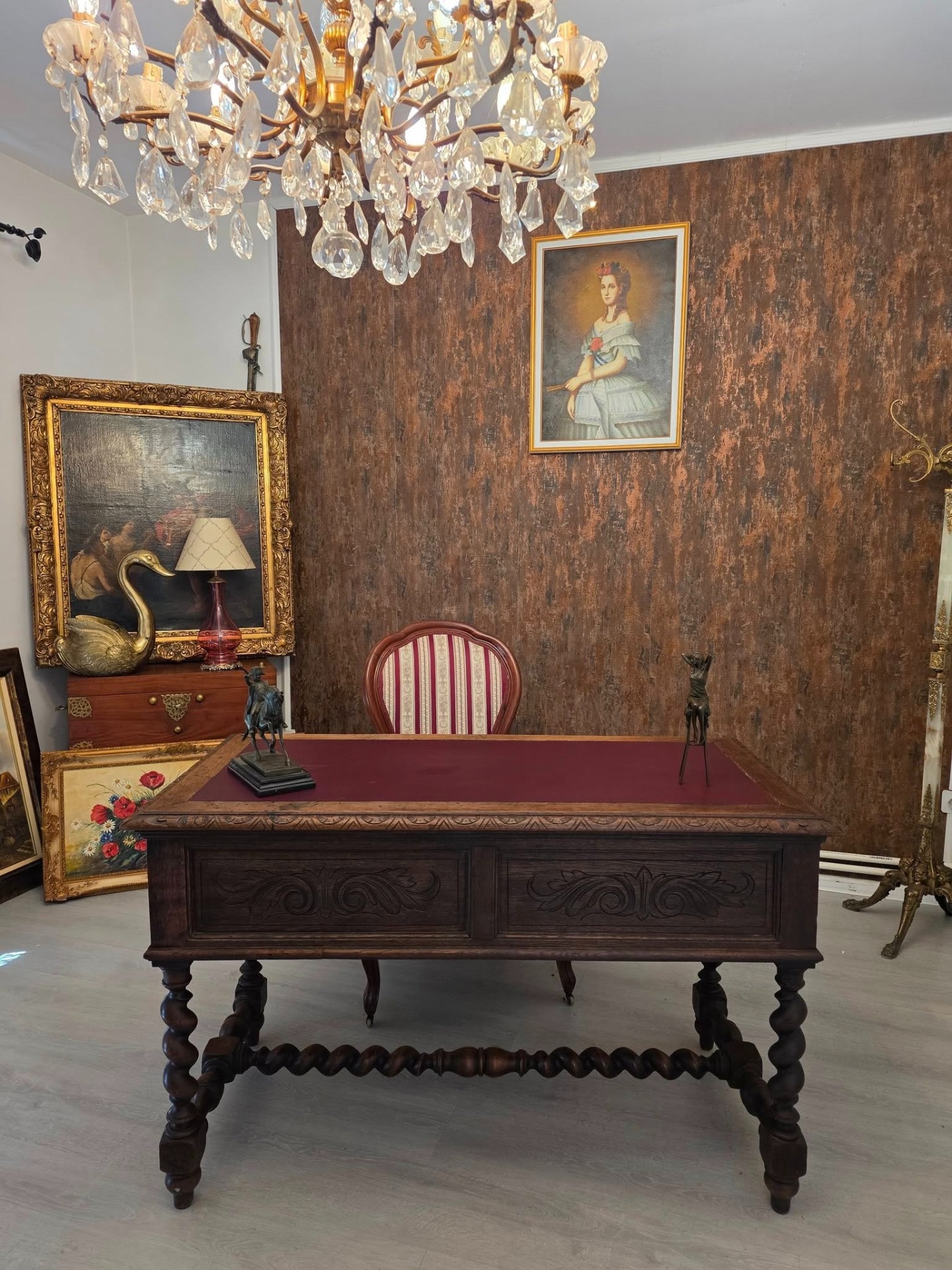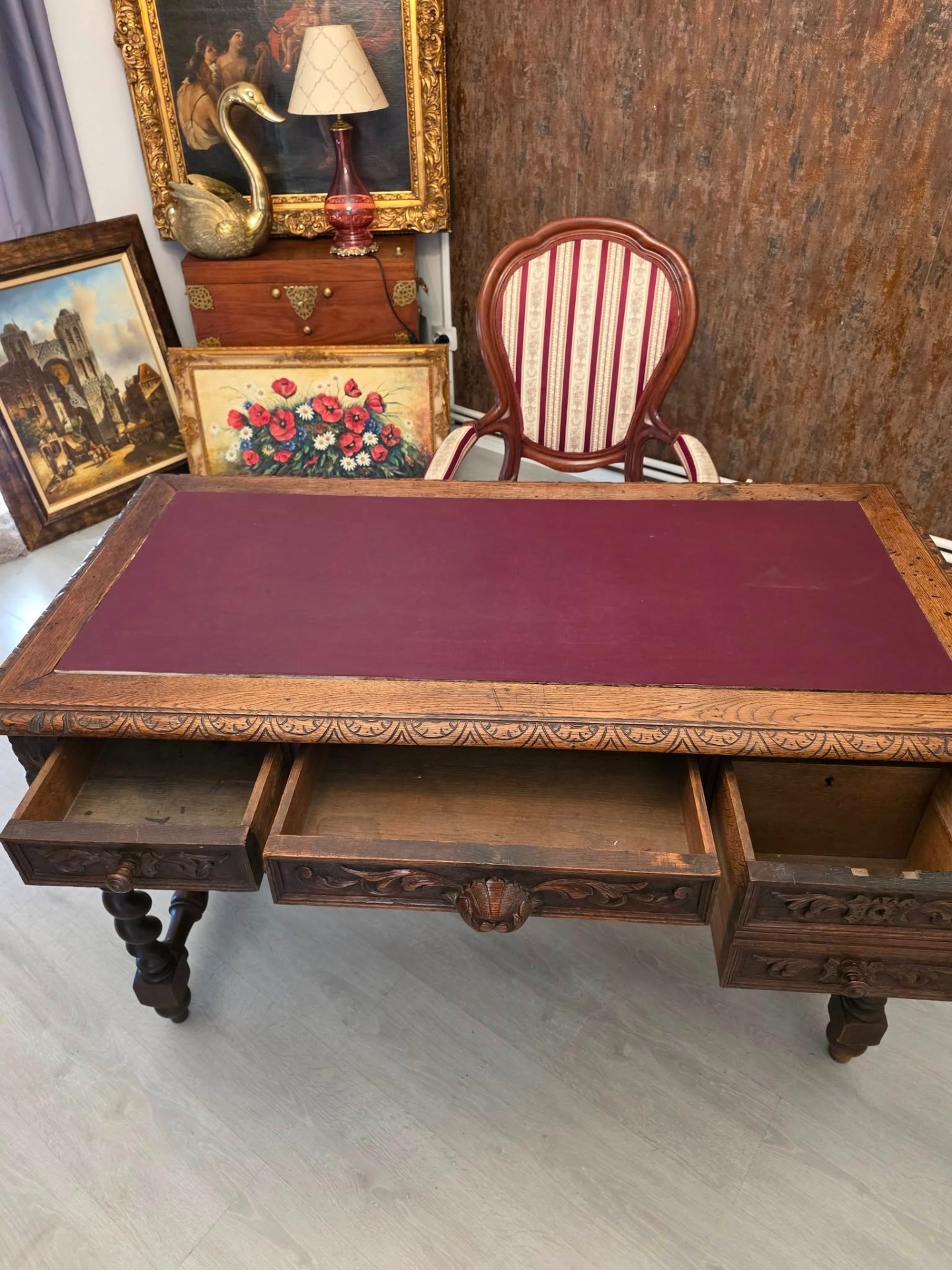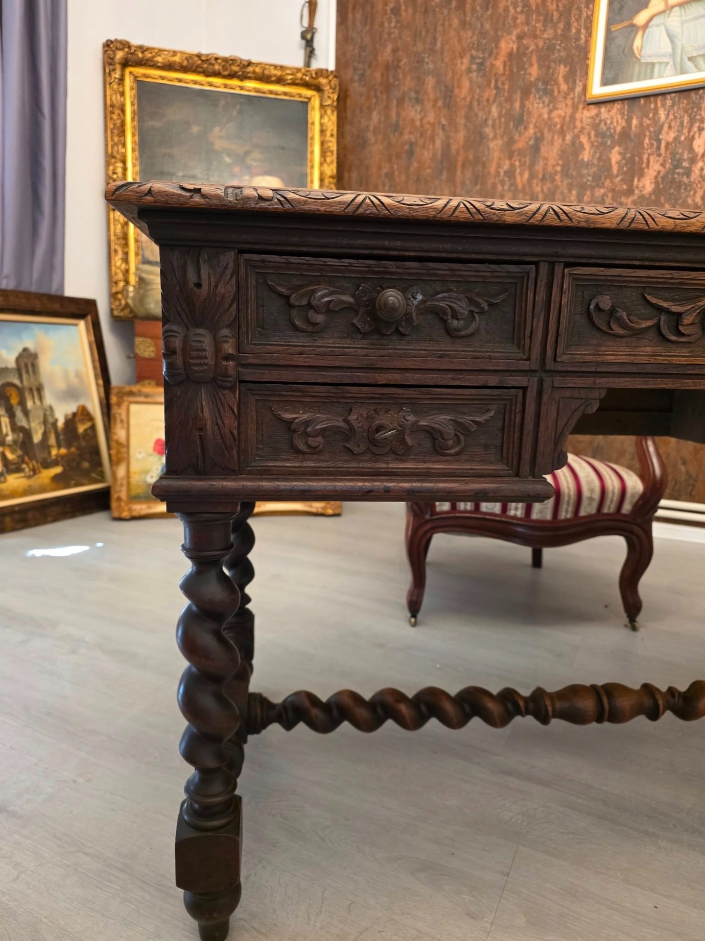 Biroul se remarcă prin picioarele torsadate, motivele florale sculptate în relief și detaliile de pe muchii, toate executate cu măiestrie.