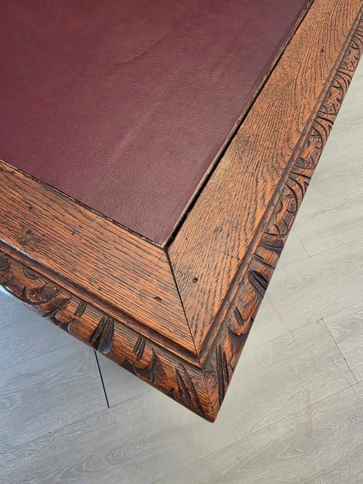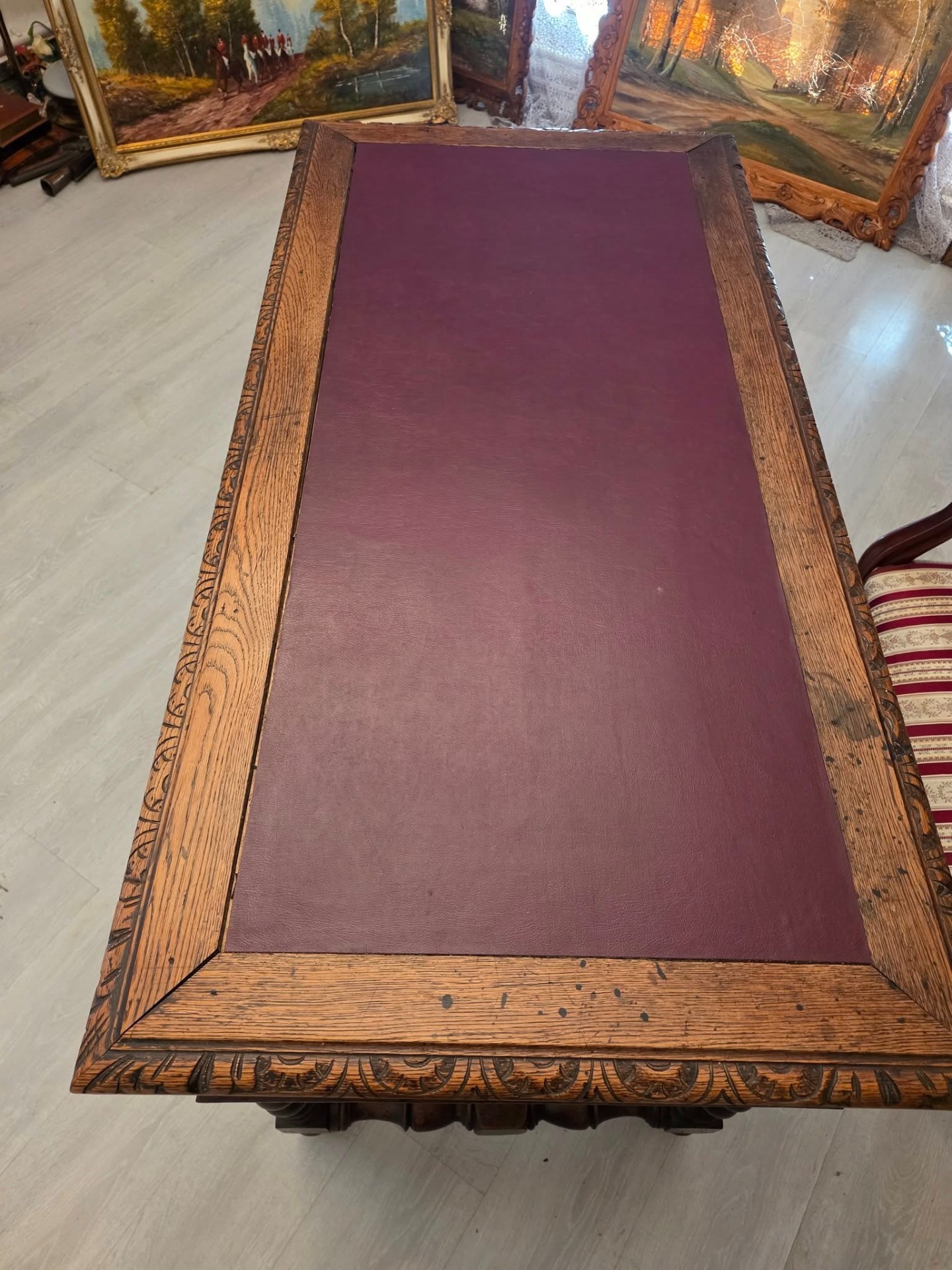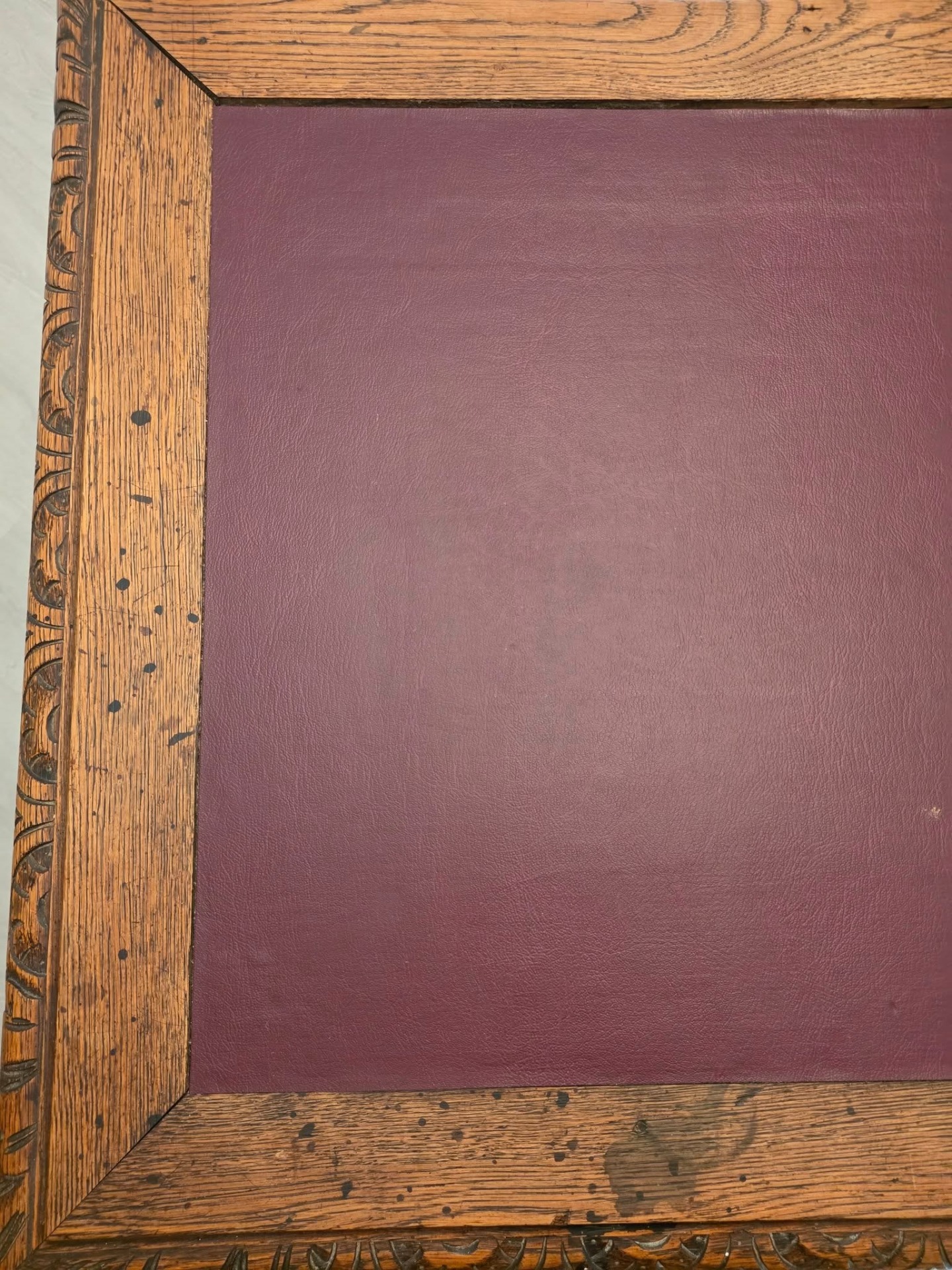 Blatul este acoperit cu piele naturală bordo, bordată cu ramă din lemn sculptat fin.