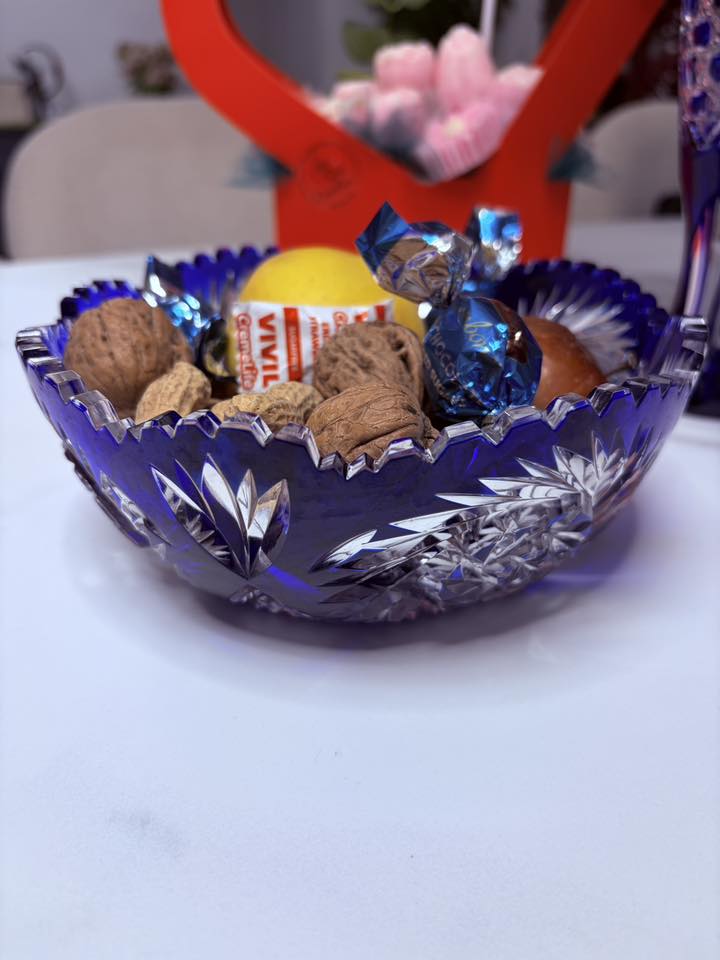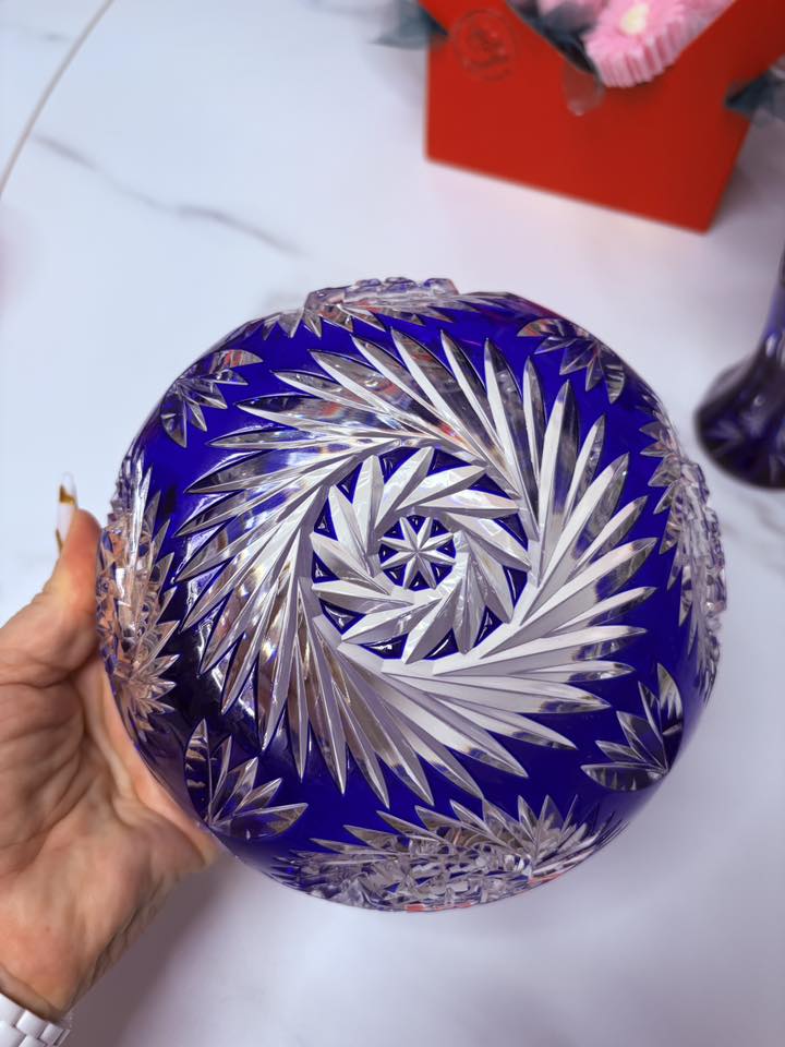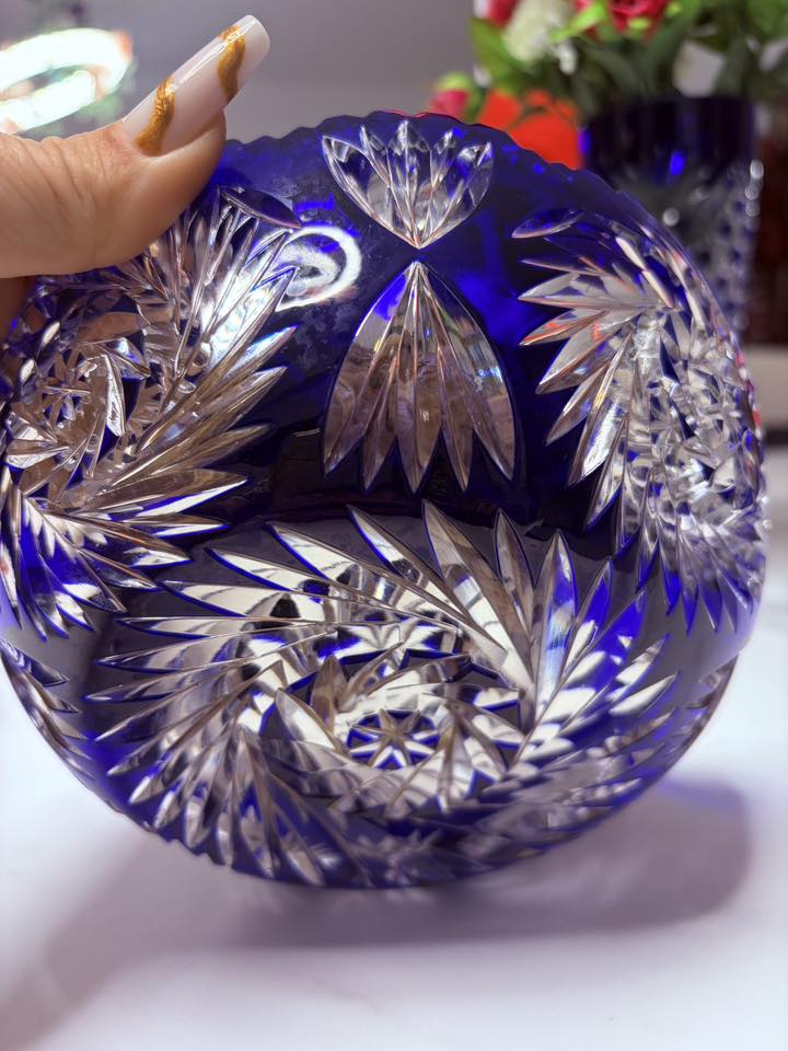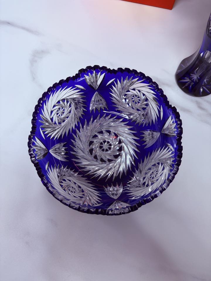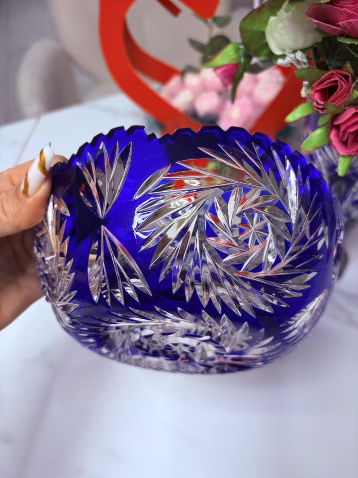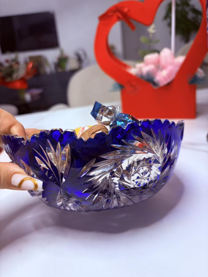 Bol superb realizat din cristal gros, de culoare albastru cobalt, bogat ornamentat cu motive geometrice și florale tăiate manual. Marginea este fin dantelată, iar modelul reflectă spectaculos lumina, oferind un aspect elegant și rafinat.