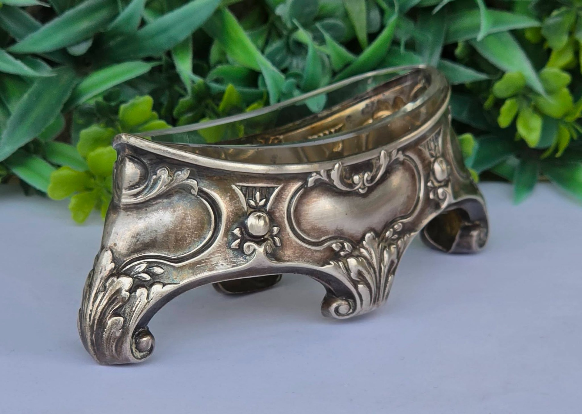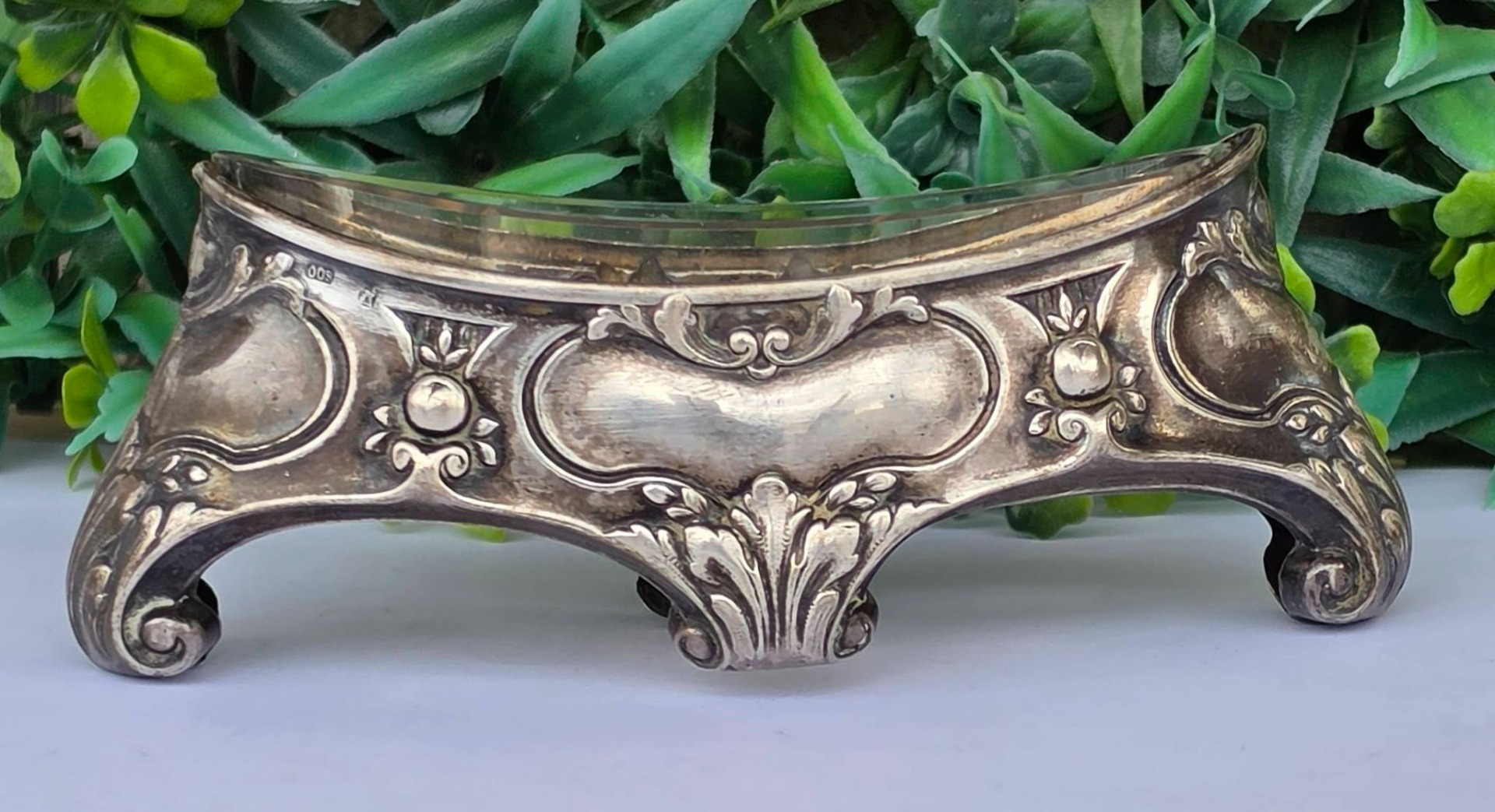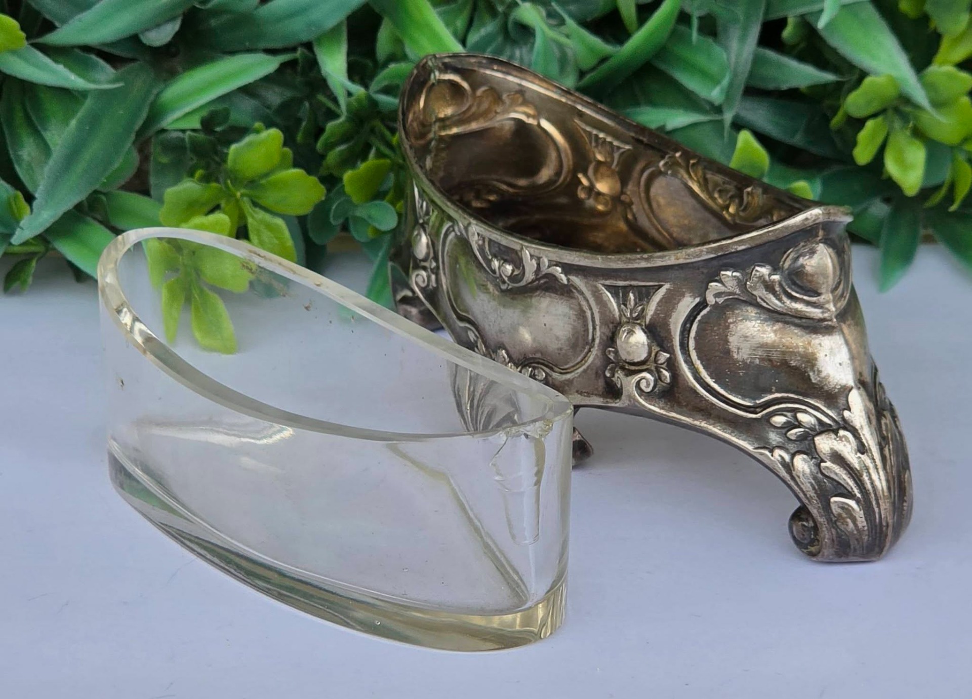 Bol pentru condimente sau sosieră Art Nouveau, din argint, decorat cu motive vegetale și forme de cochilie, cu picioare tip "ghidron", prevăzut cu recipient din sticlă.