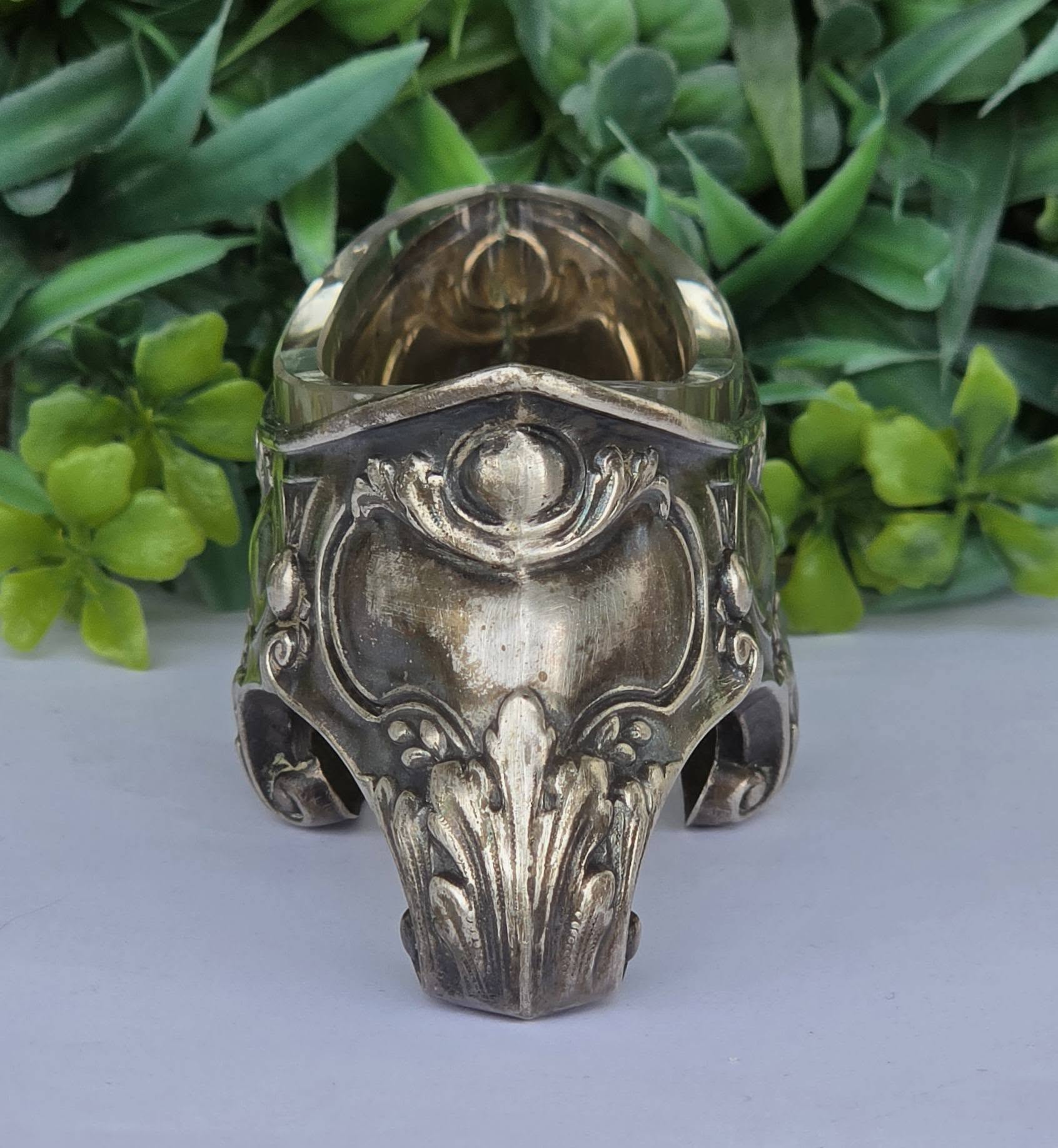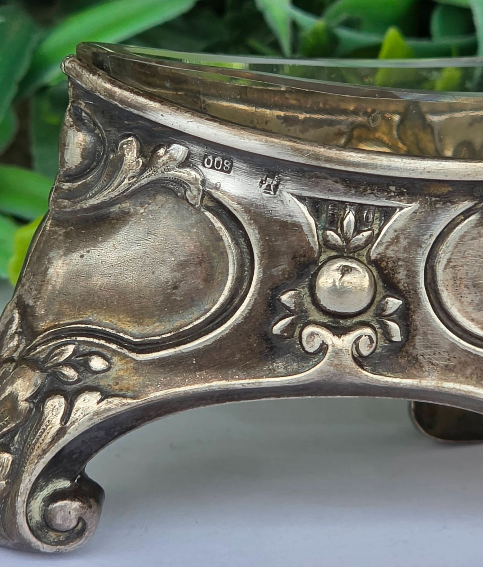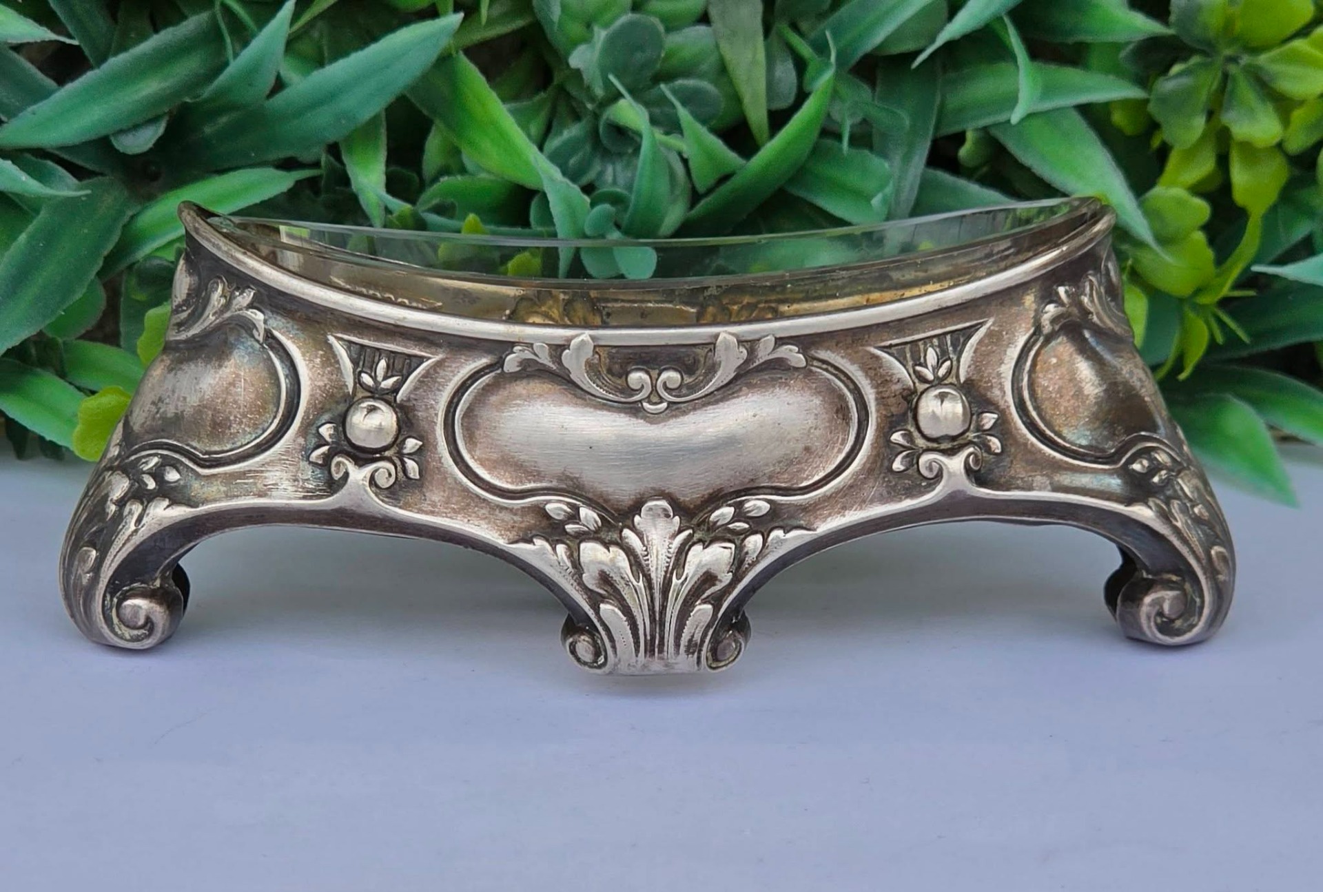 Bol pentru condimente sau sosieră Art Nouveau, din argint, decorat cu motive vegetale și forme de cochilie, cu picioare tip "ghidron", prevăzut cu recipient din sticlă.