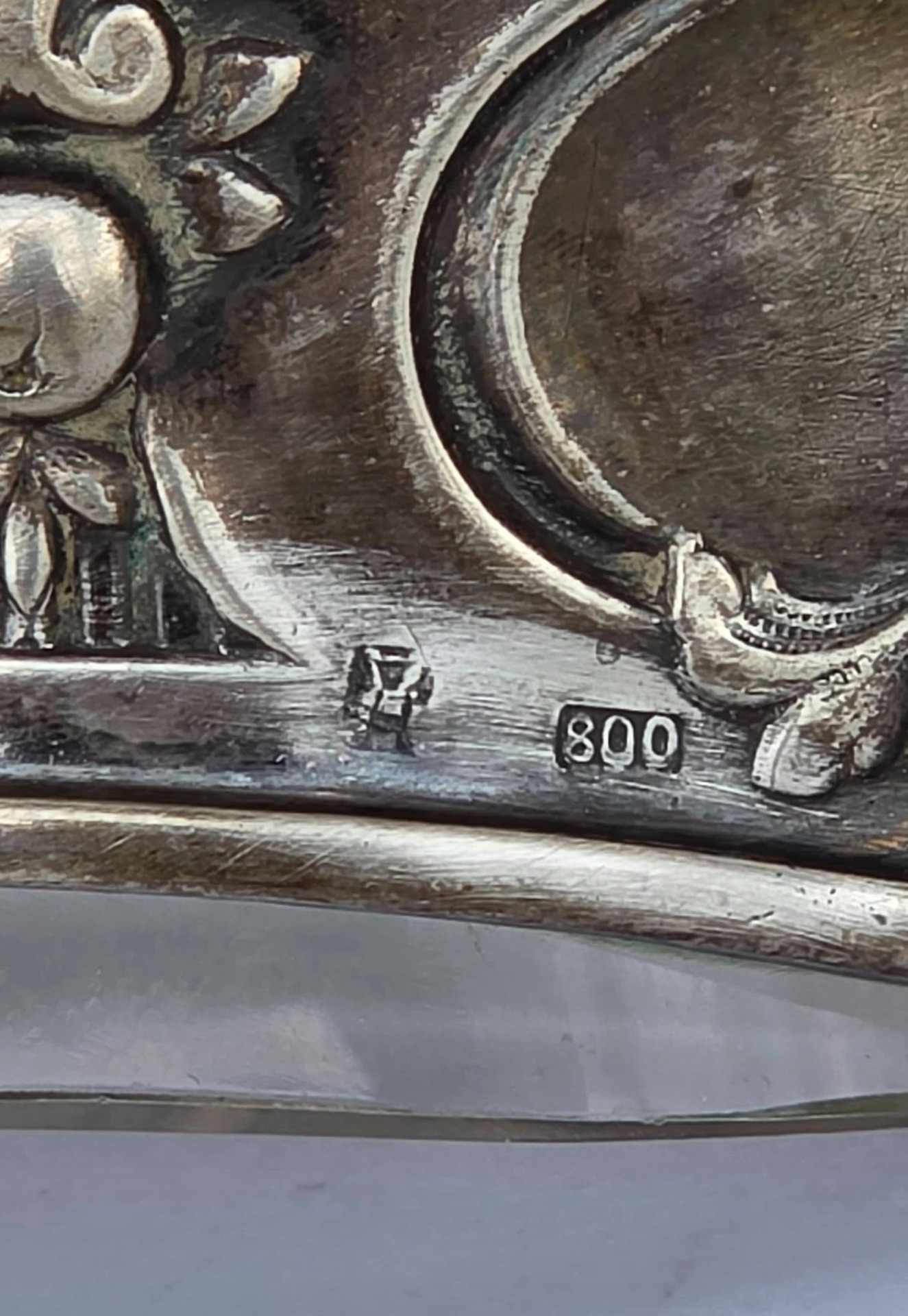 Prezintă marcaj de argint 800 și marcaj de meșter.