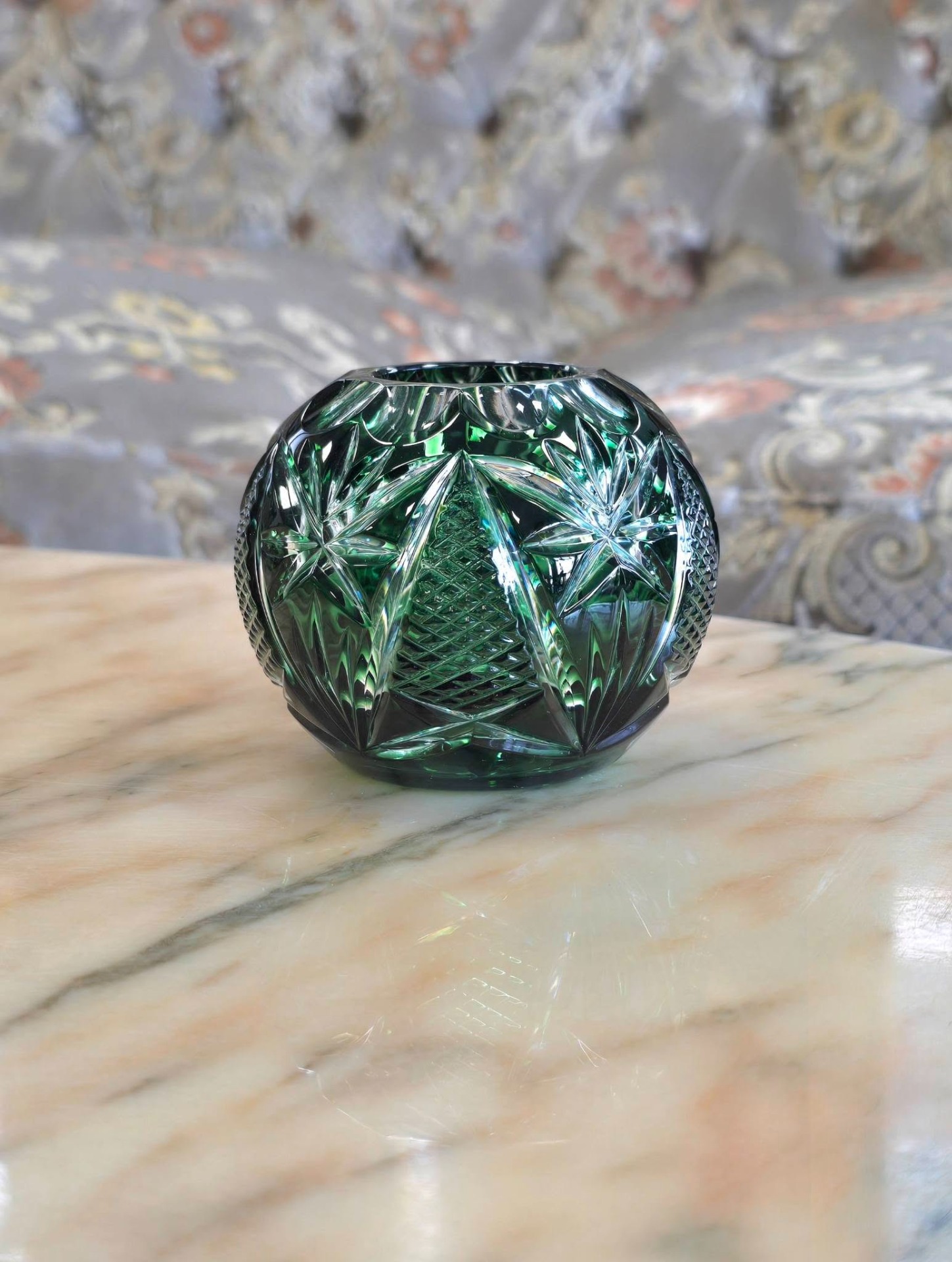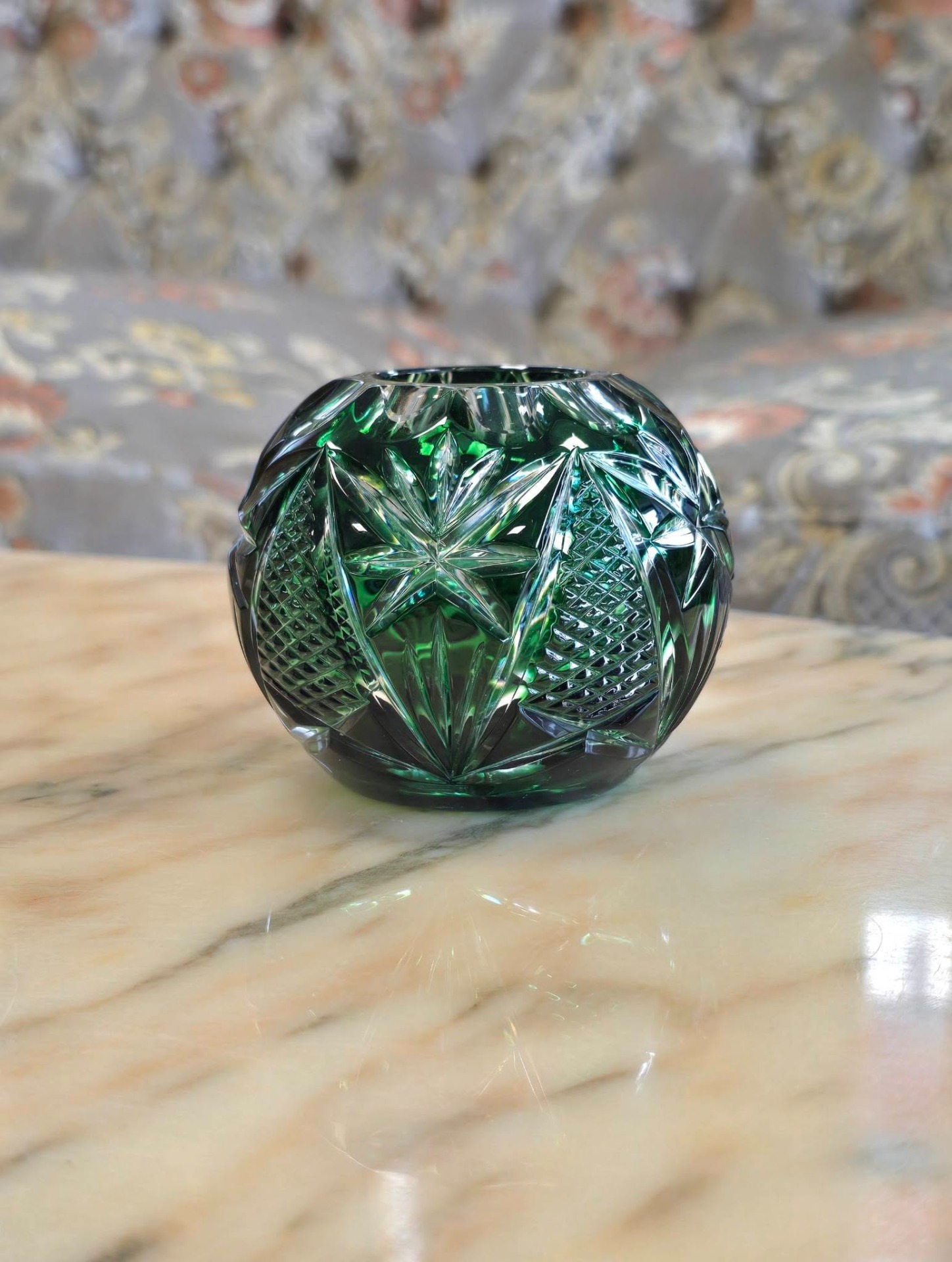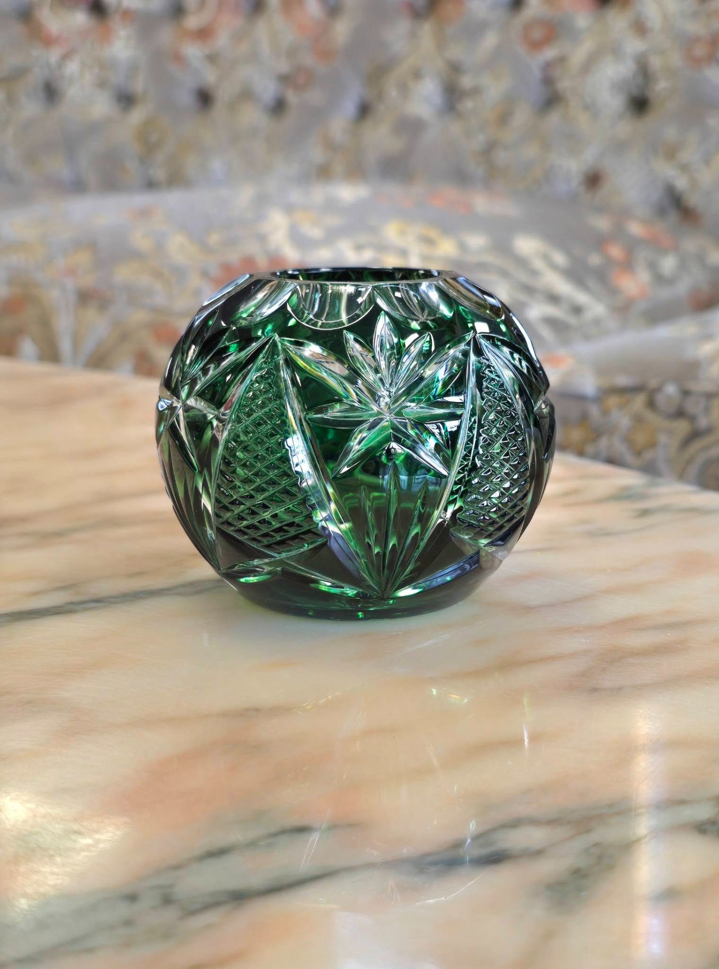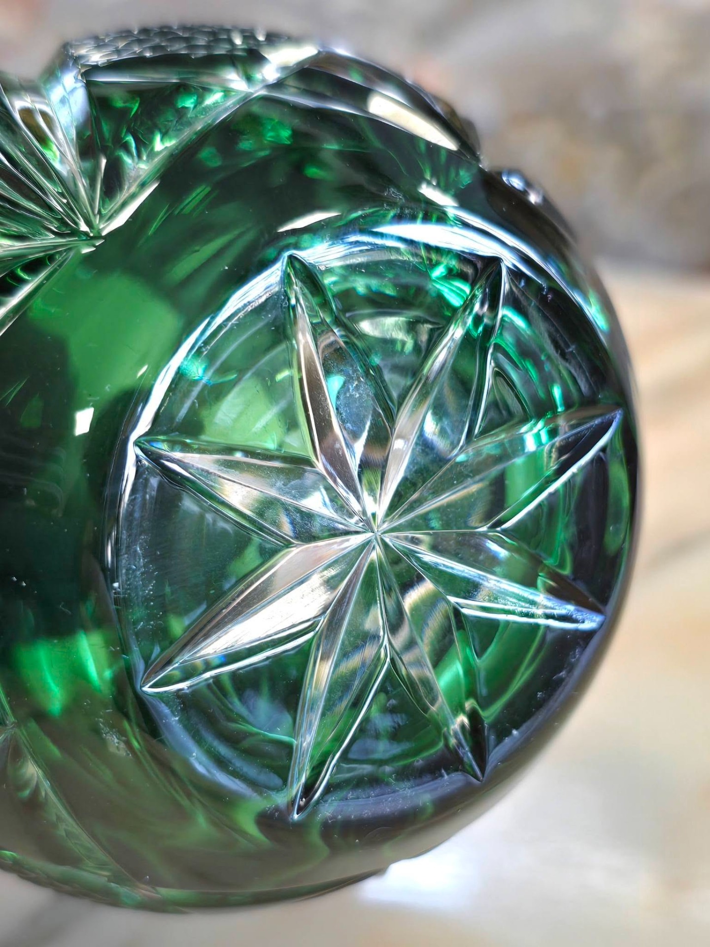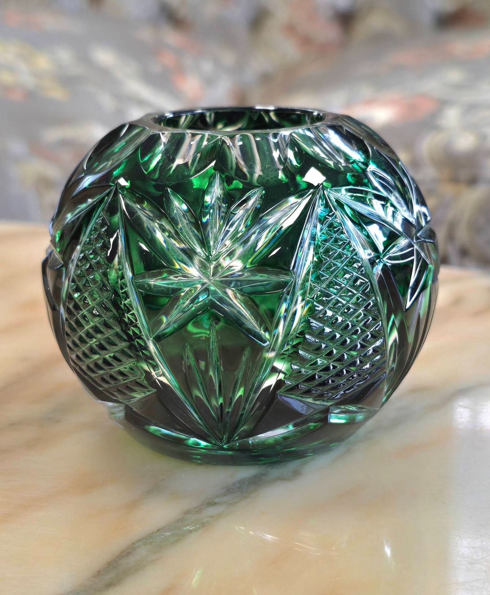 Bol vintage (Rose Bowl) din cristal de Bohemia verde smarald tăiat manual, cu tăieturi geometrice adânci și complexe (model pinwheel/morișcă, evantai și elemente