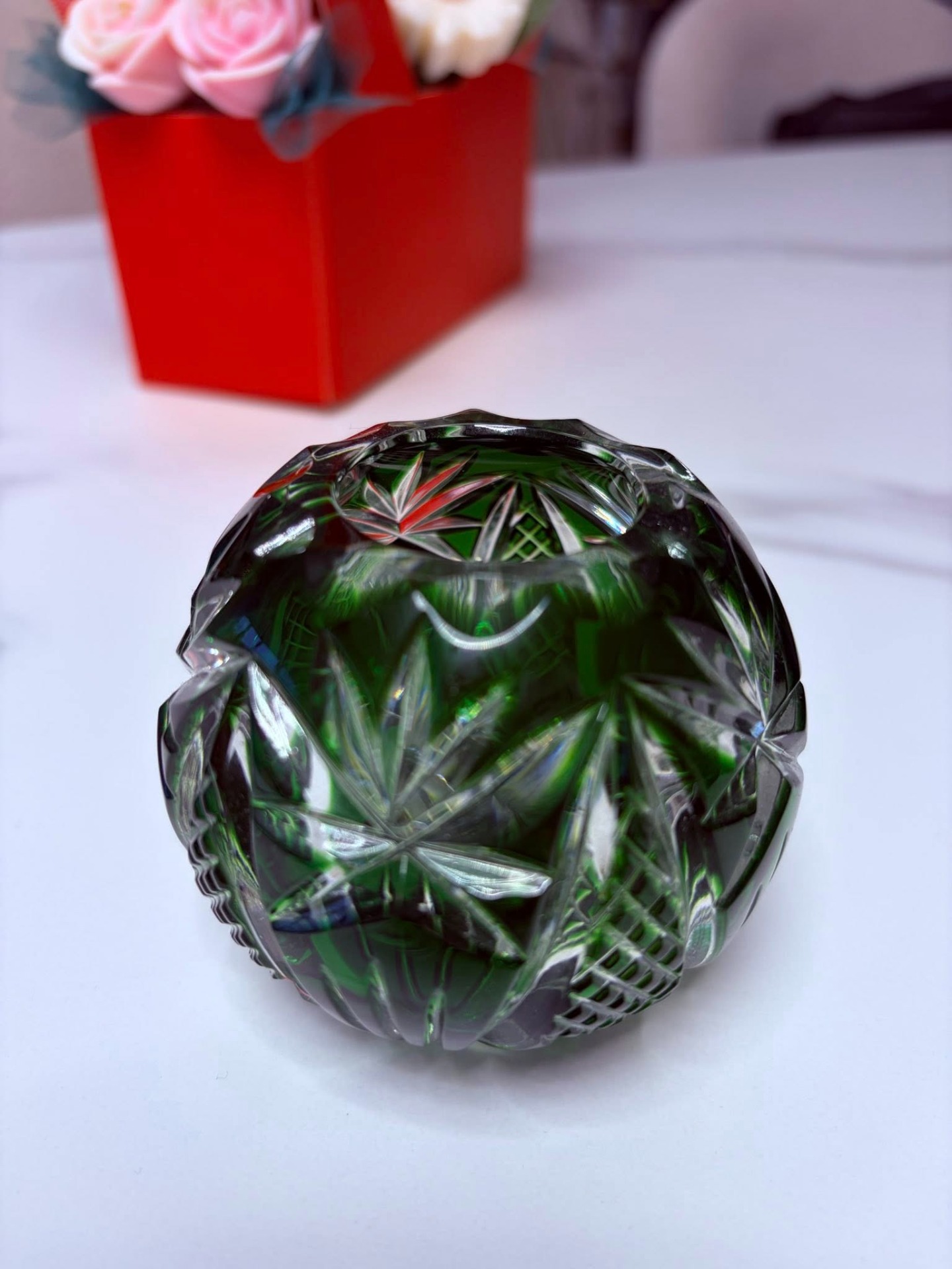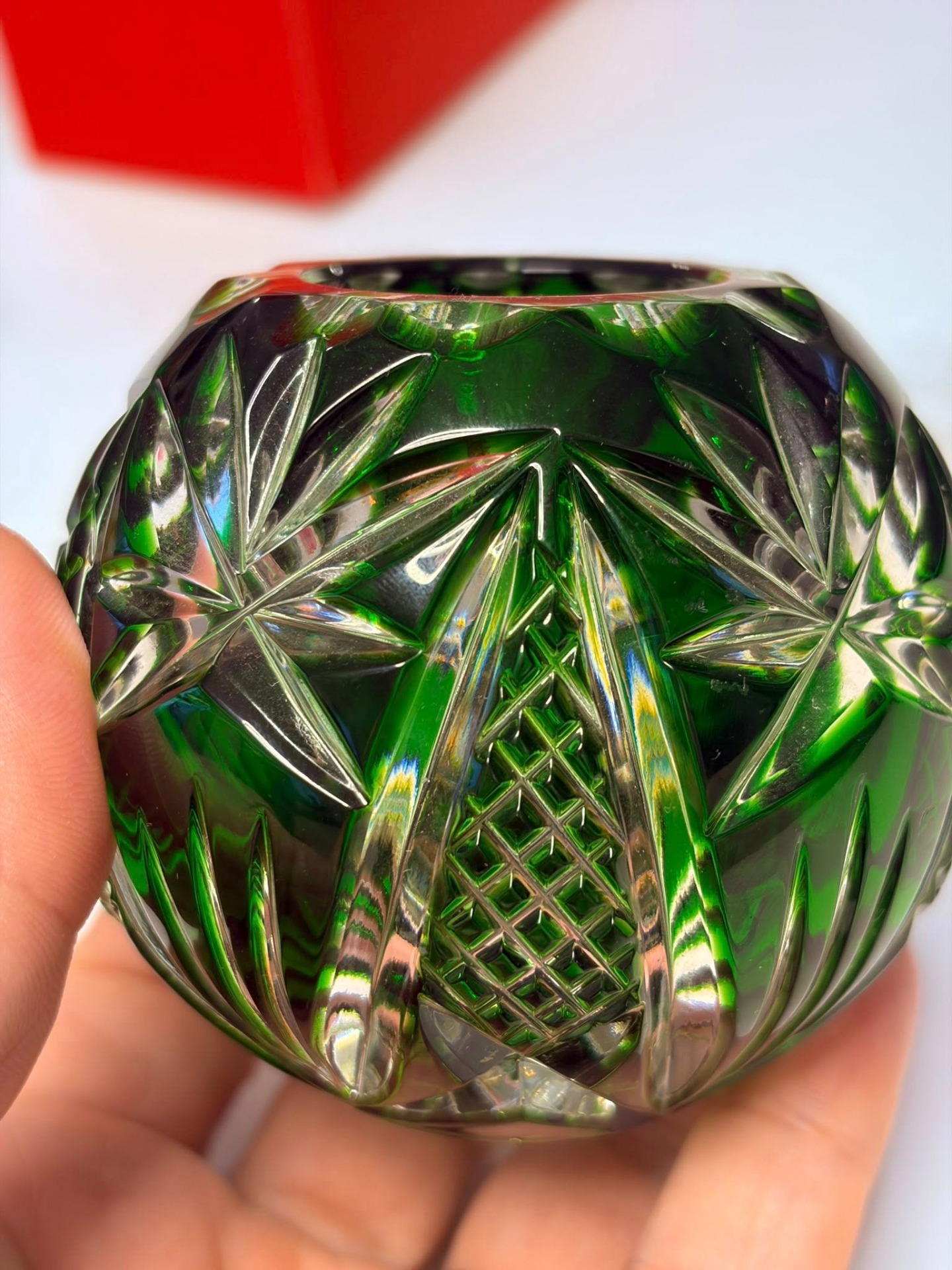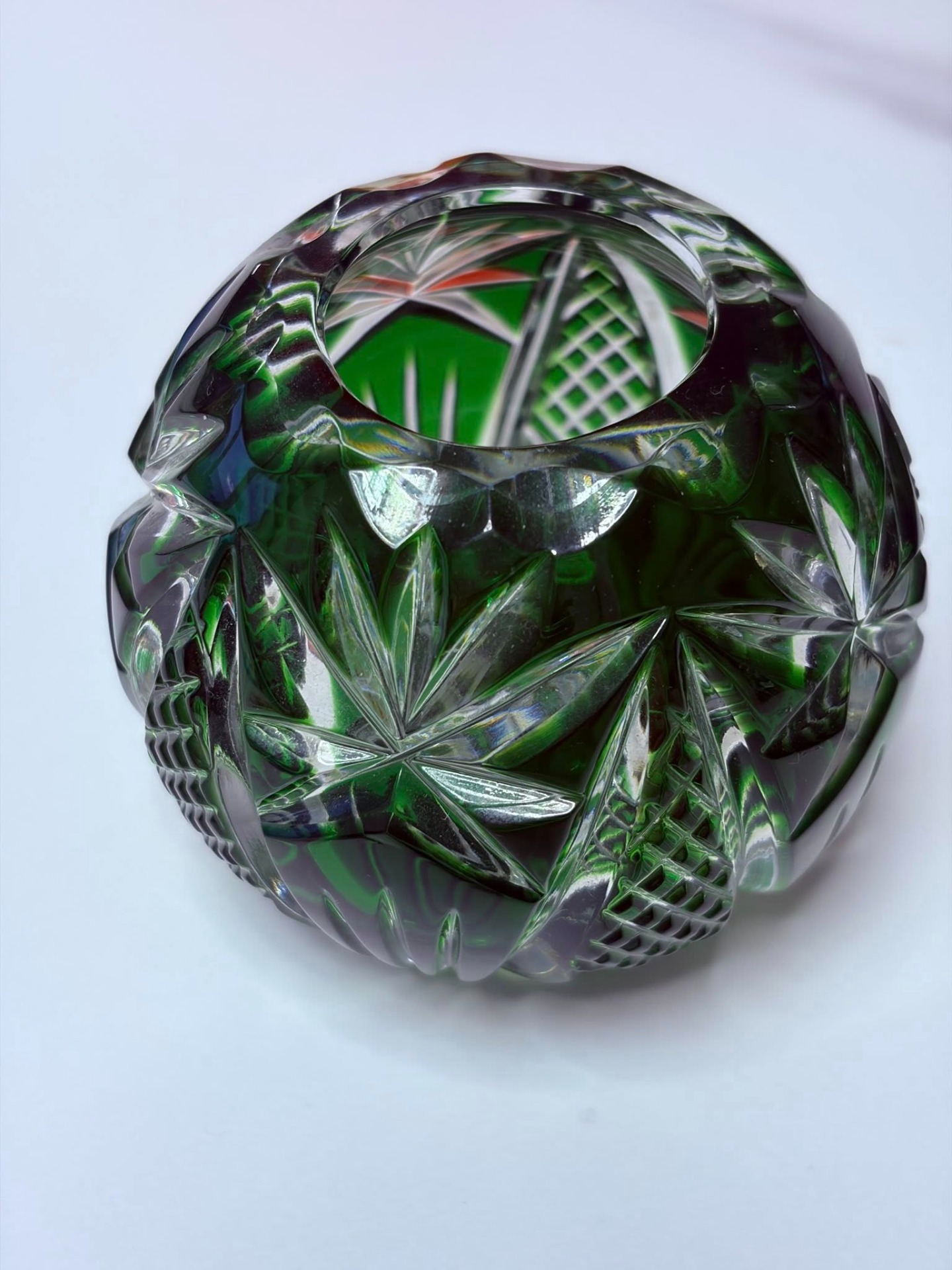 Bol vintage (Rose Bowl) din cristal de Bohemia verde smarald tăiat manual, cu tăieturi geometrice adânci și complexe (model pinwheel/morișcă, evantai și elemente de caroiaj) care reflectă lumina spectaculos și baza decorată cu o stea.