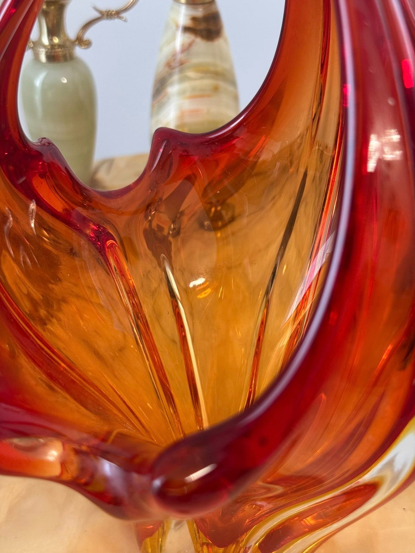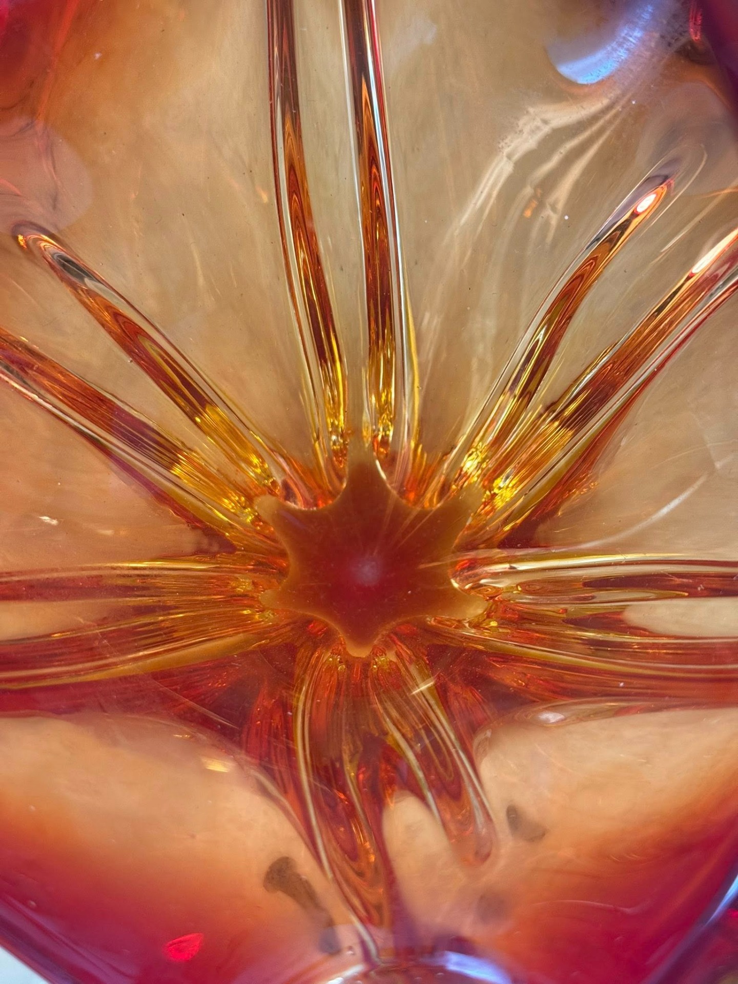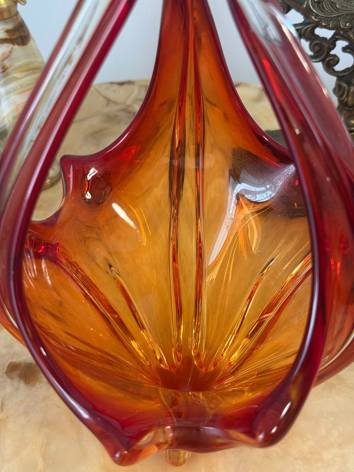 Piesa prezintă nuanțe de chihlimbar (amber) și roșu purpuriu, care radiază din centrul vasului către margini, creând un efect de "foc