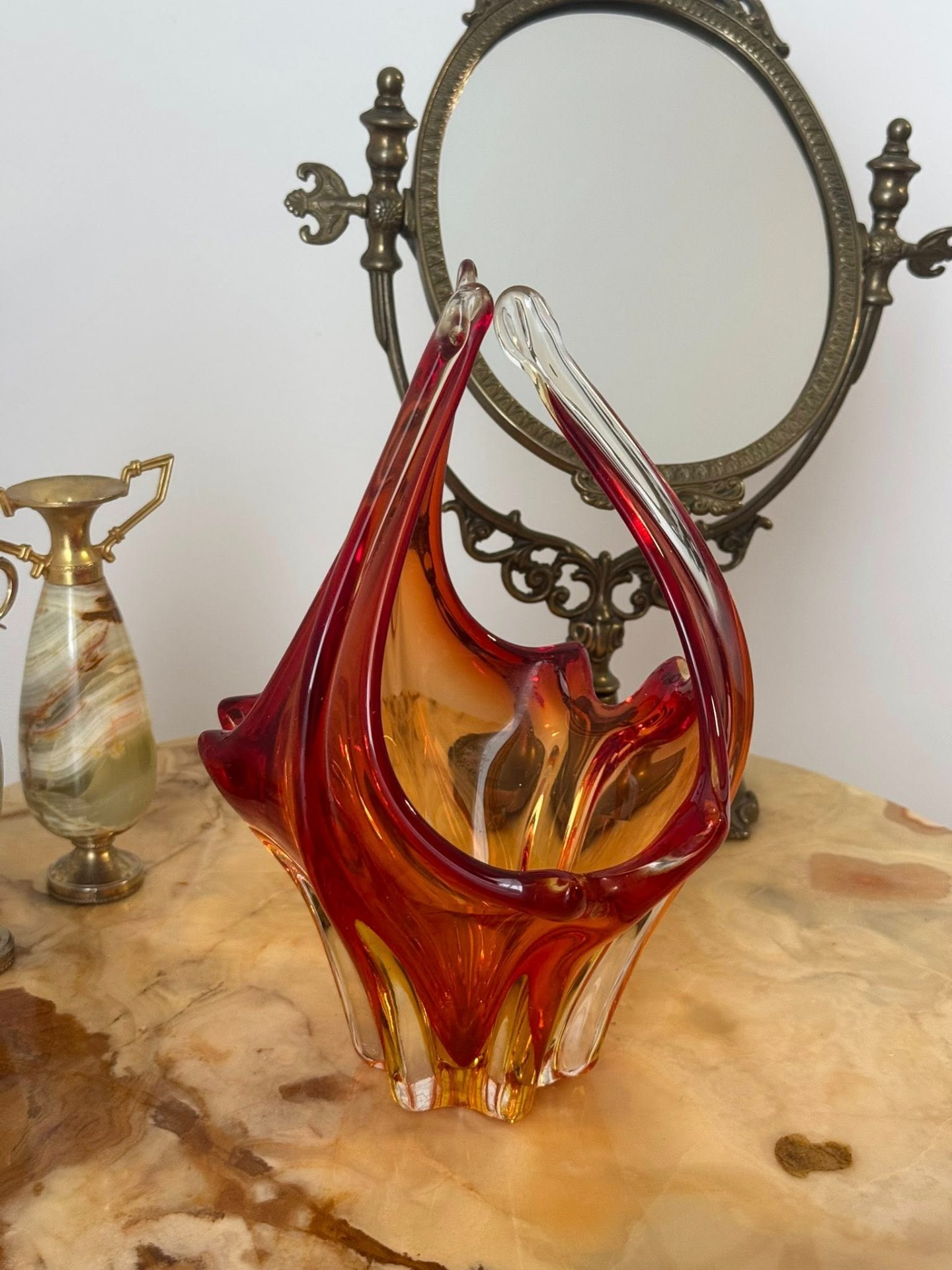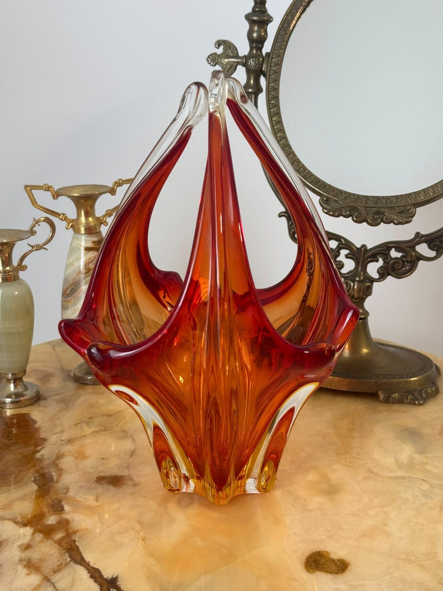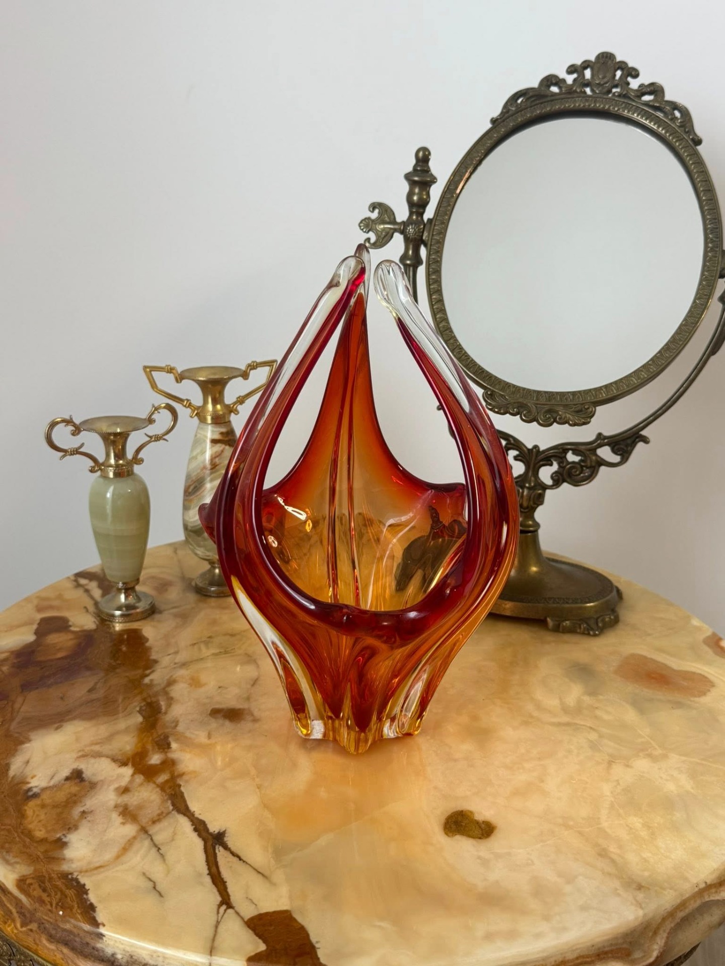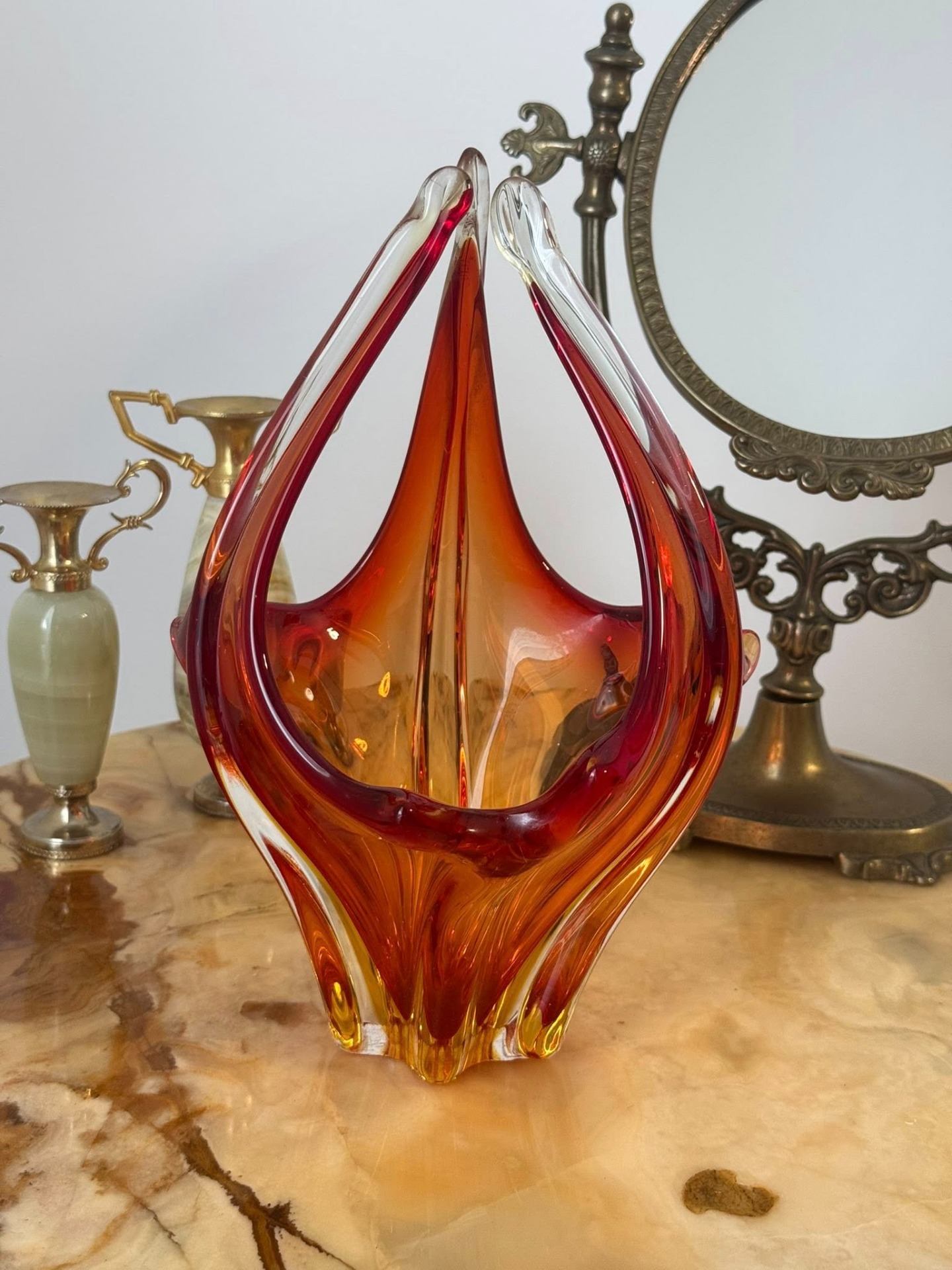 Piesa prezintă nuanțe de chihlimbar (amber) și roșu purpuriu, care radiază din centrul vasului către margini, creând un efect de "foc