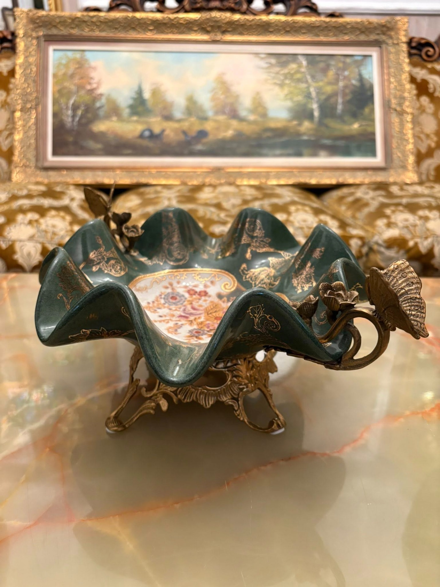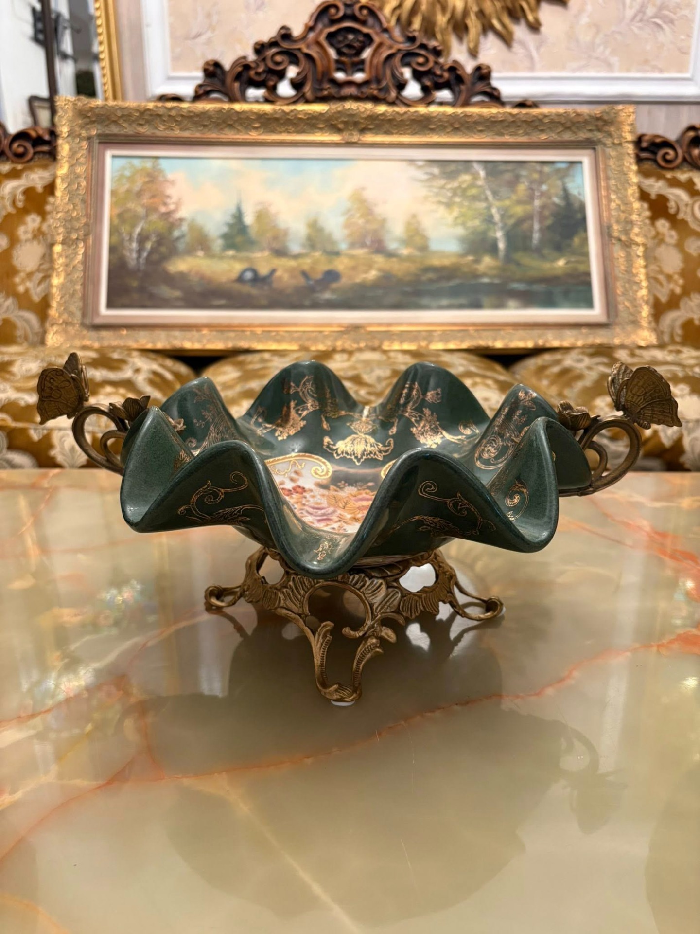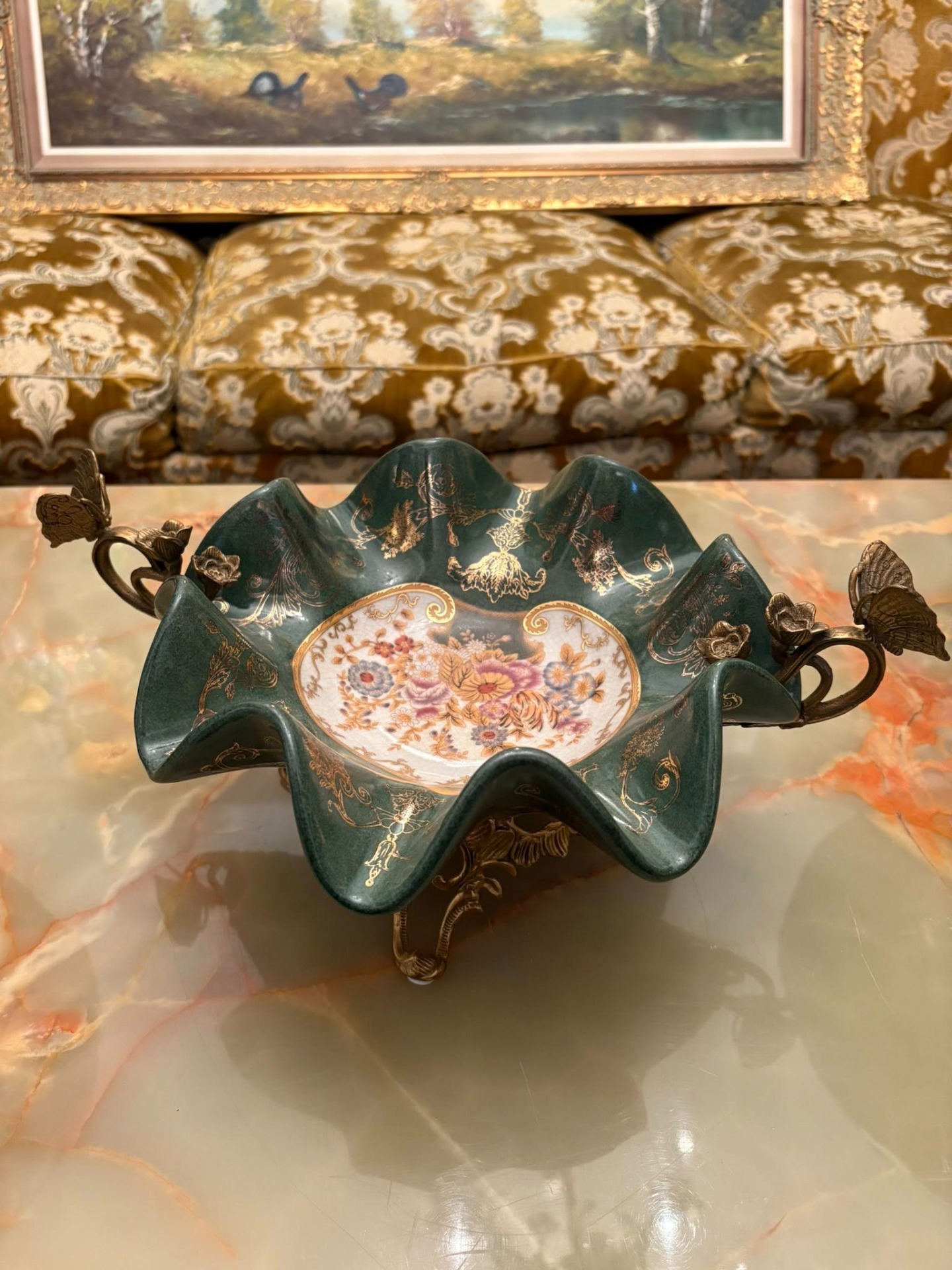 Bomboniera decorativa vintage din porțelan și bronz, cu suport metalic ornamentat, formă ondulată și decorațiuni florale pictate, accentuate cu detalii