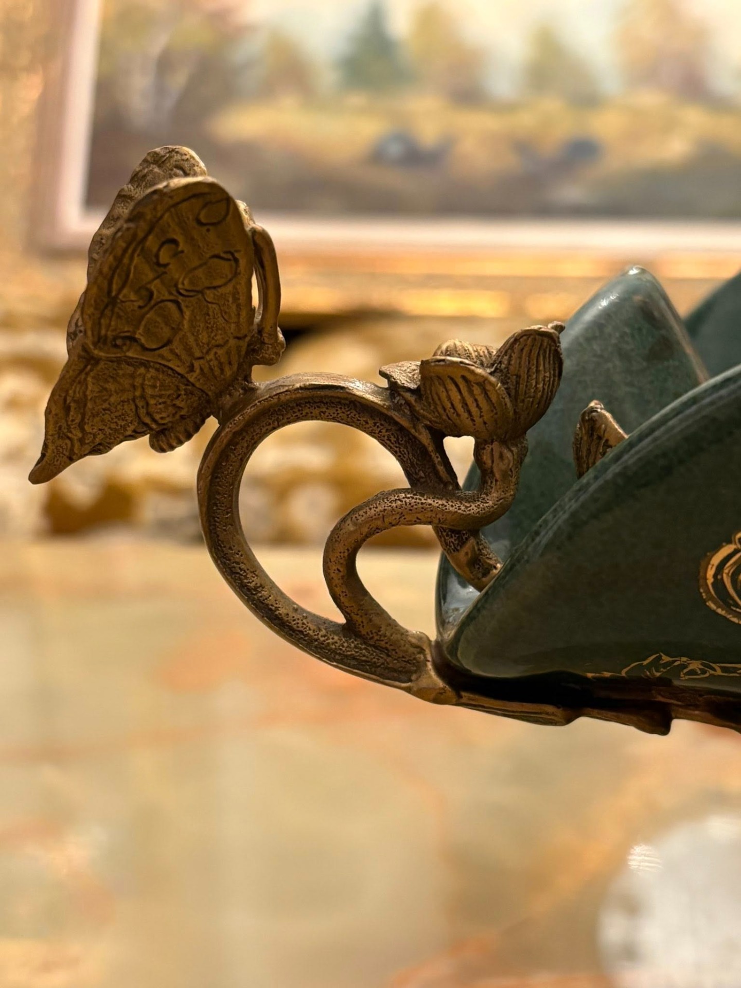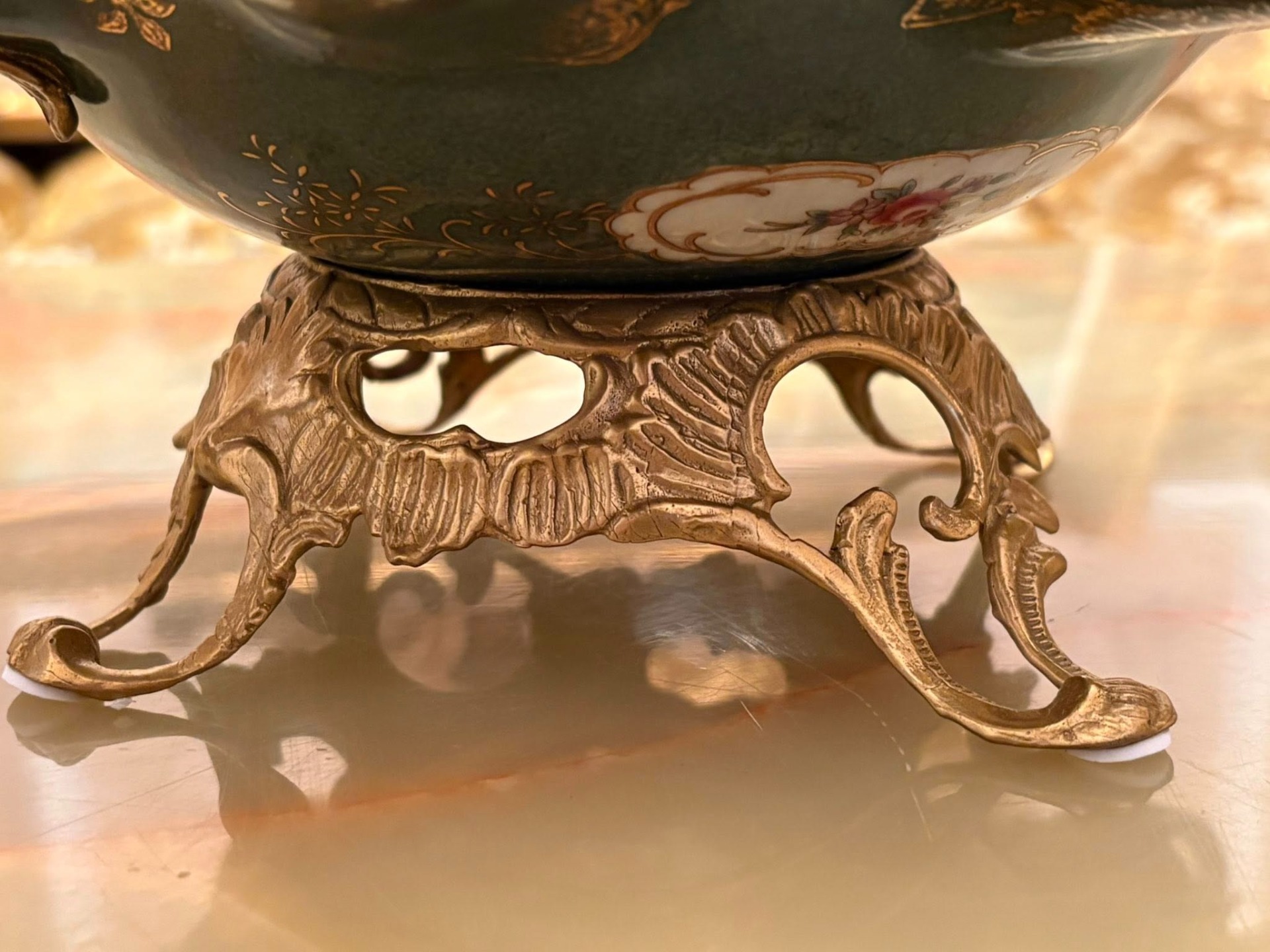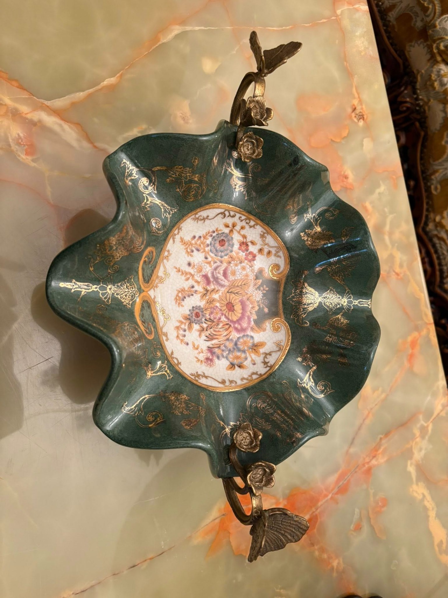 Bomboniera decorativa vintage din porțelan și bronz, cu suport metalic ornamentat, formă ondulată și decorațiuni florale pictate, accentuate cu detalii