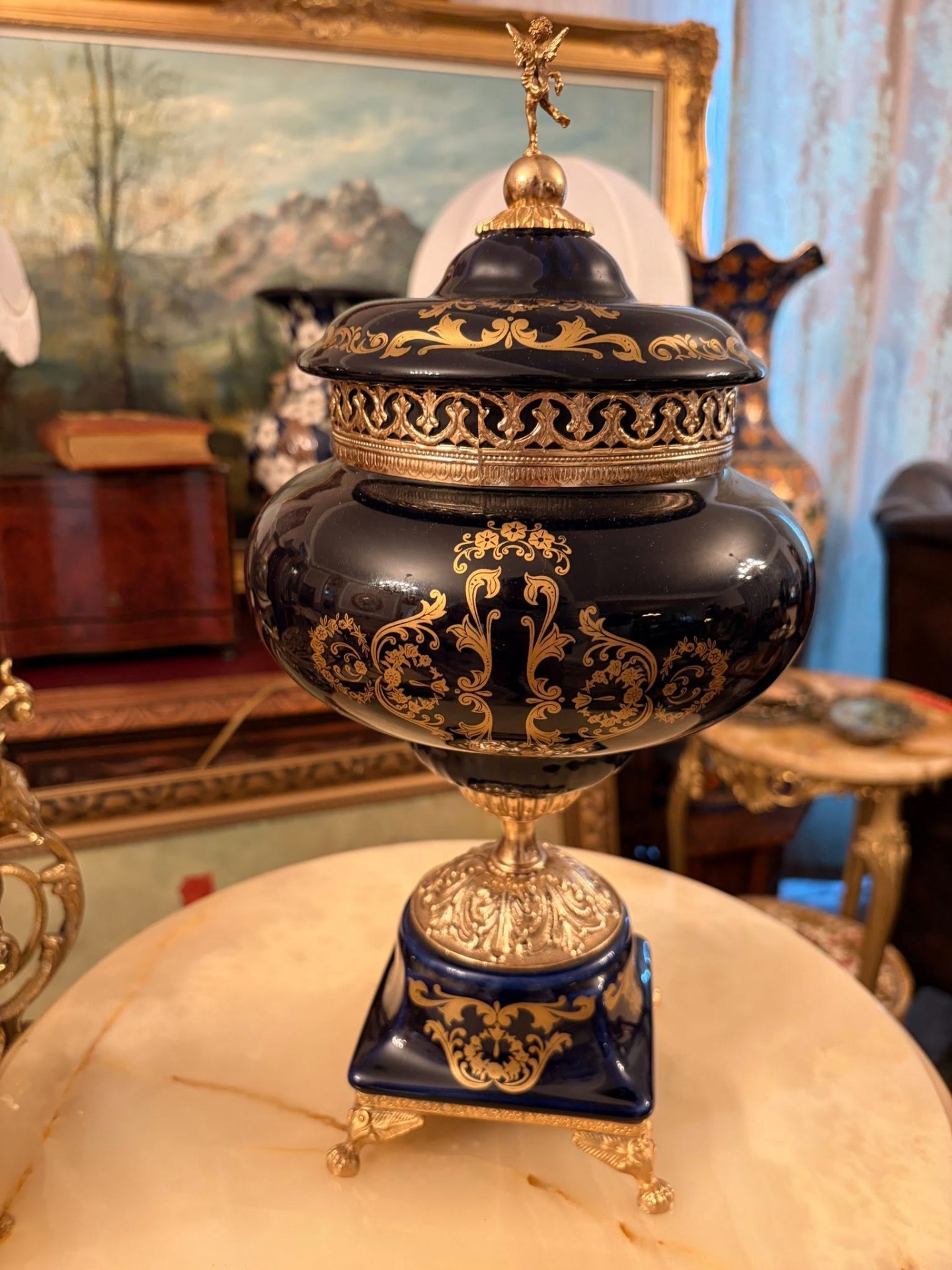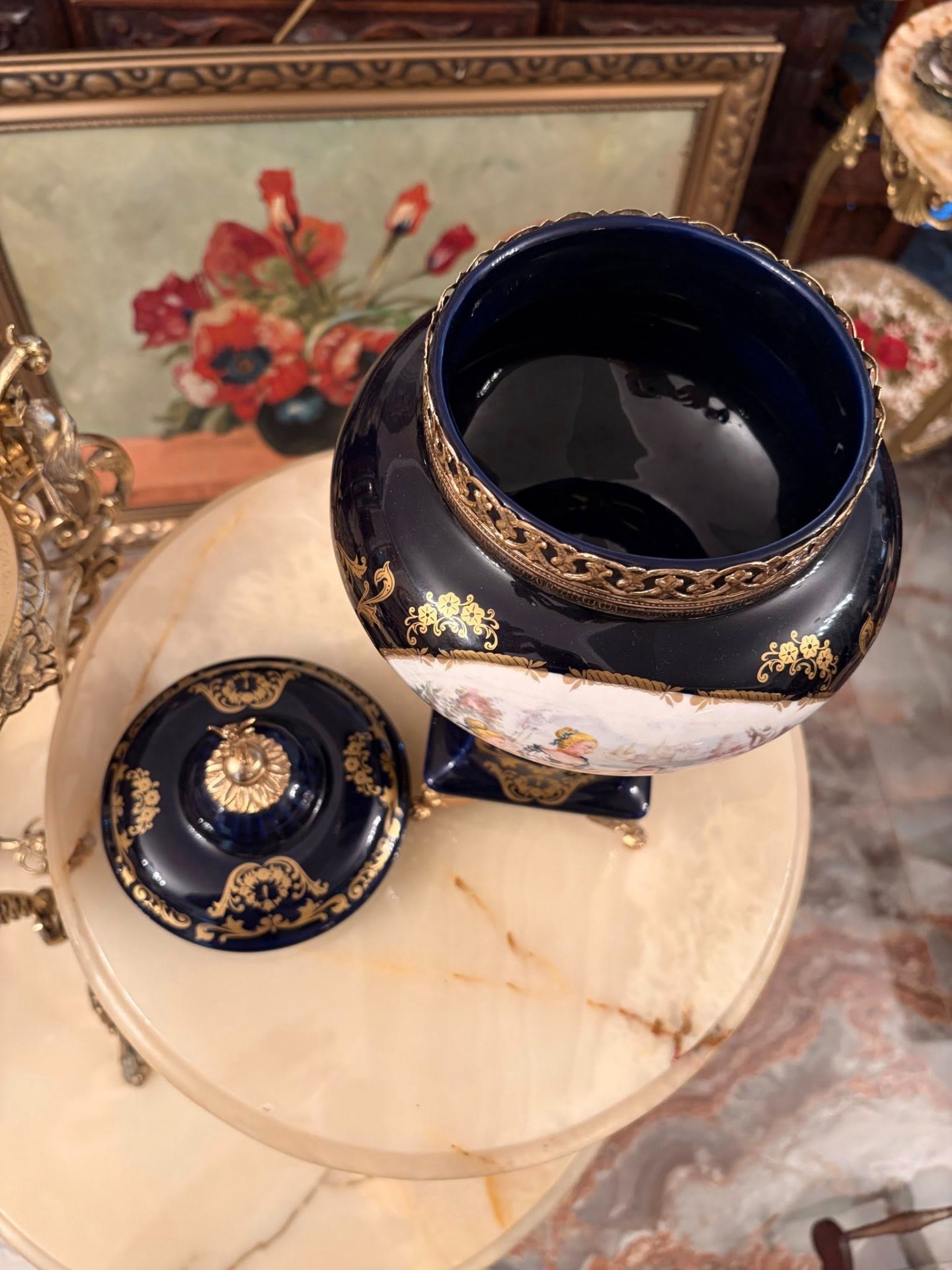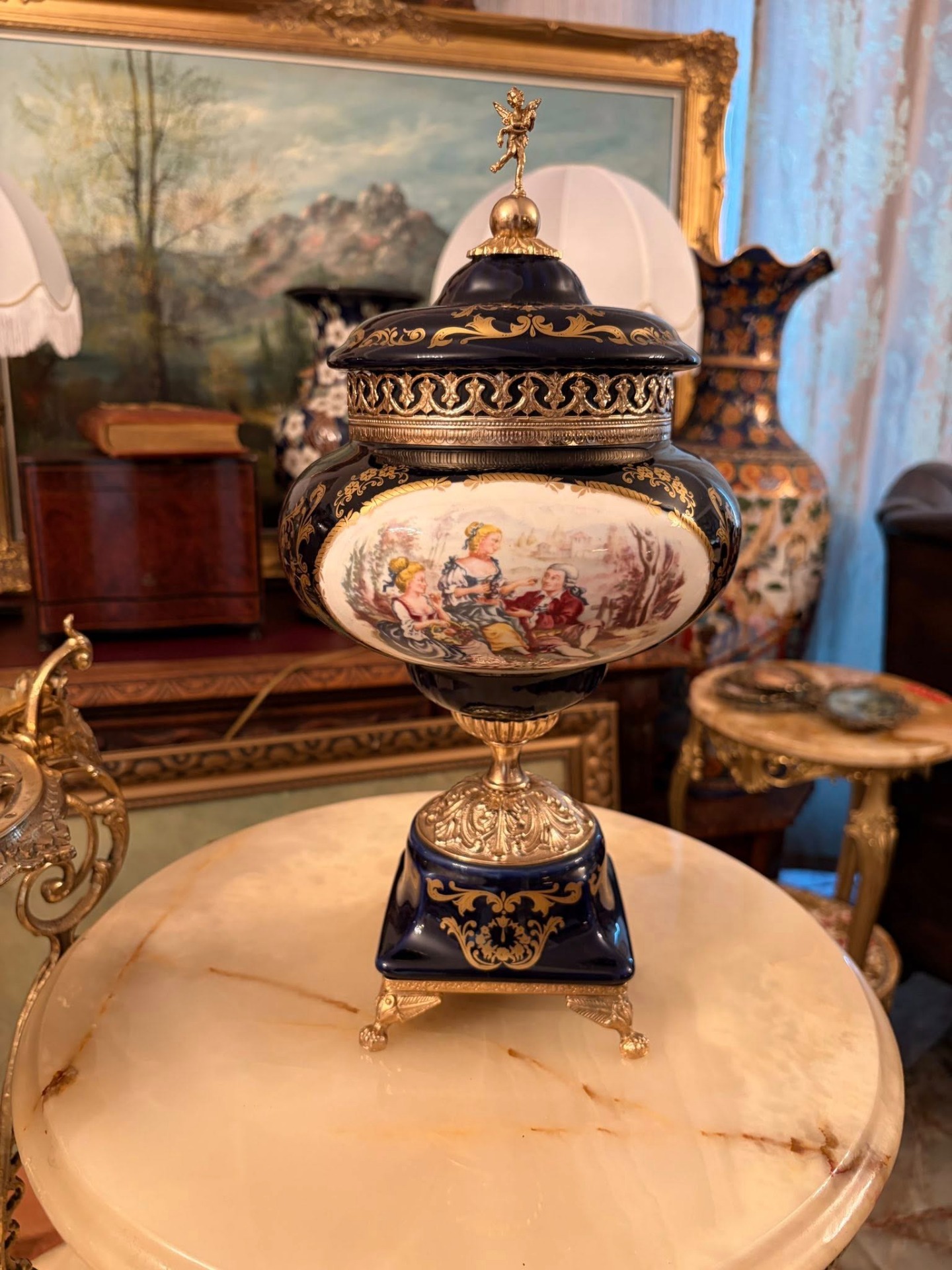 Bonbonieră Monumentală de Lux – Porțelan Cobalt, Bronz și Scenă Galantă