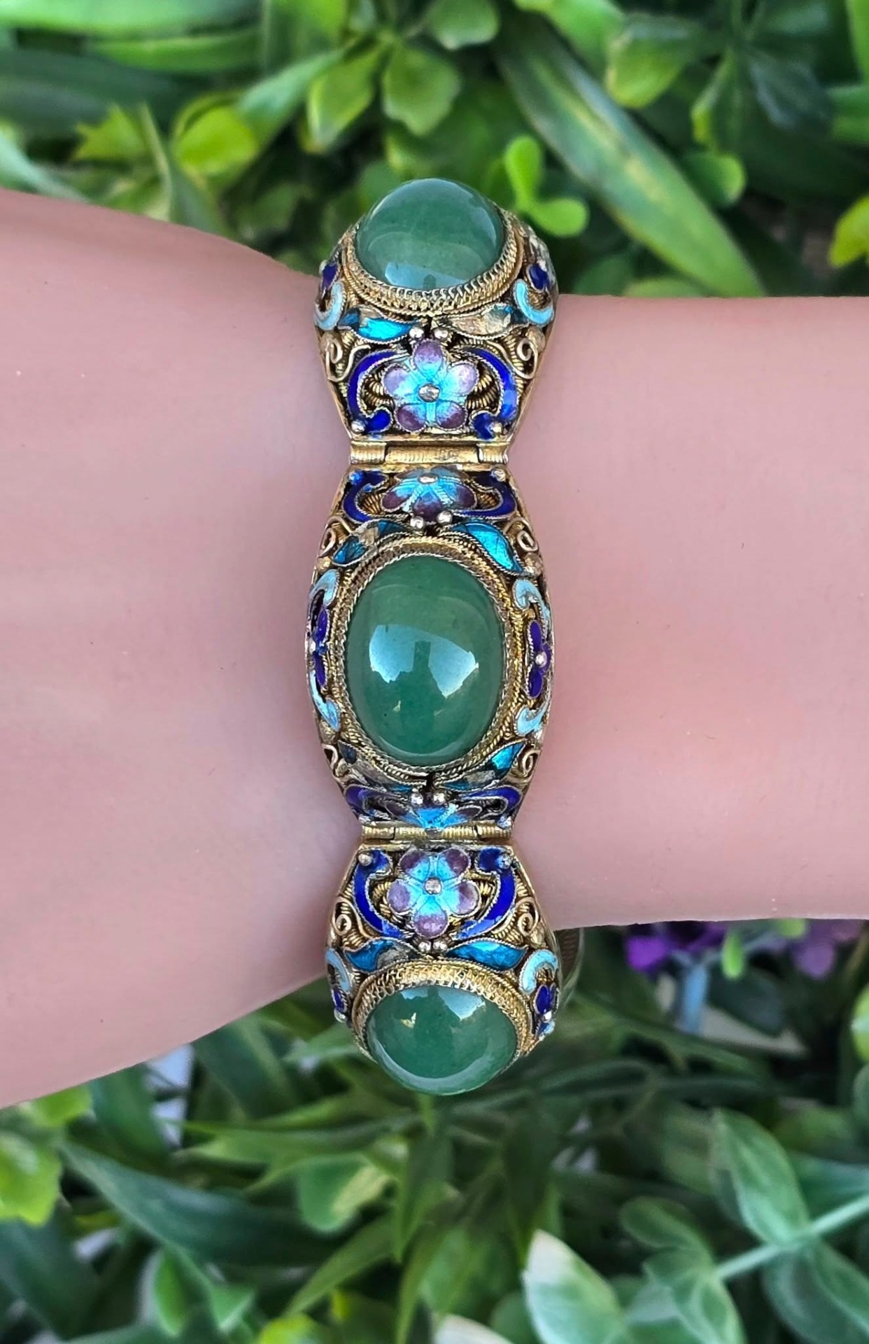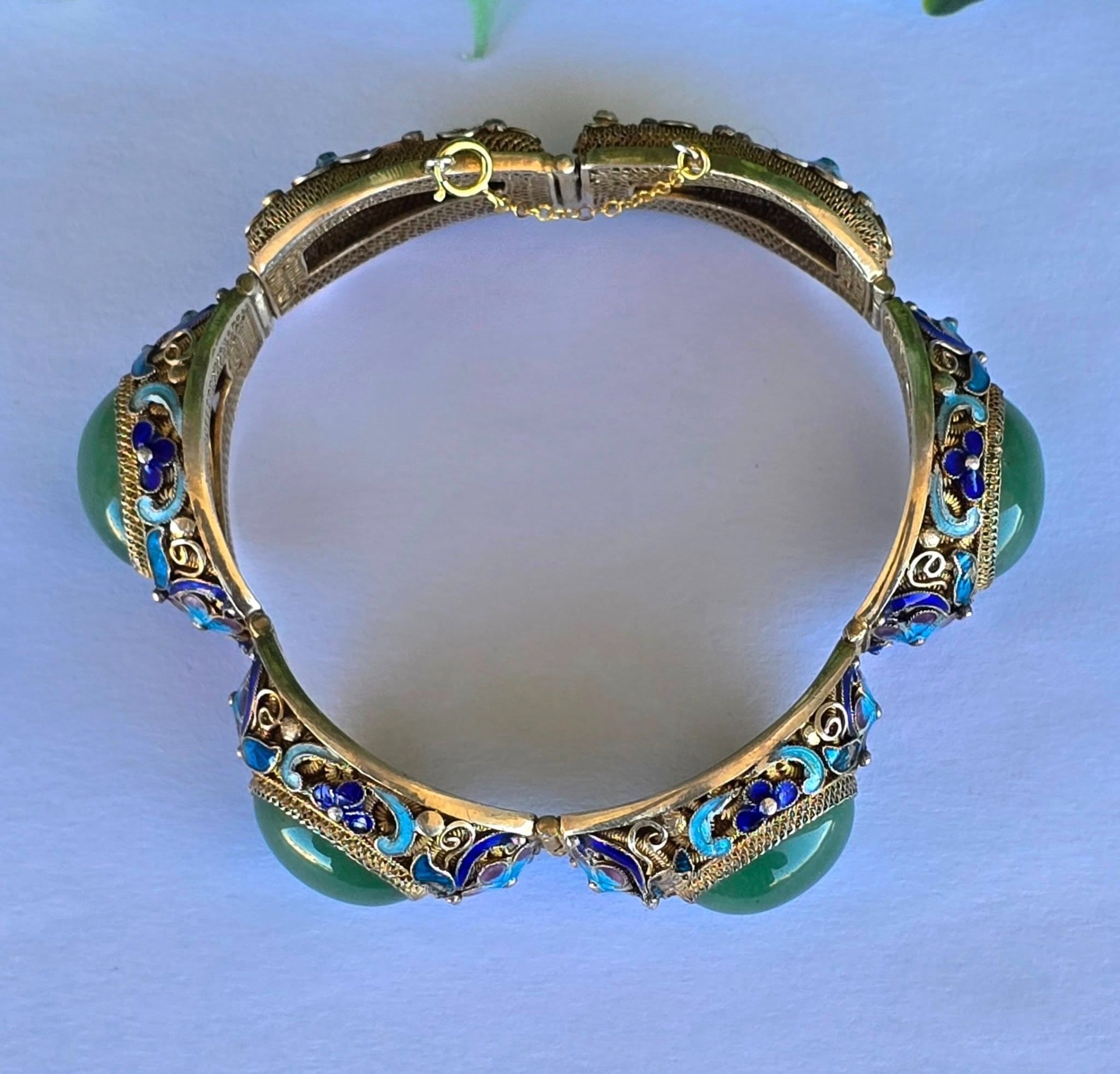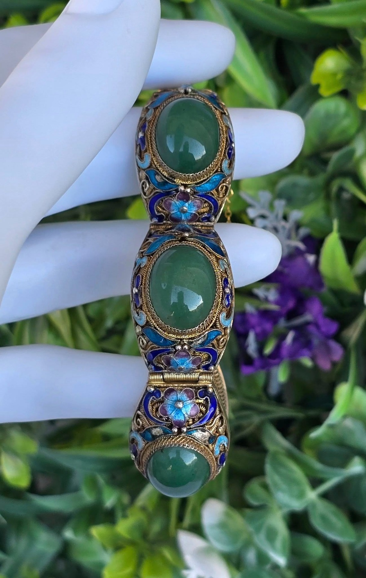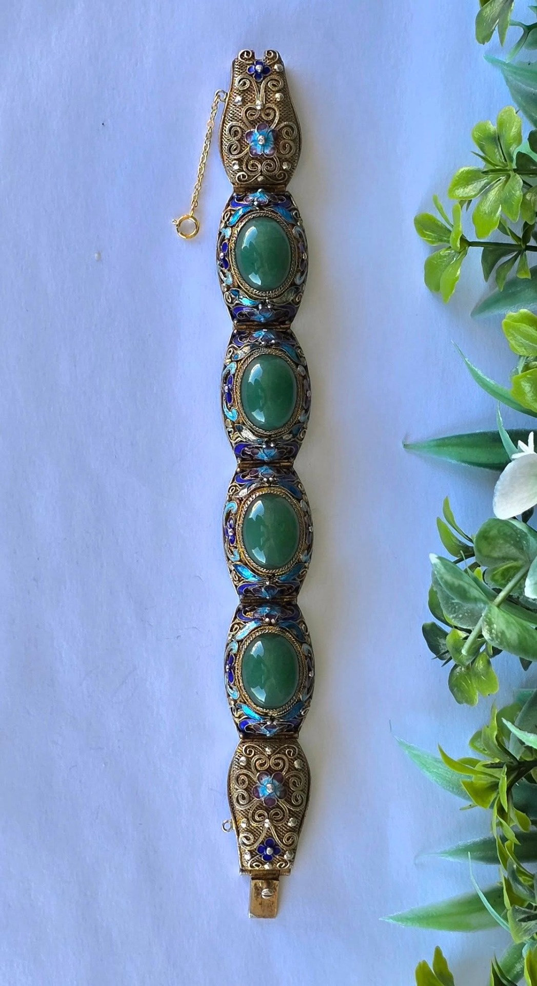Brățară Art Deco chinezească spectaculoasă, rară, de colecție, din argint aurit, cu cabochoane de jad natural și email manufactură "cloisonné" în filigran, în stare foarte bună (anii 1920-1930, China).