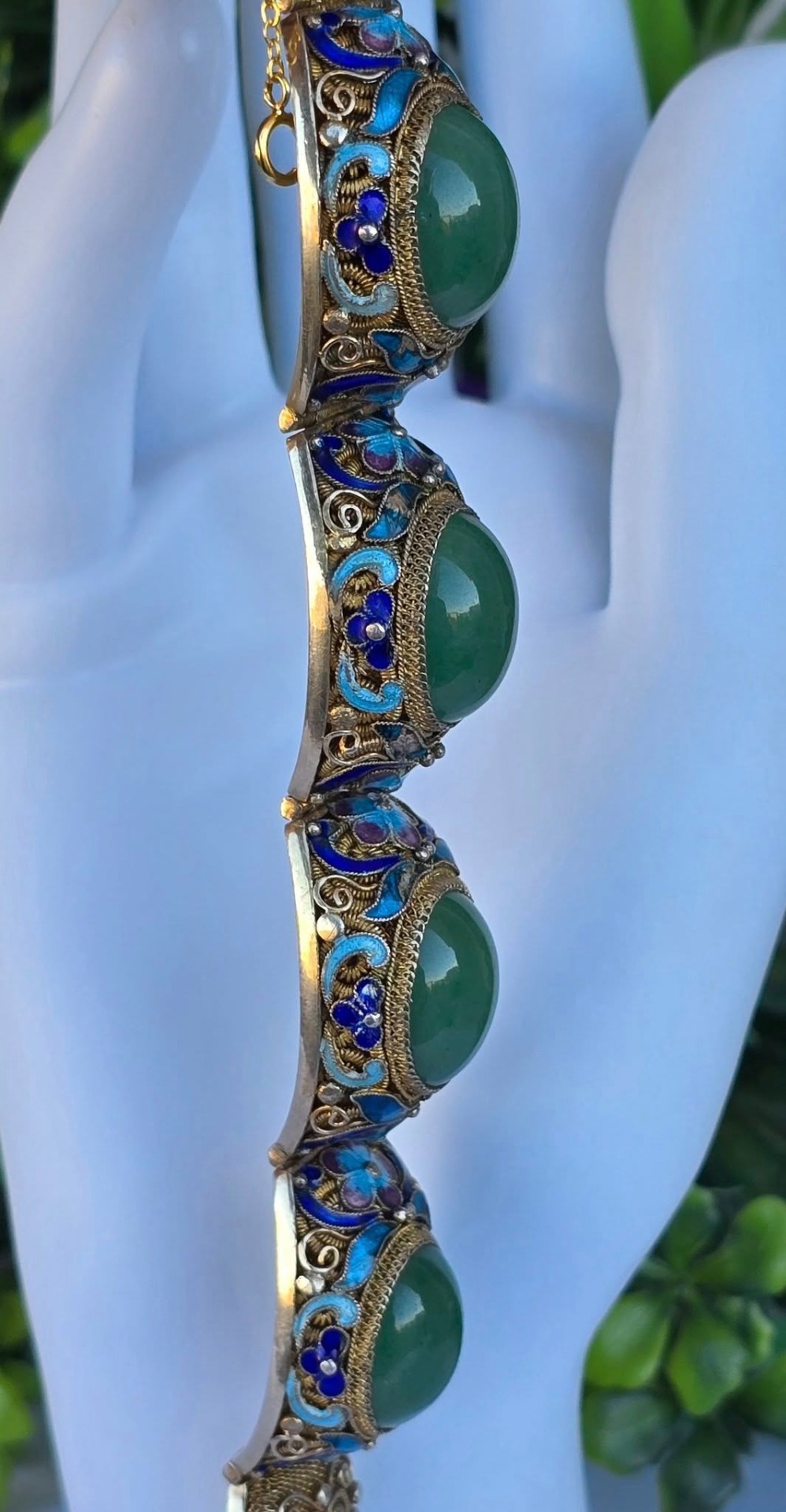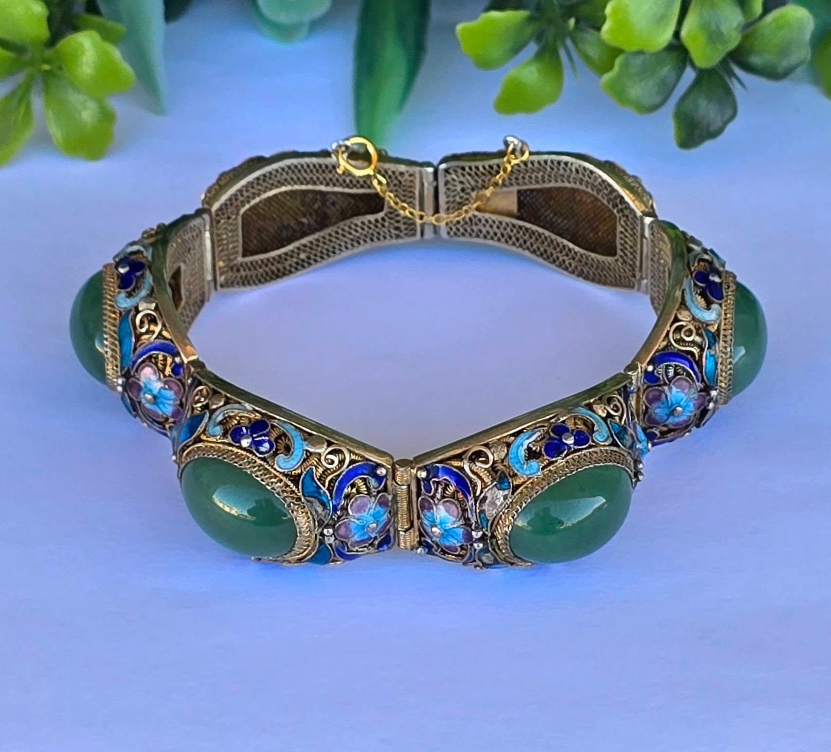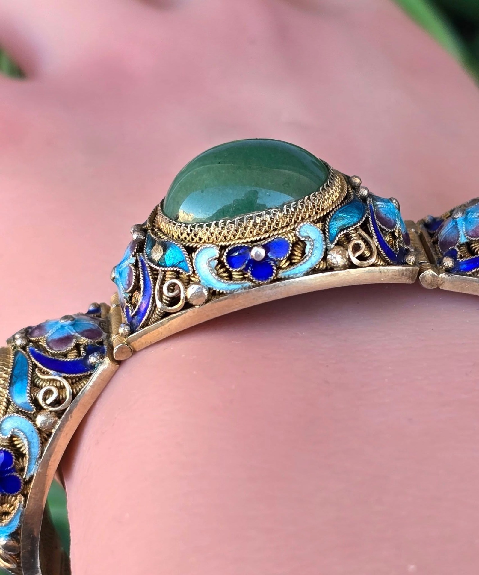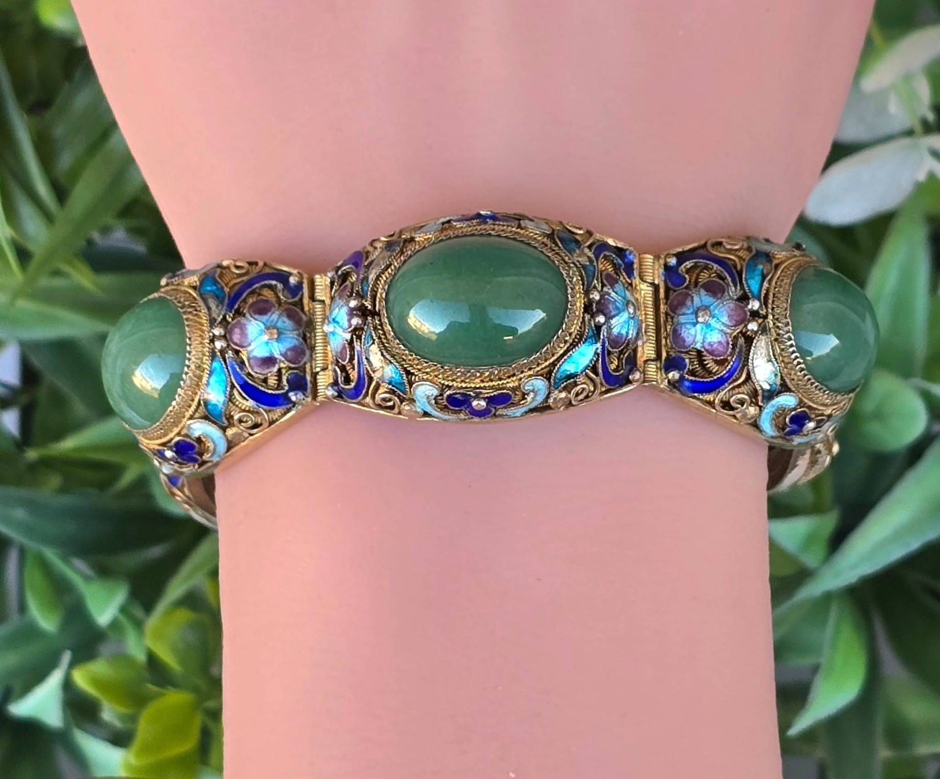 Brățară Art Deco chinezească spectaculoasă, rară, de colecție, din argint aurit, cu cabochoane de jad natural și email manufactură "cloisonné" în filigran, în stare foarte bună (anii 1920-1930, China).