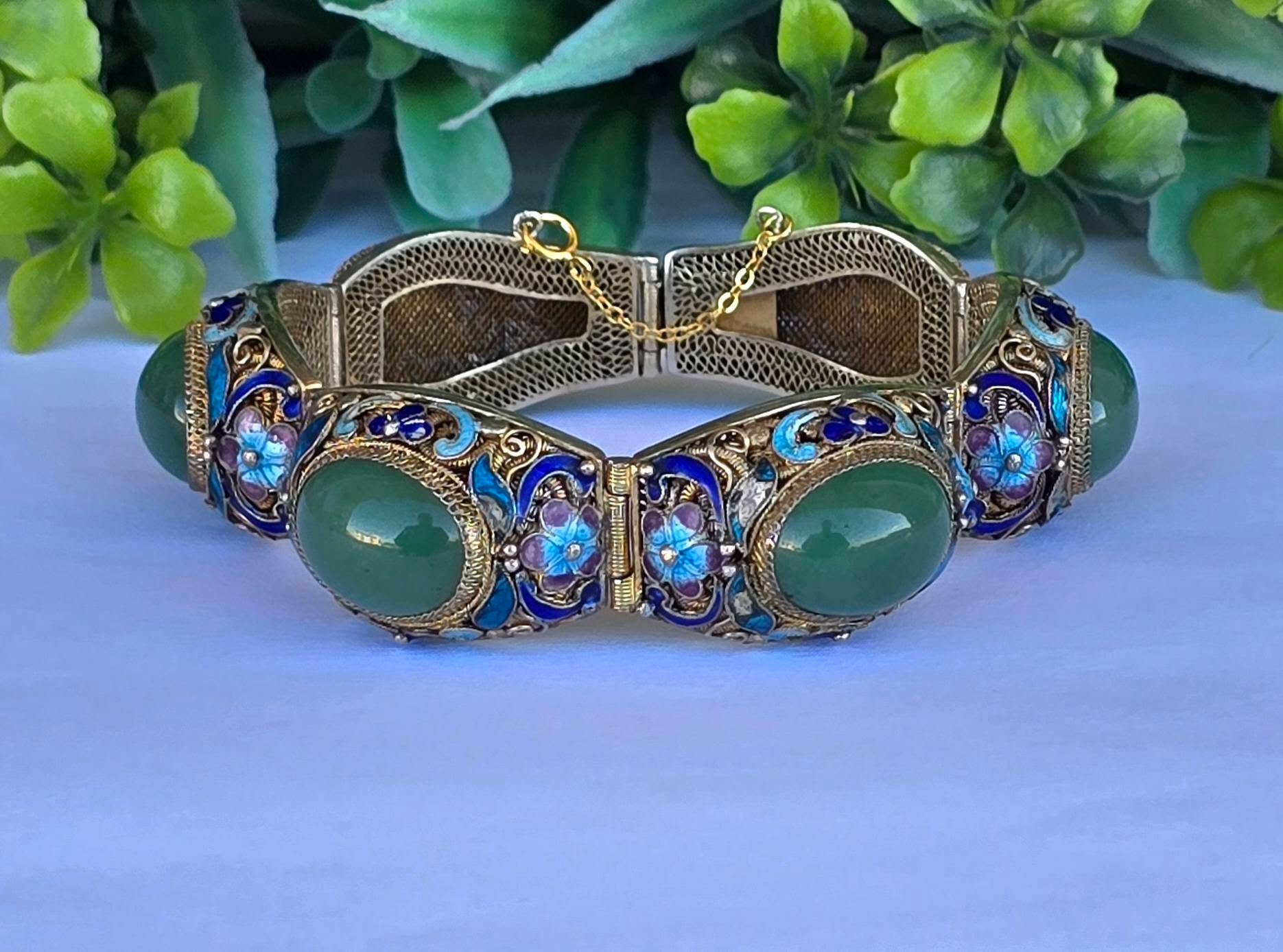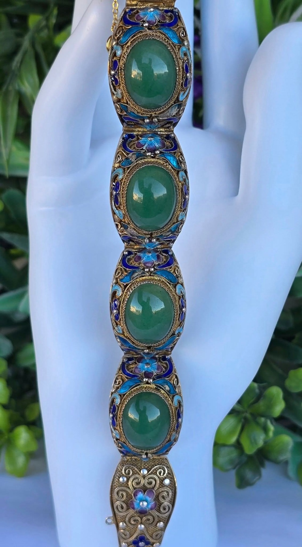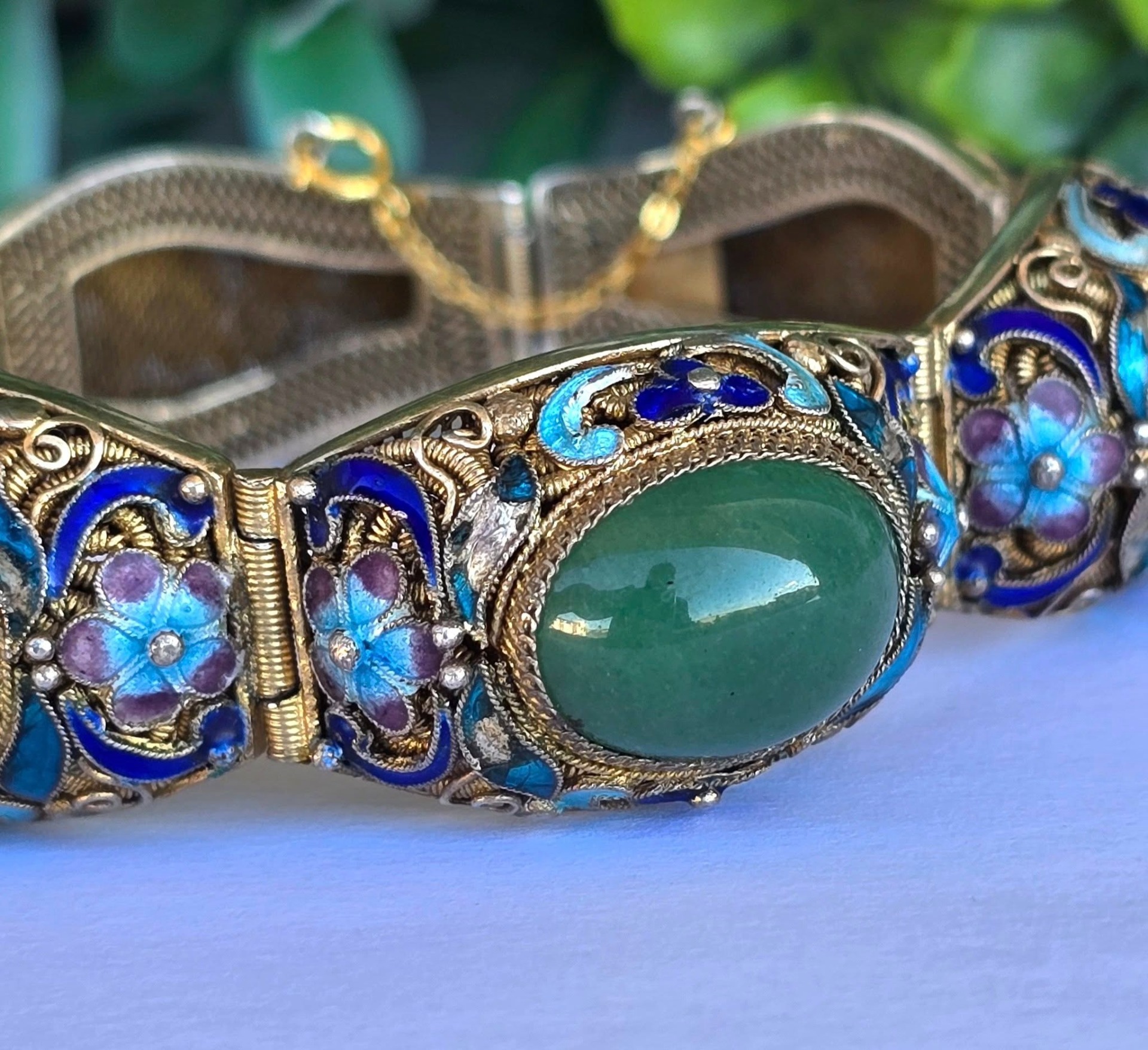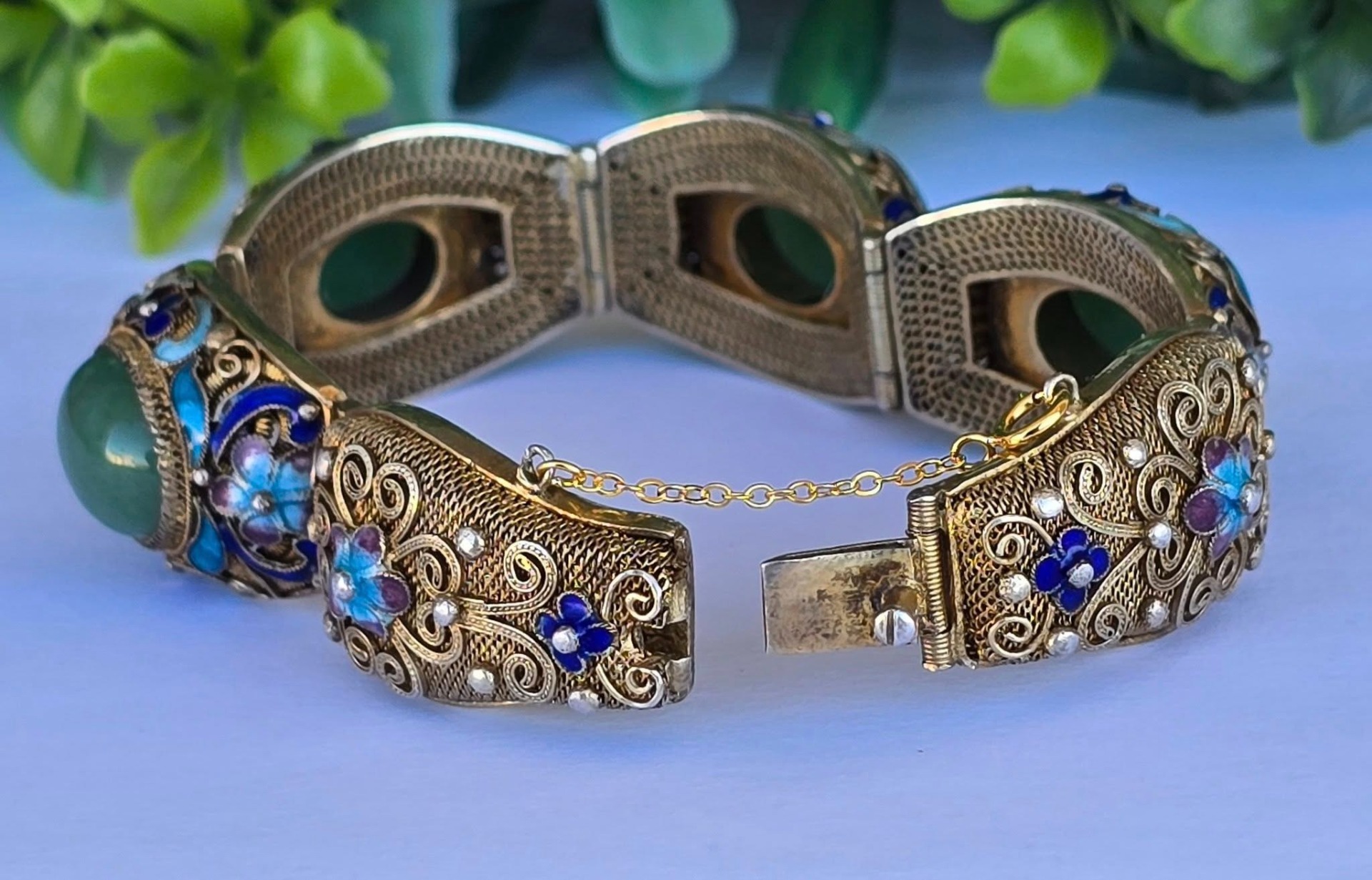 Brățară Art Deco chinezească spectaculoasă, rară, de colecție, din argint aurit, cu cabochoane de jad natural și email manufactură "cloisonné" în filigran, în stare foarte bună (anii 1920-1930, China).
