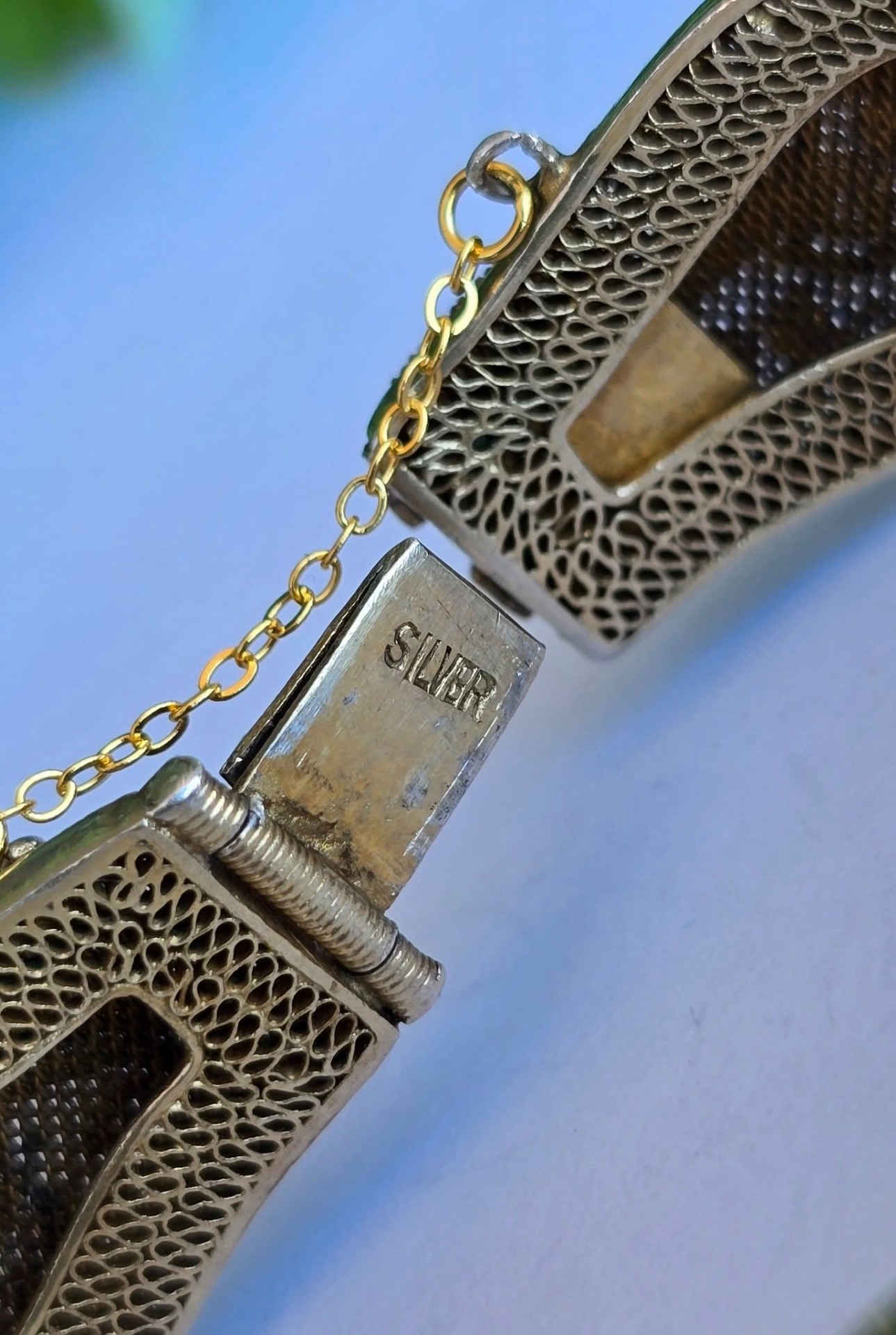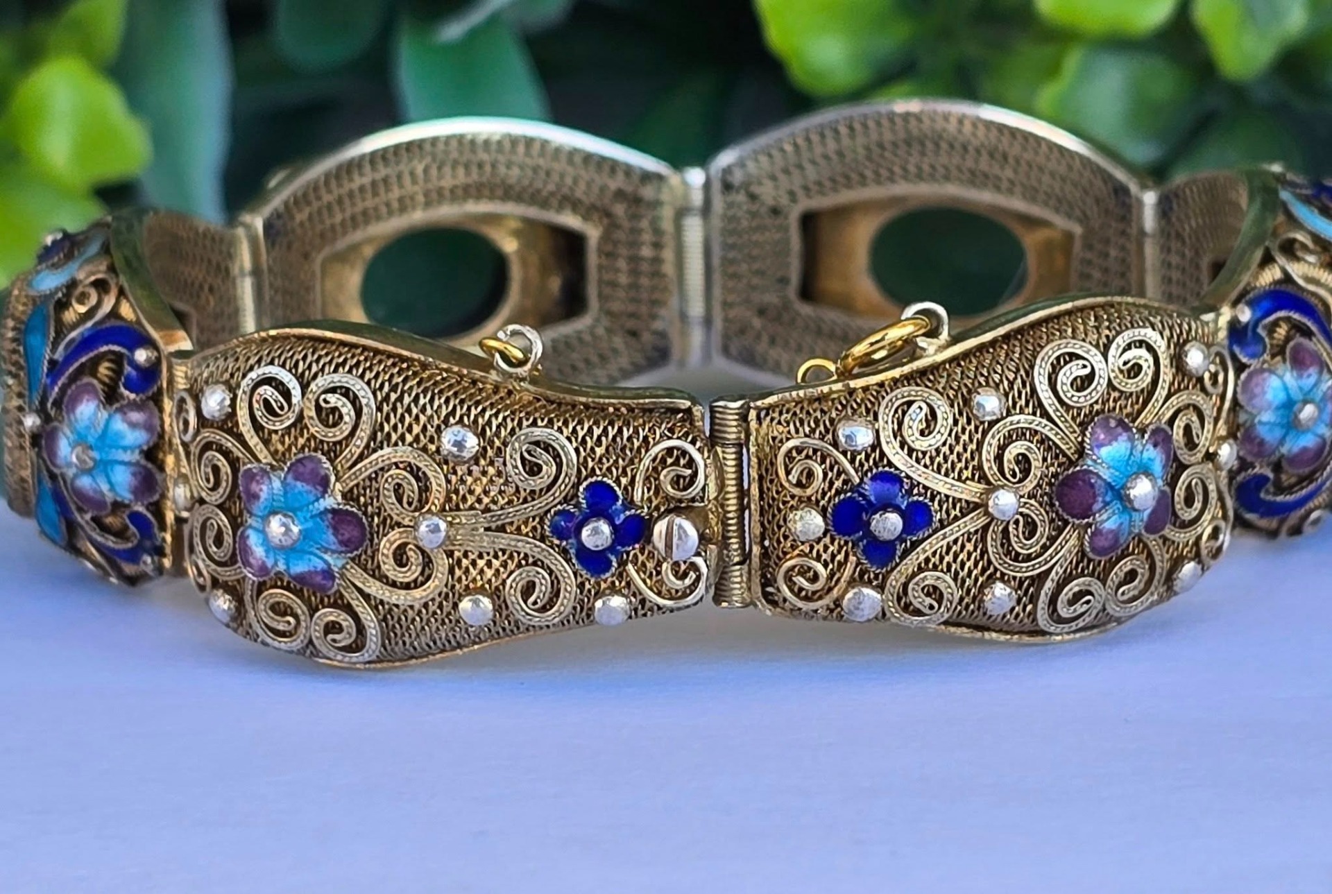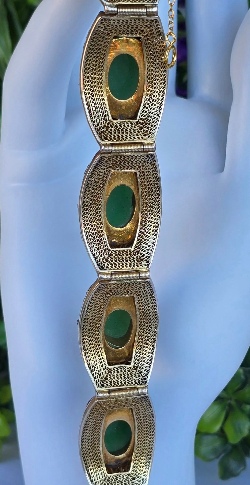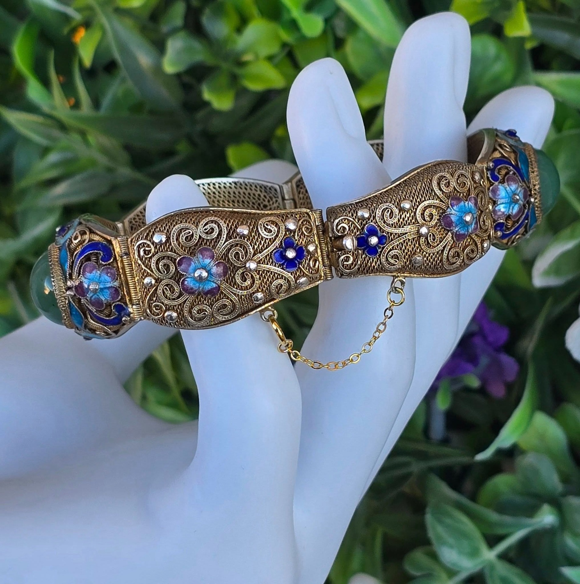 Brățară Art Deco chinezească spectaculoasă, rară, de colecție, din argint aurit, cu cabochoane de jad natural și email manufactură "cloisonné" în filigran, în stare foarte bună (anii 1920-1930, China).