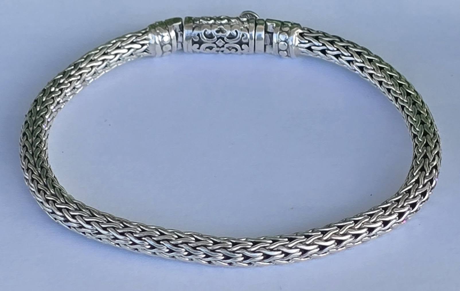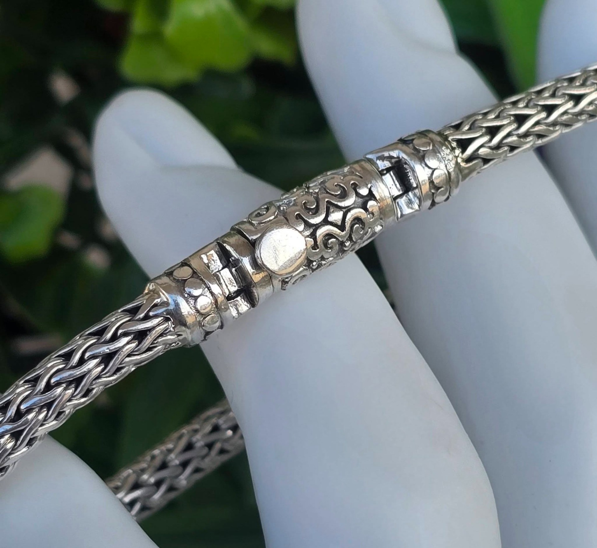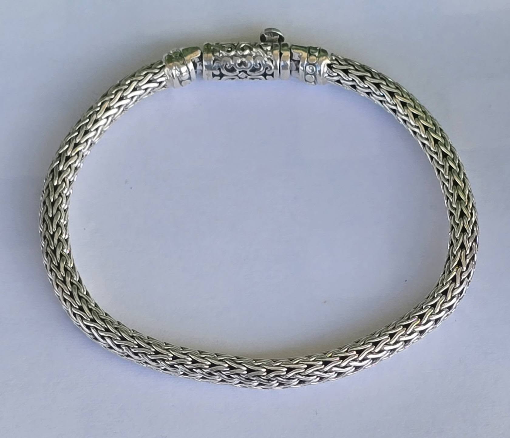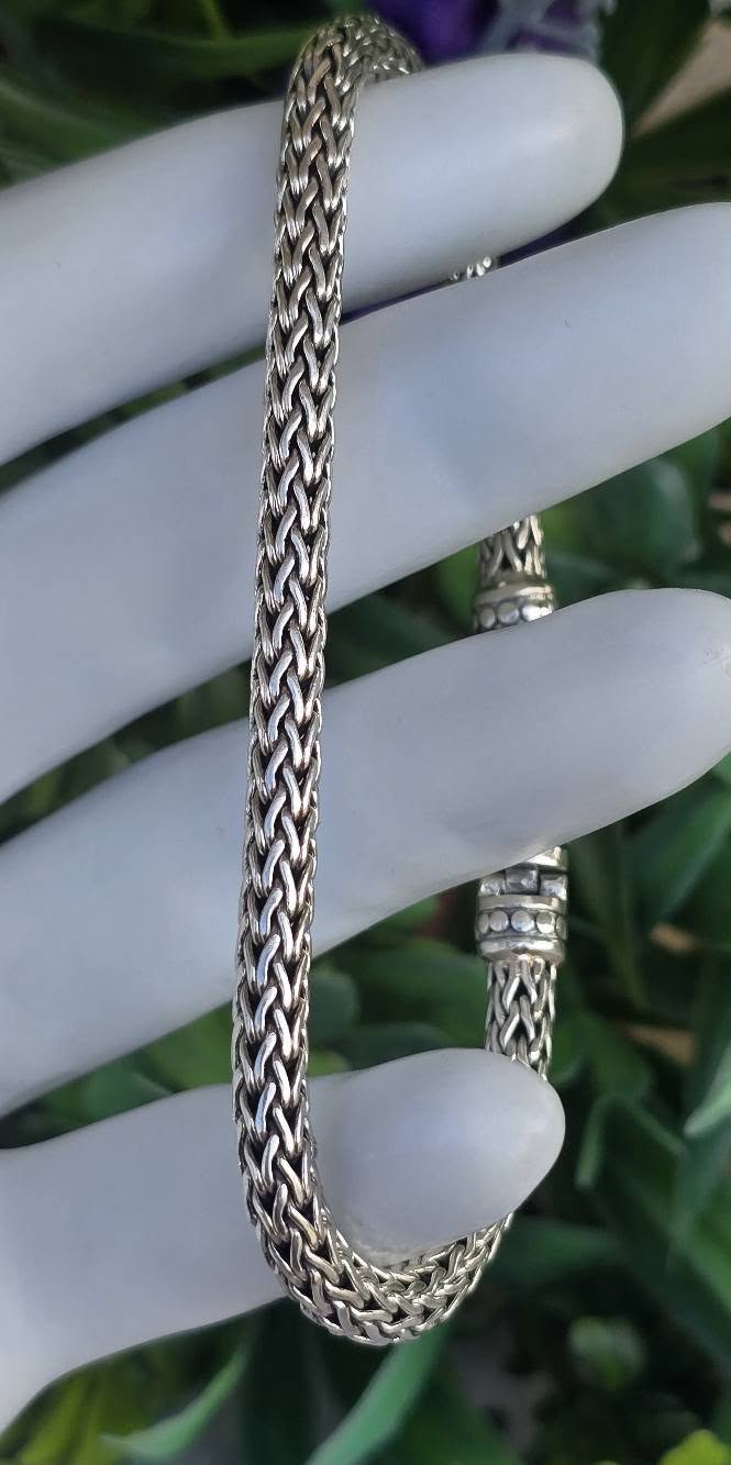 Brățară balineză veche, din argint, cu împletitură complexă "Borobudur", cunoscută și ca "dragon bone" (os de dragon), cu design robust dar flexibil, oferind o senzație grea și luxoasă la purtare (anii 1980-1990, Bali, Indonezia).