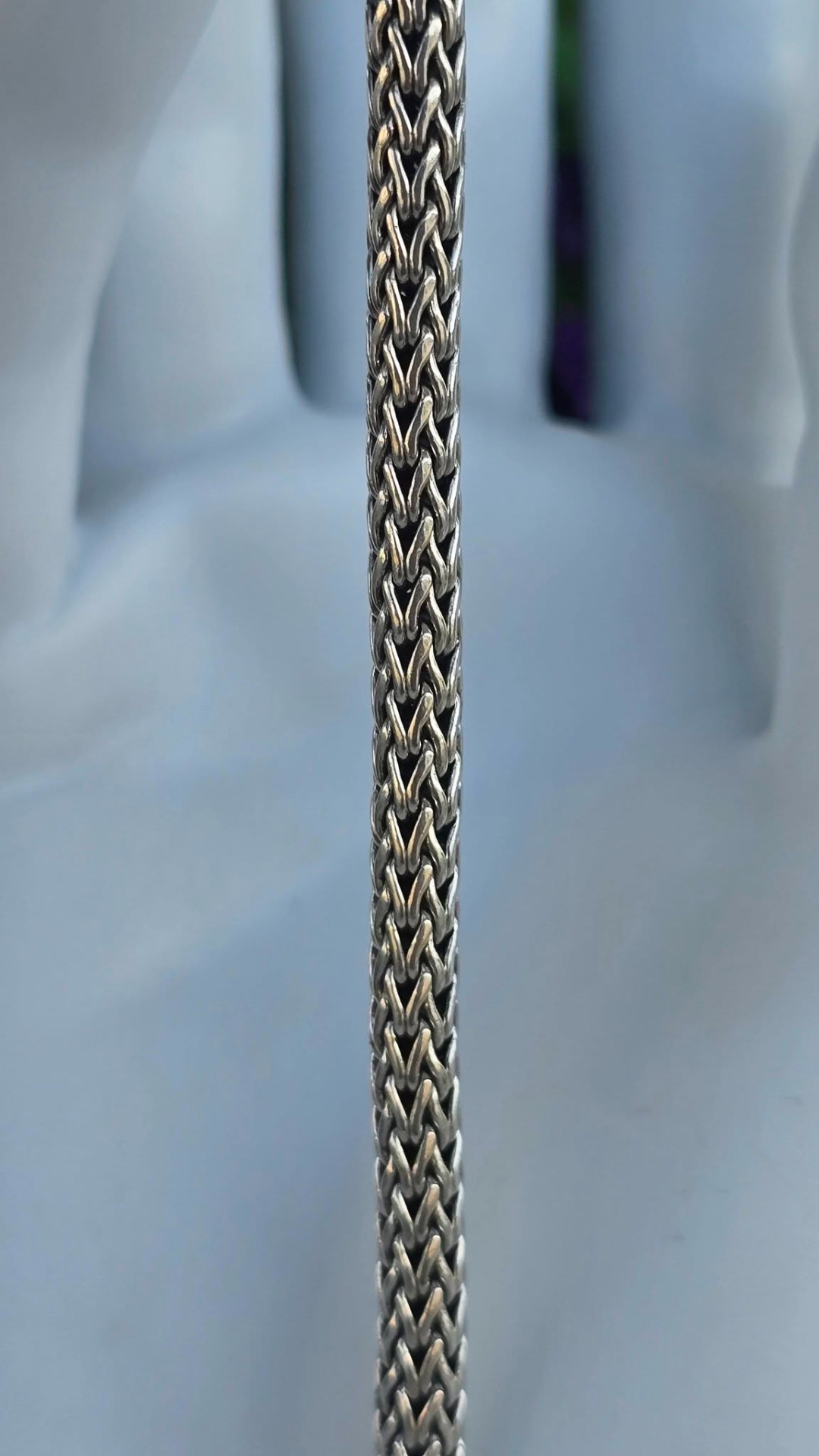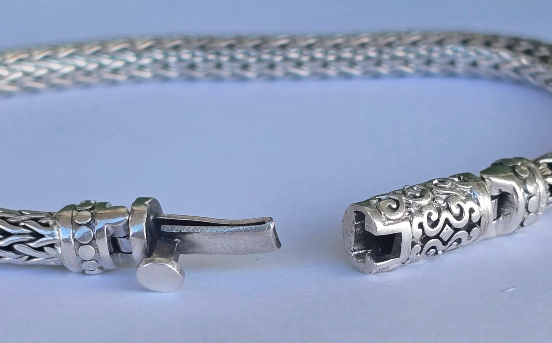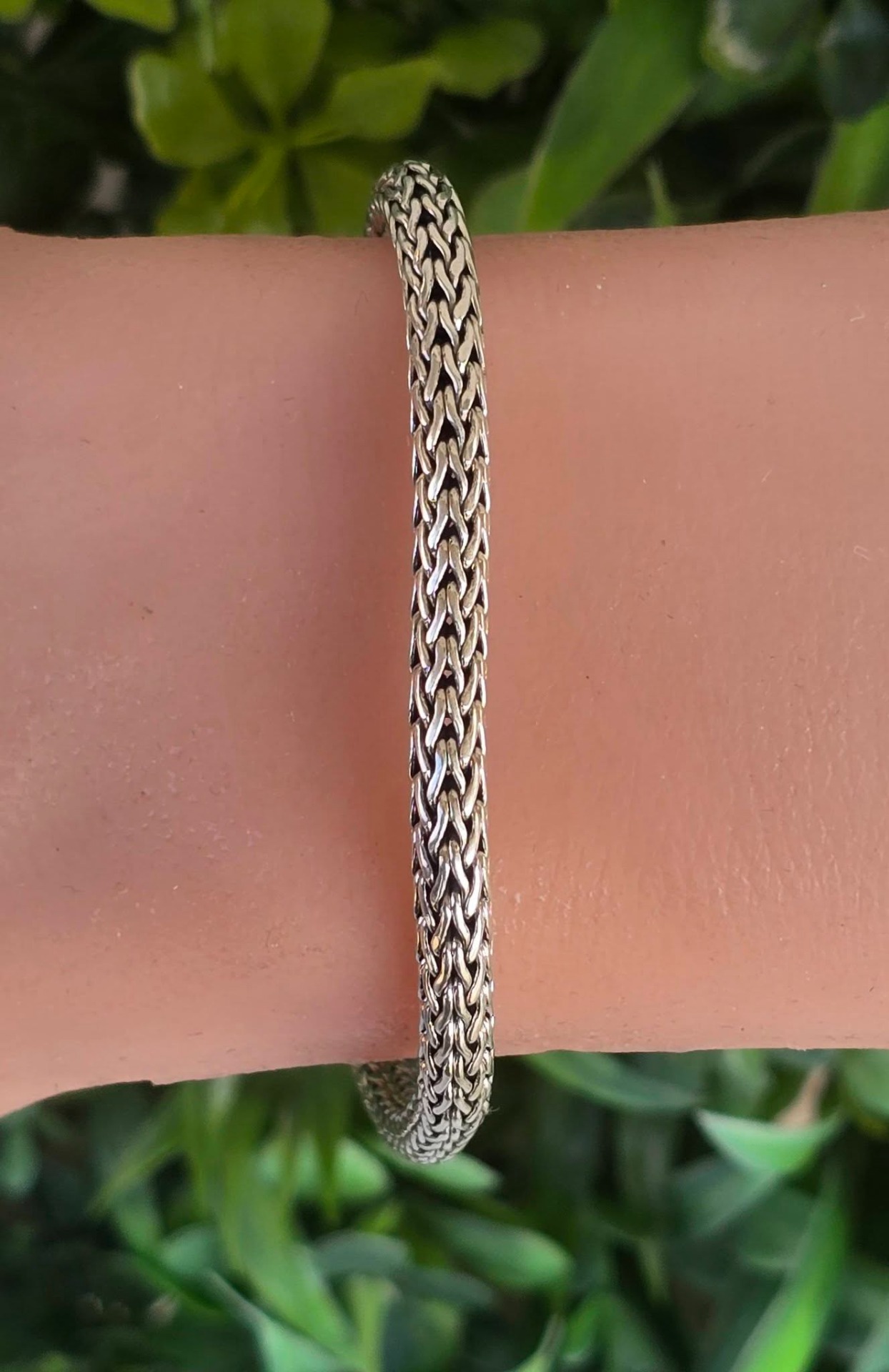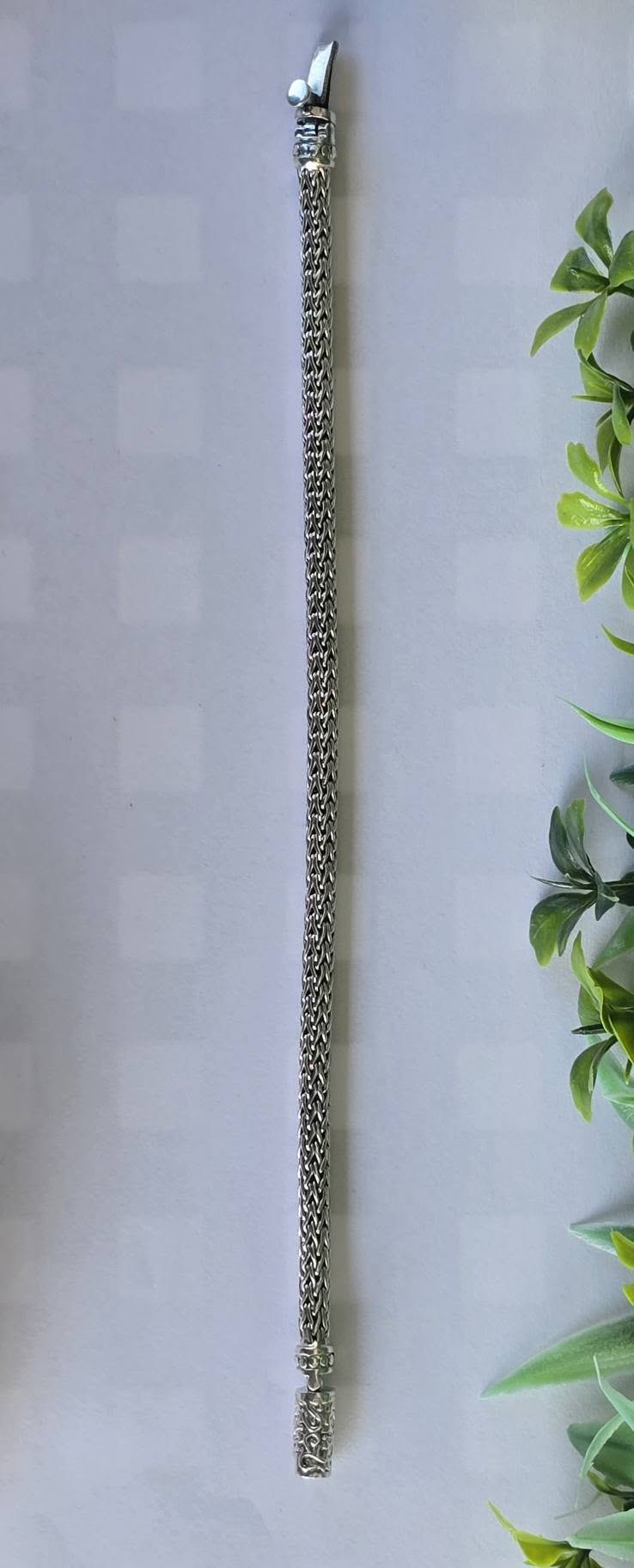 Brățară balineză veche, din argint, cu împletitură complexă "Borobudur", cunoscută și ca "dragon bone" (os de dragon), cu design robust dar flexibil, oferind o senzație grea și luxoasă la purtare (anii 1980-1990, Bali, Indonezia).