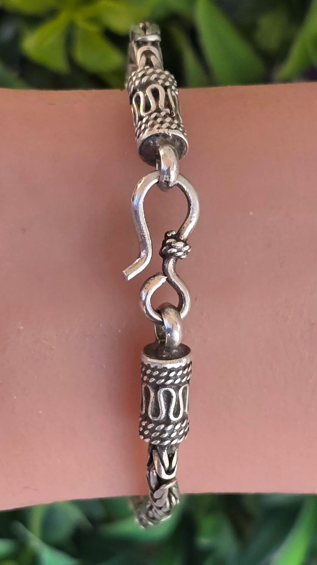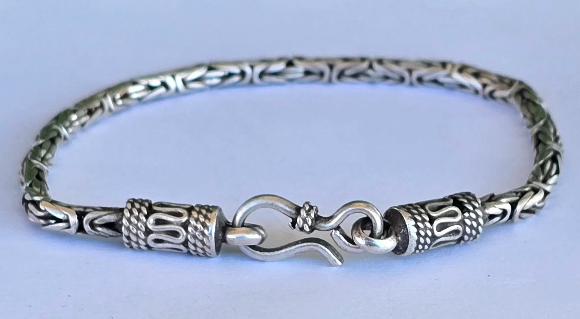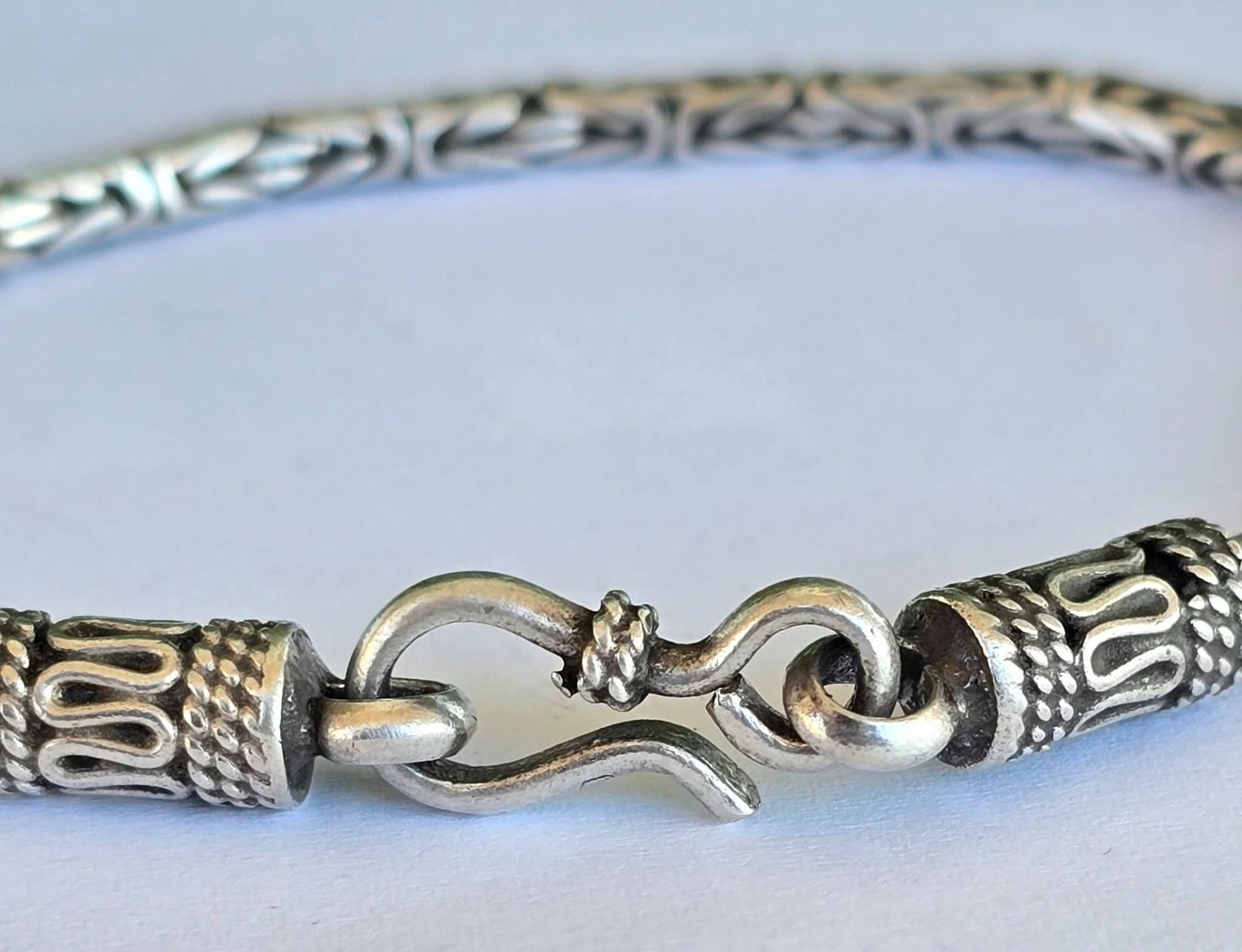 Brățară balineză veche, din argint, cu împletitură în stil bizantin, cunoscută și ca "bird's cage" (colivie de pasăre), cu structură tridimensională asemănătoare unei frânghii (anii 1980-1990, Bali, Indonezia).