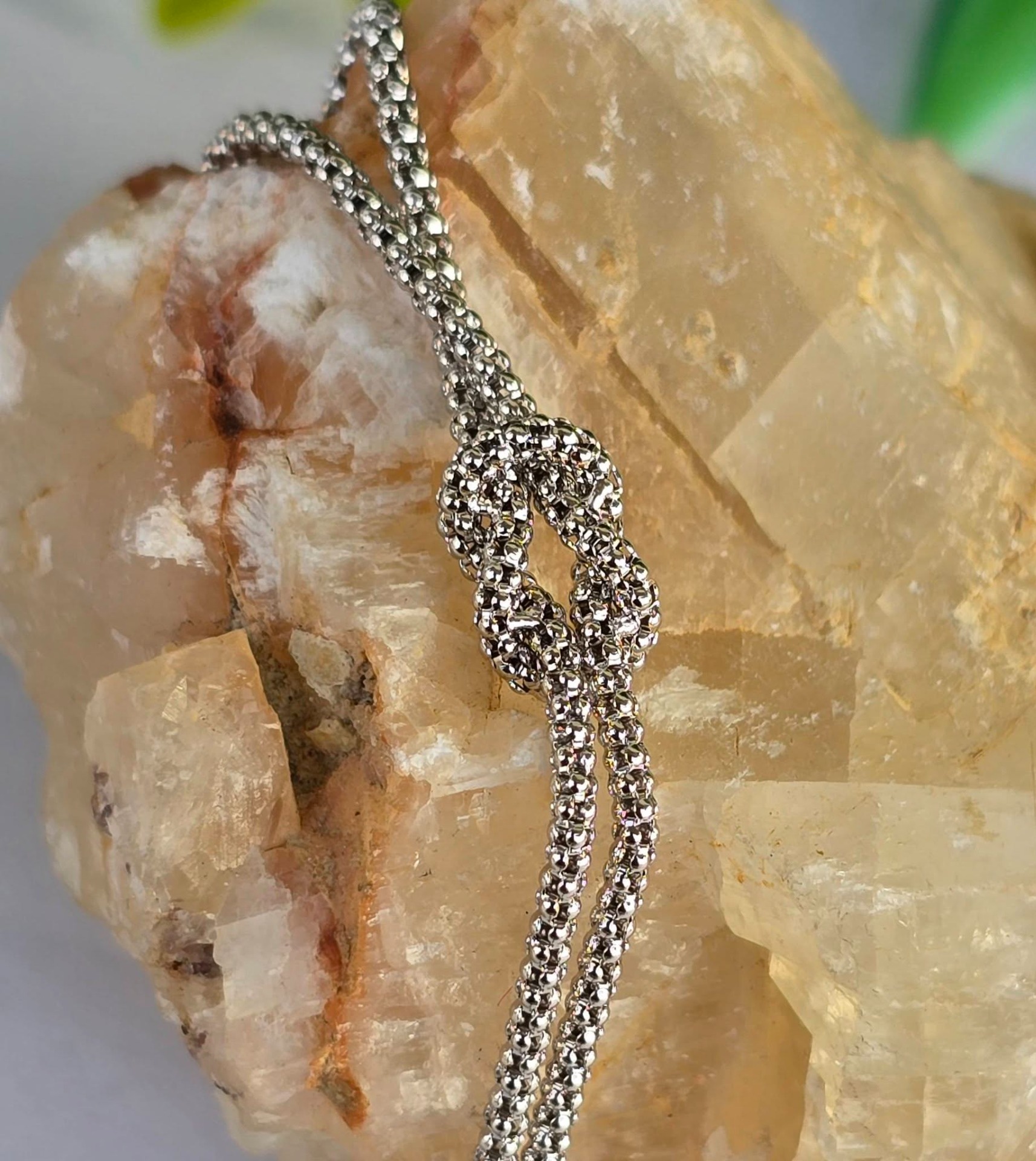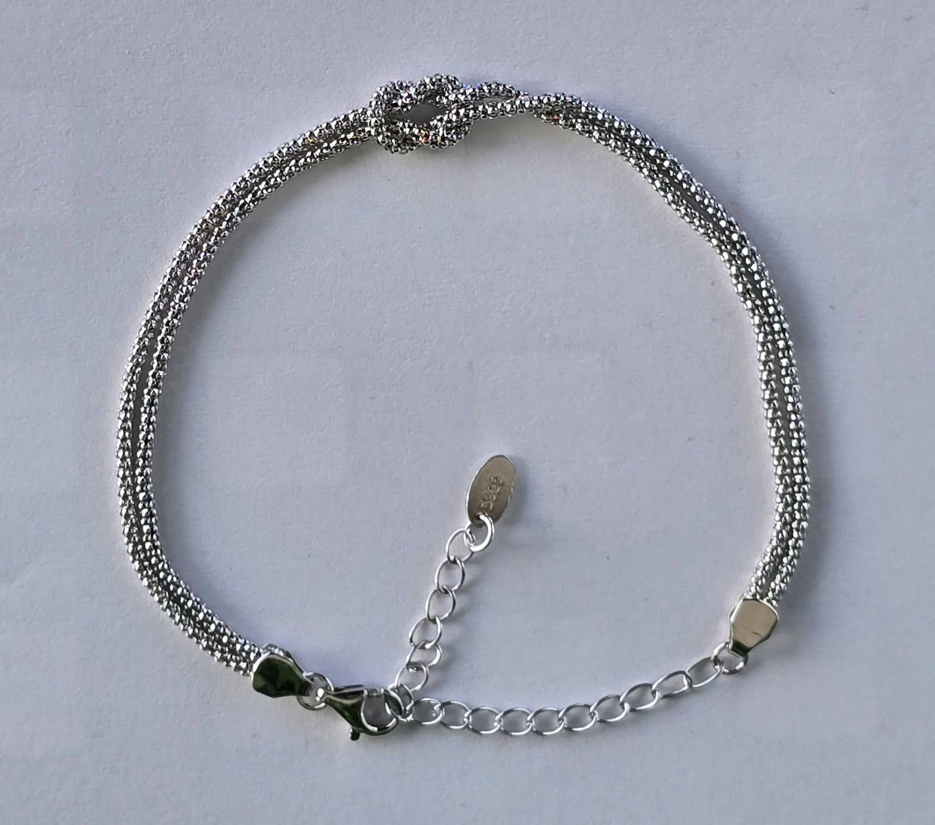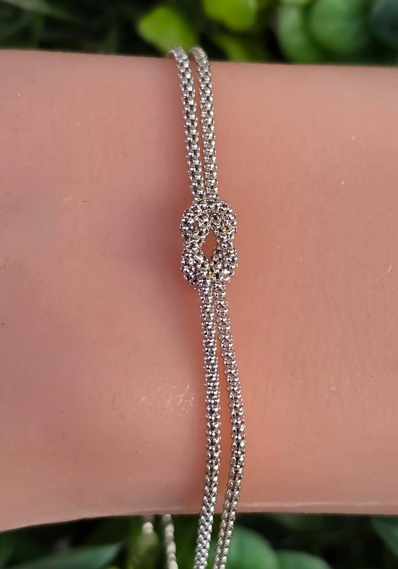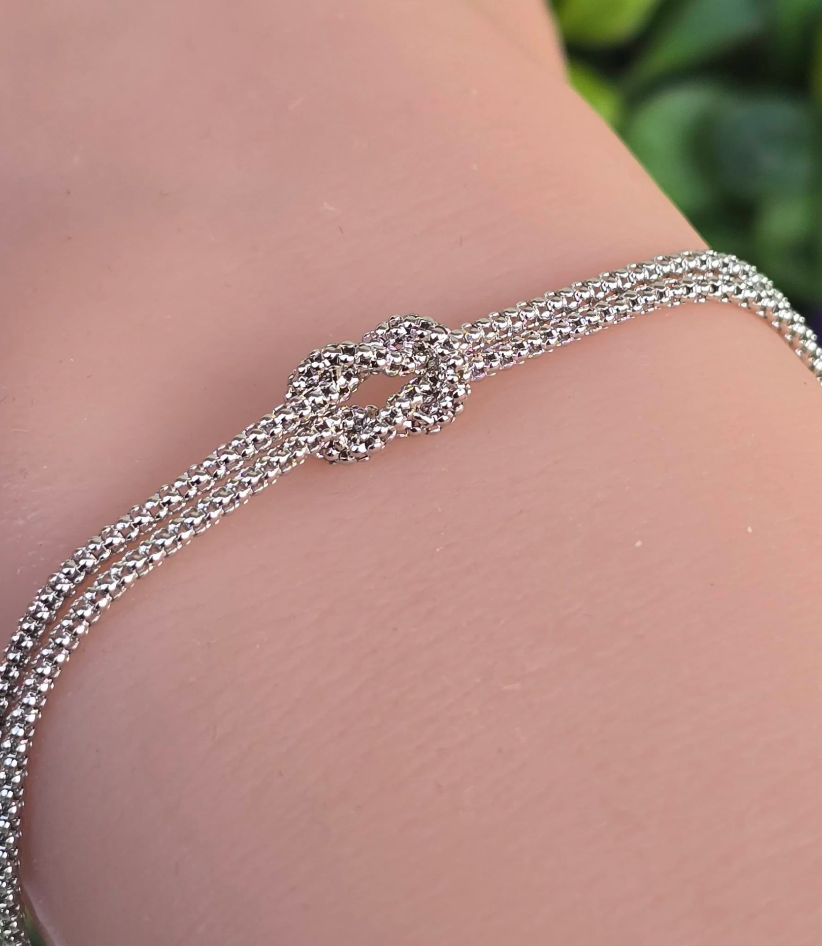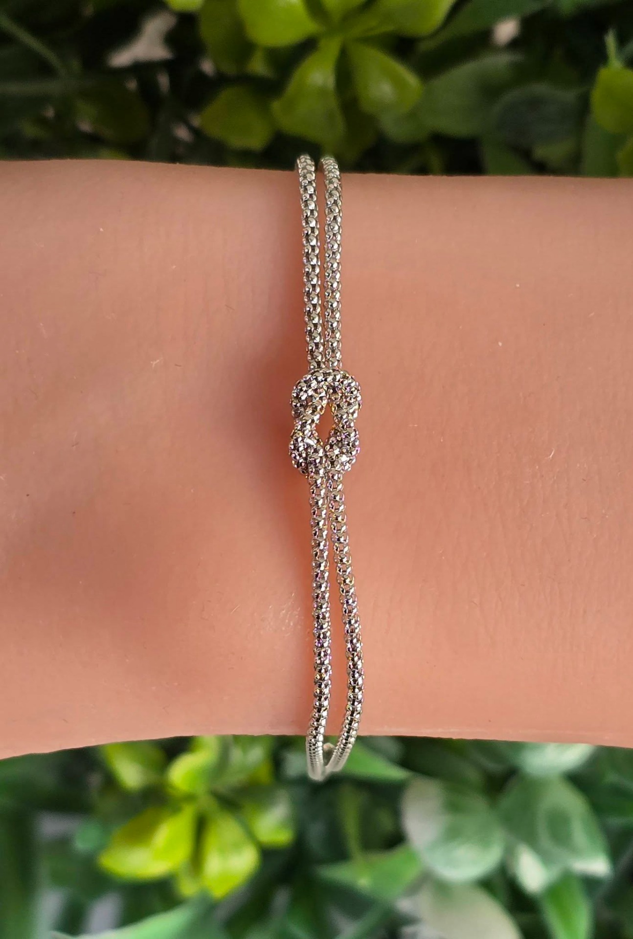 Brățară contemporană din argint, cu două lanțuri care formează un nod stilizat, cunoscut ca "nodul iubirii" ("love knot").