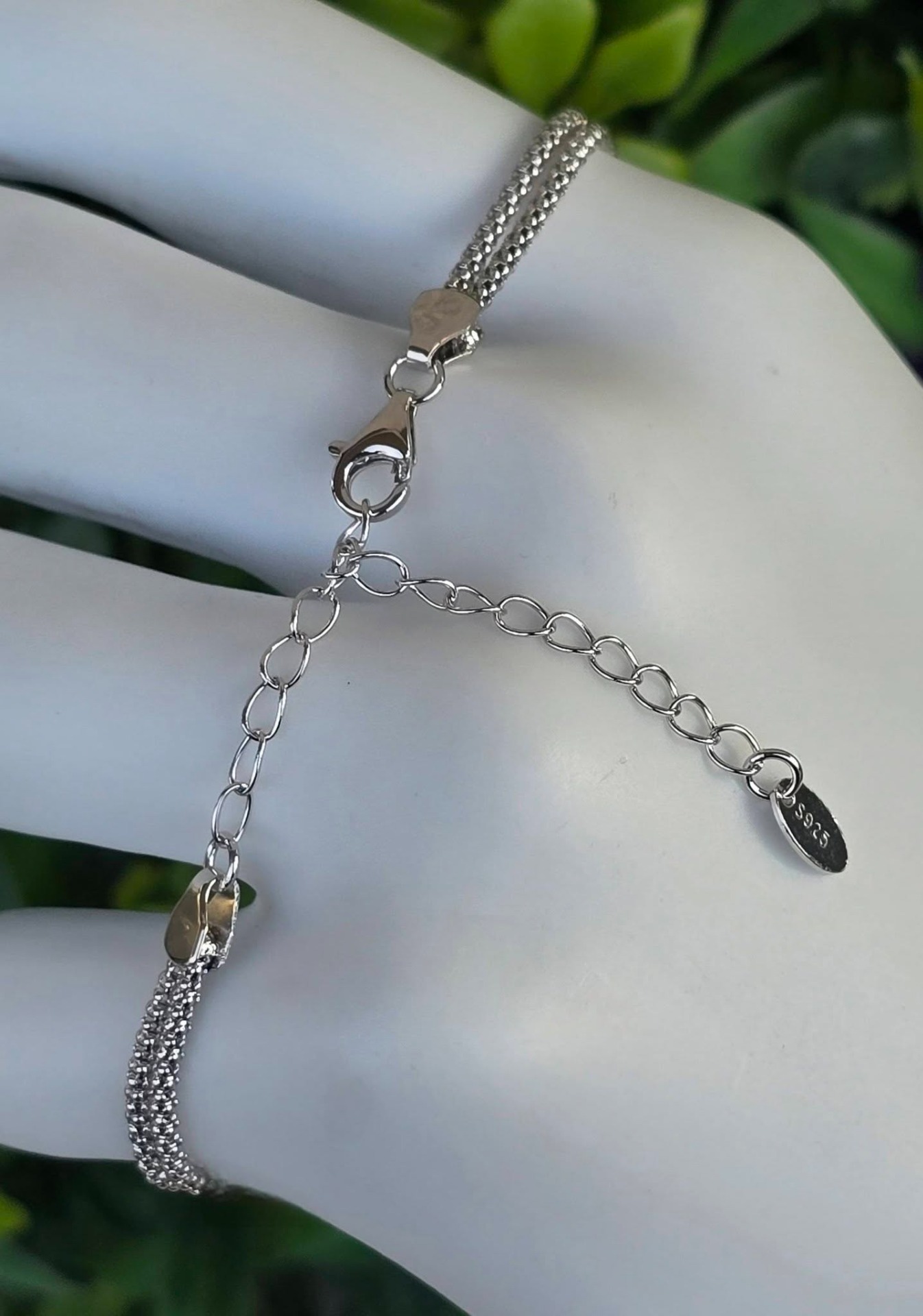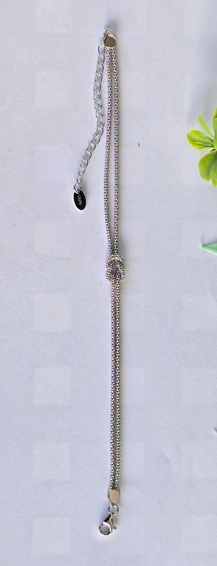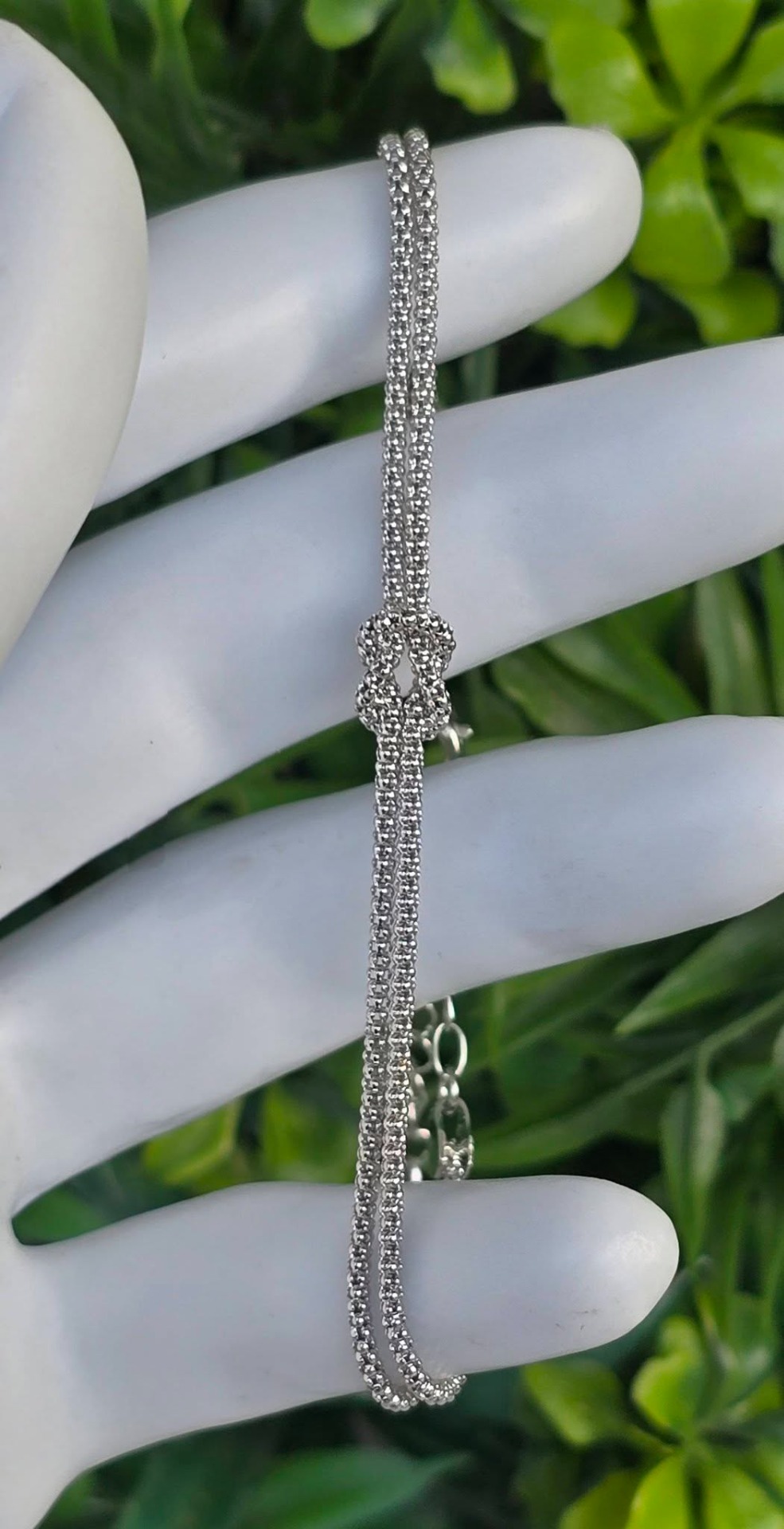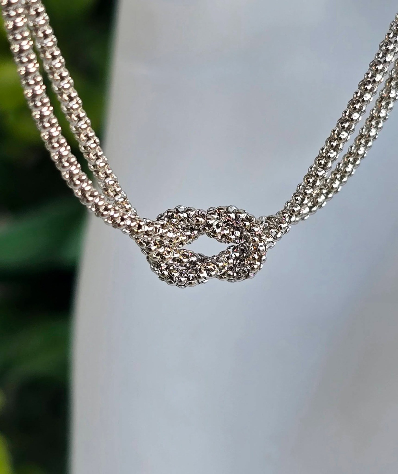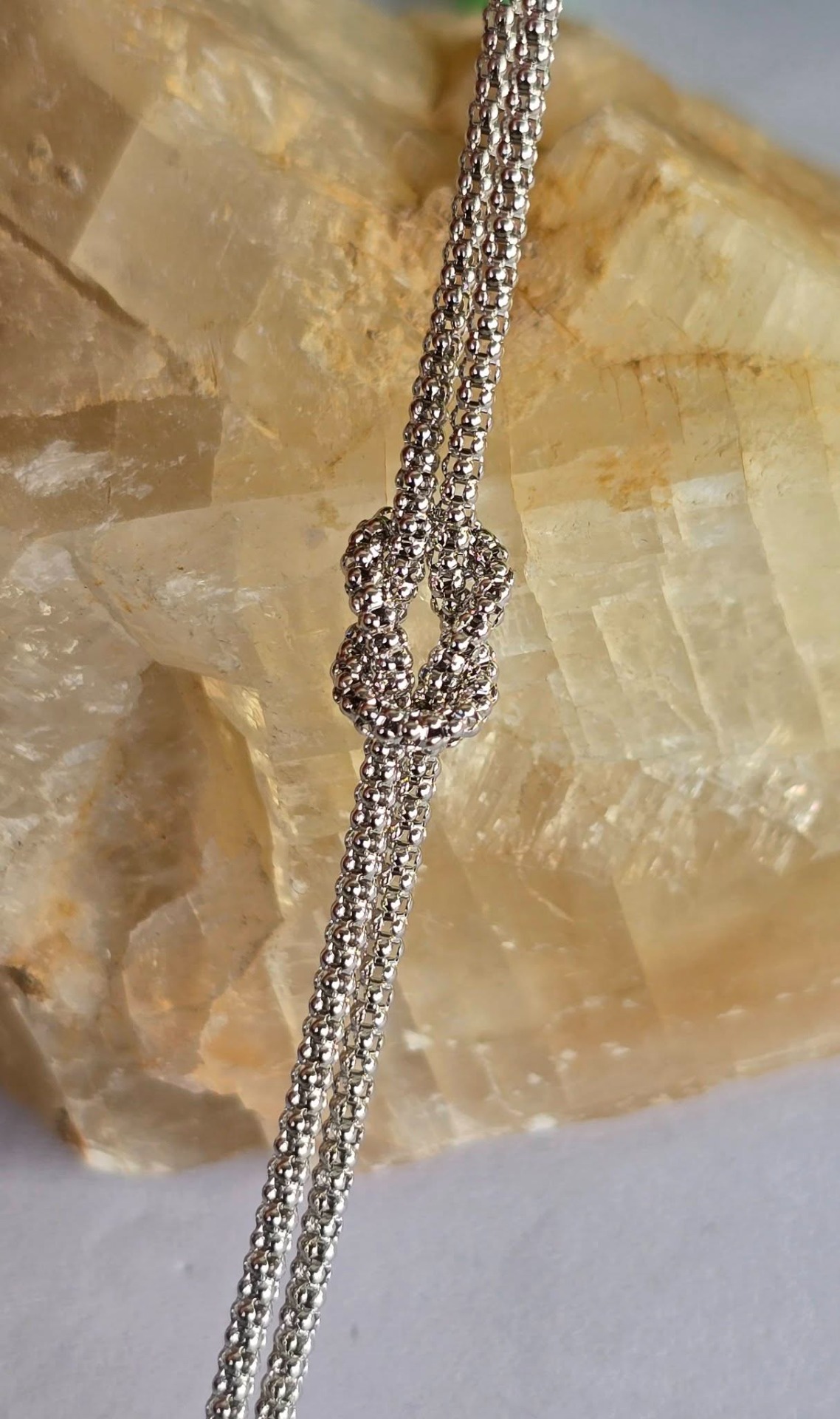 Brățară contemporană din argint, cu două lanțuri care formează un nod stilizat, cunoscut ca "nodul iubirii" ("love knot").