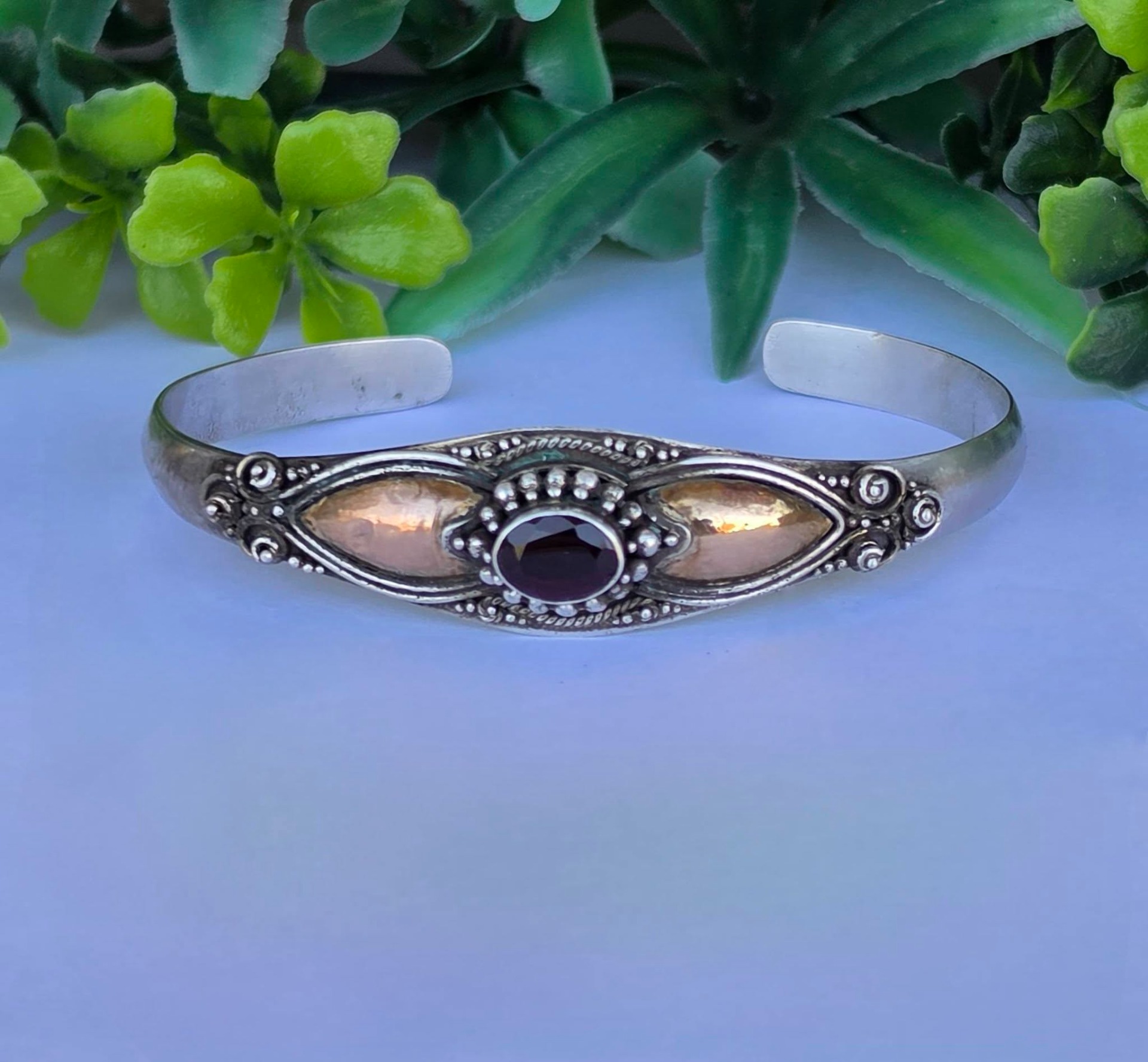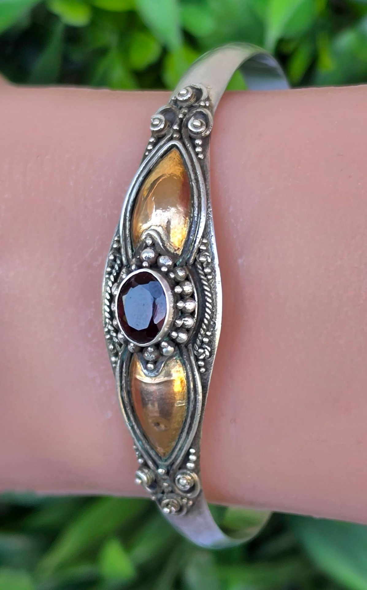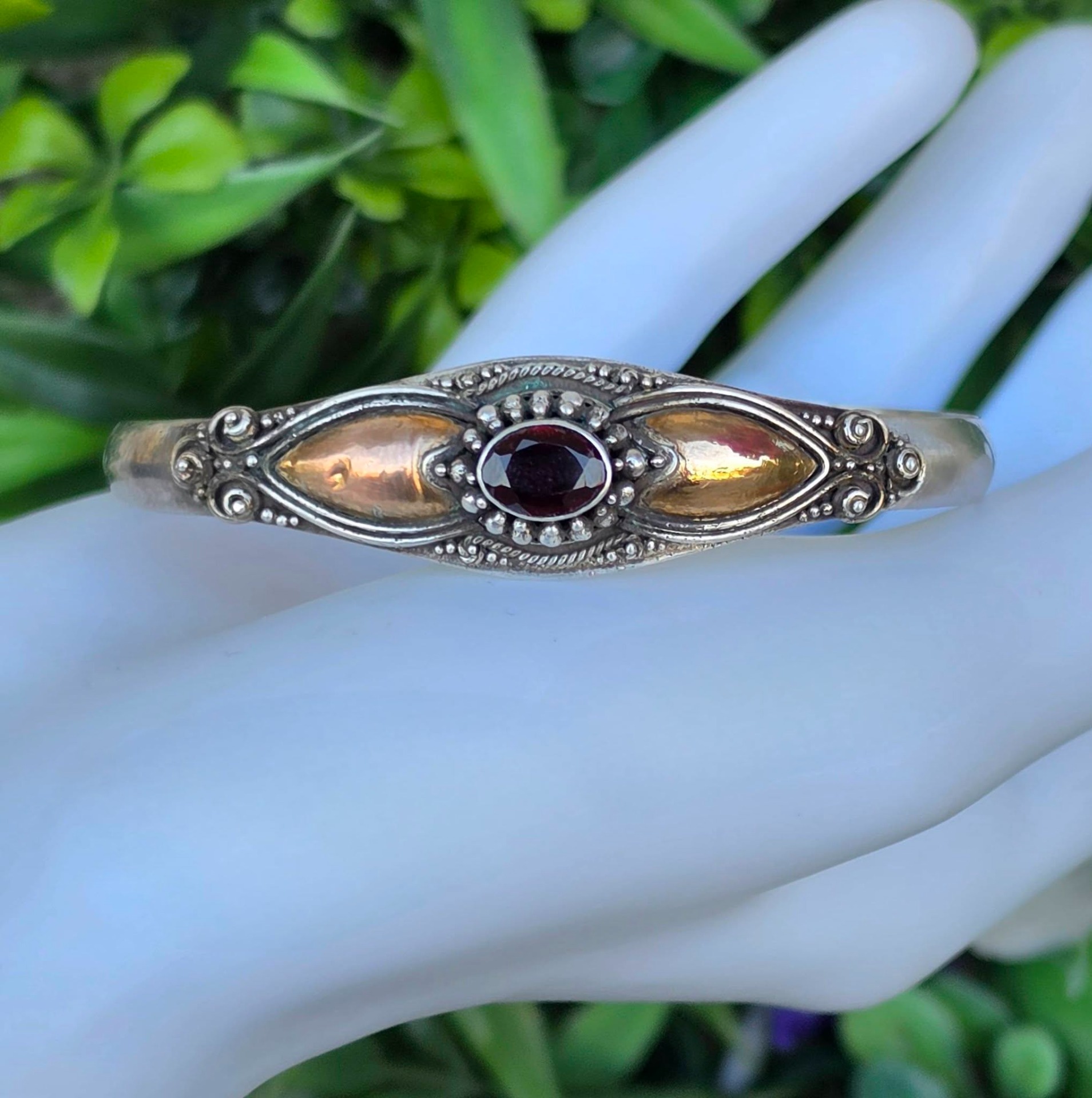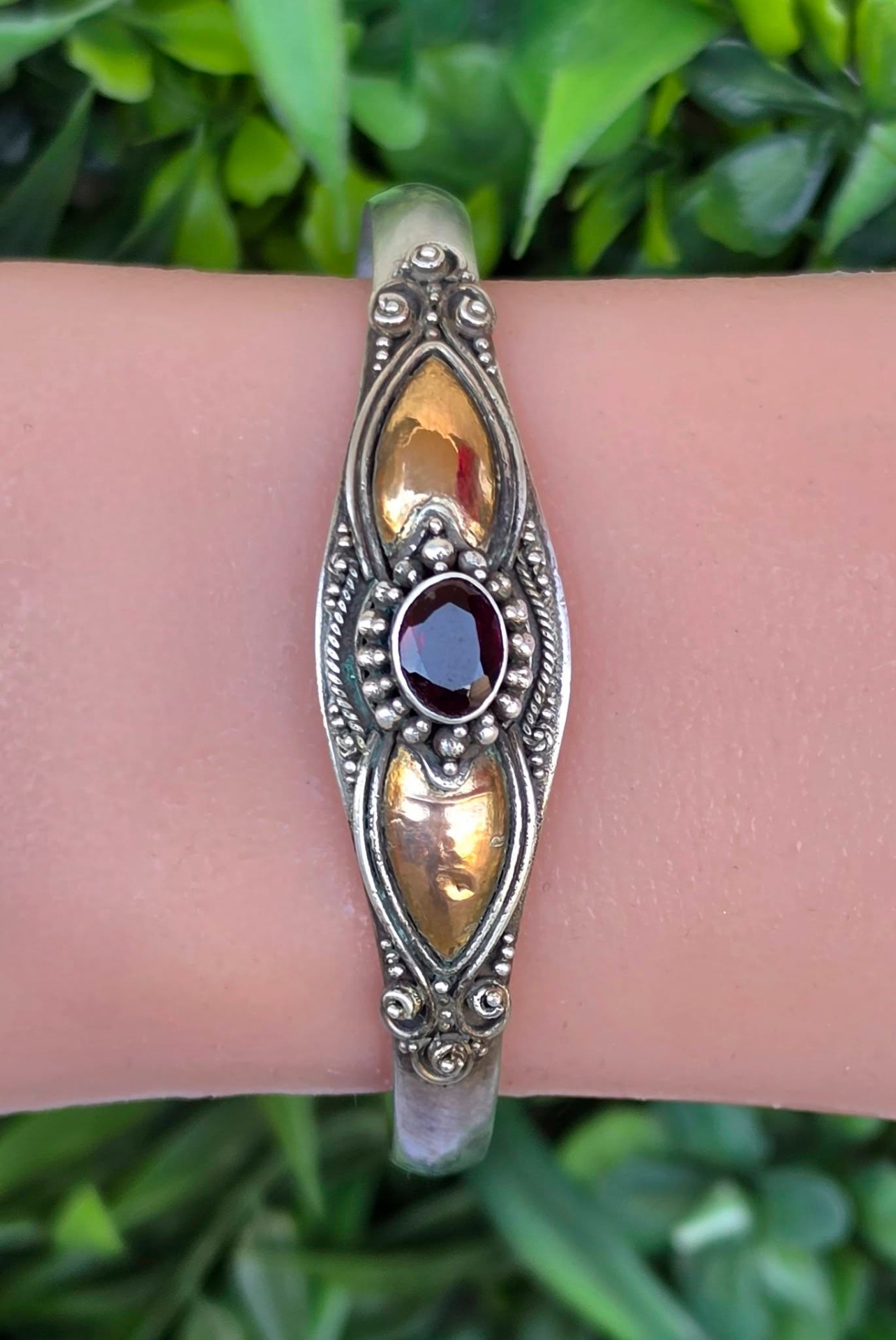 Brățară "cuff" veche, "two-tone", din argint și aur de 14K, cu granat natural, manufactură în stil tradițional balinez.
