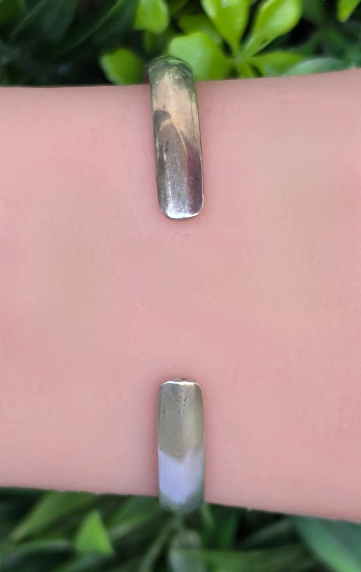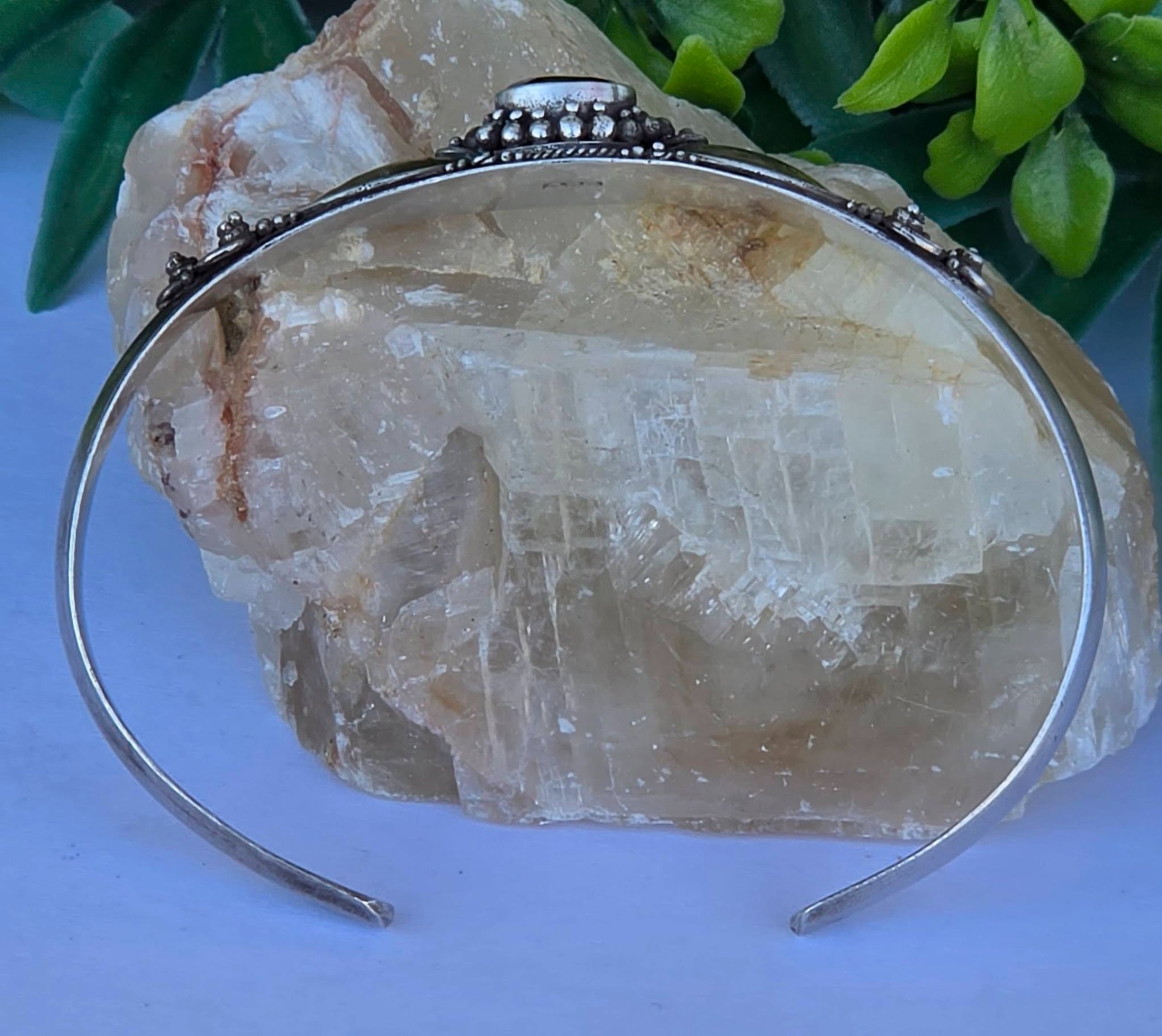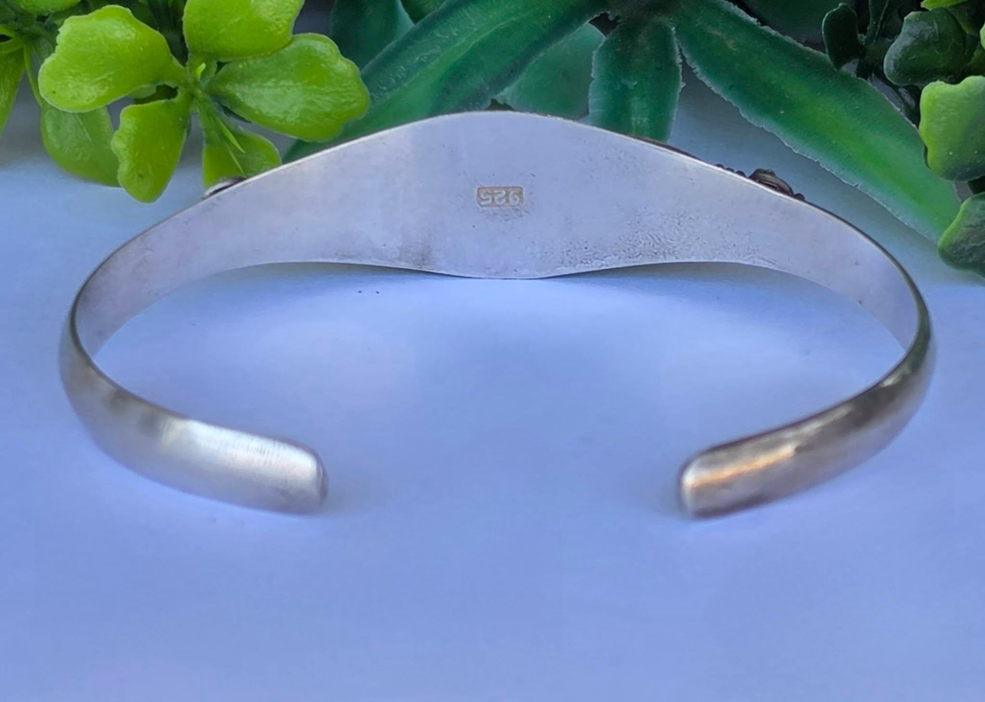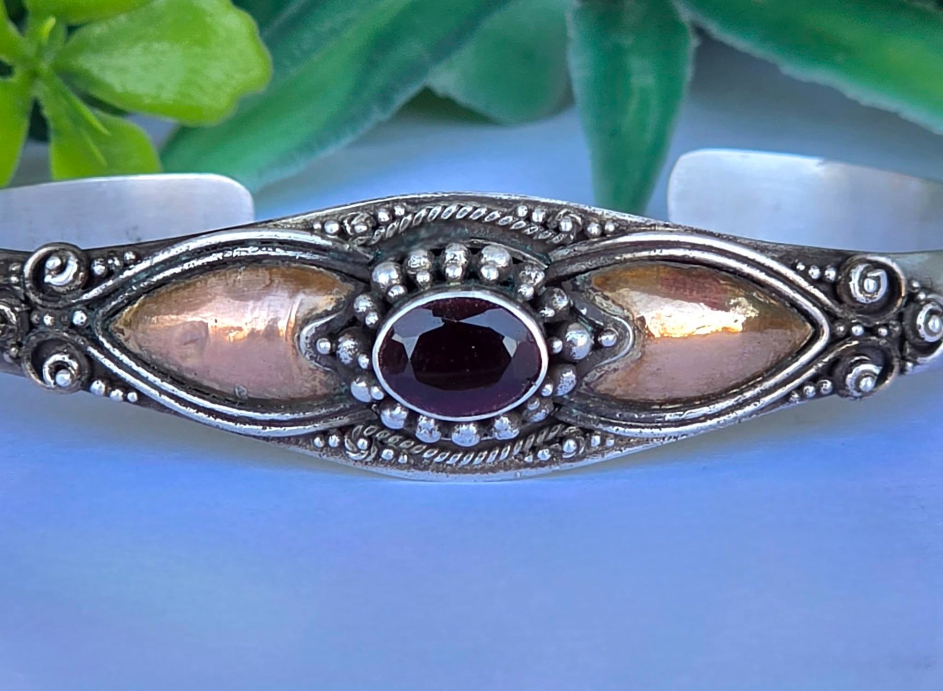 Brățară "cuff" veche, "two-tone", din argint și aur de 14K, cu granat natural, manufactură în stil tradițional balinez.
