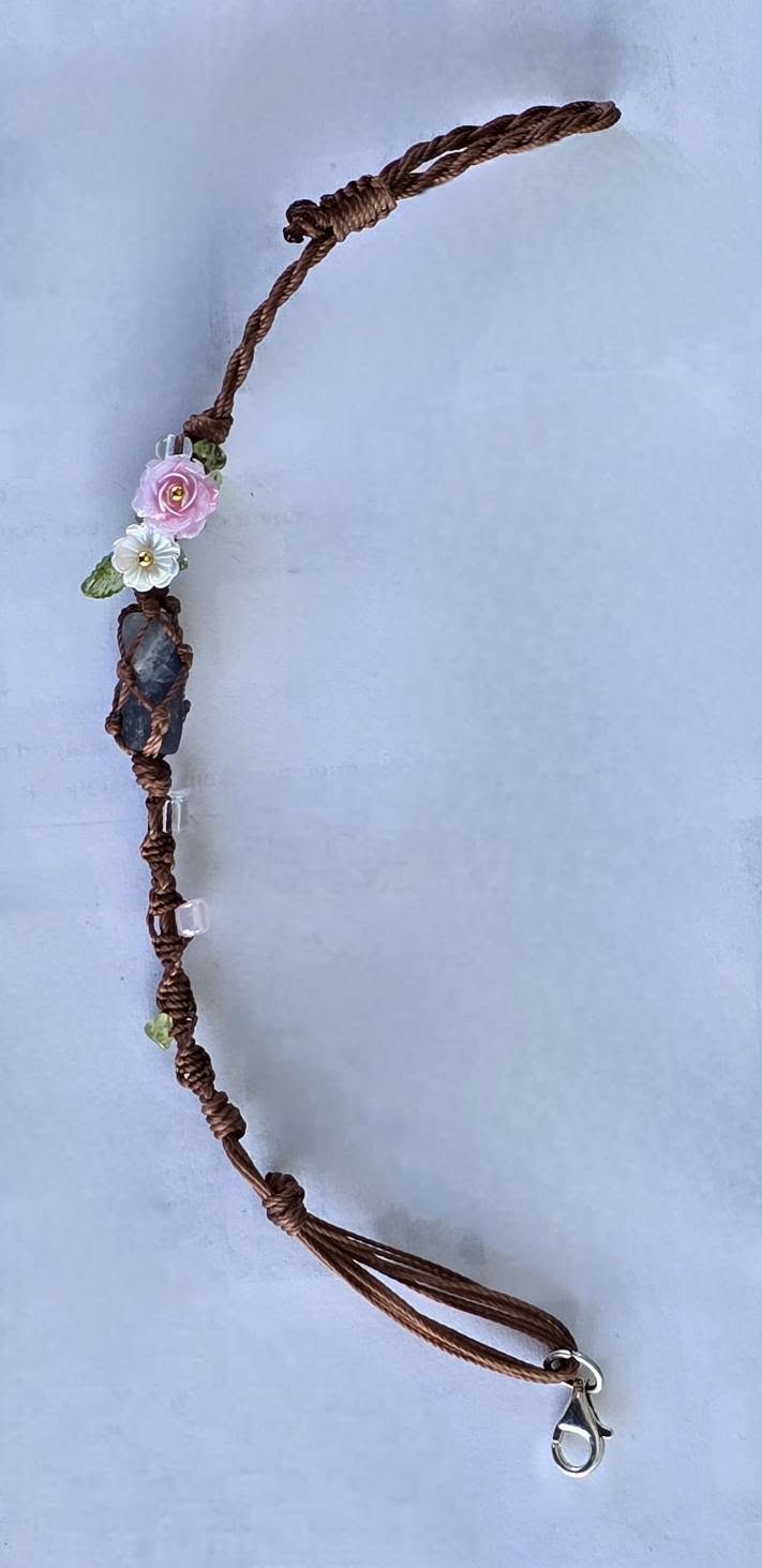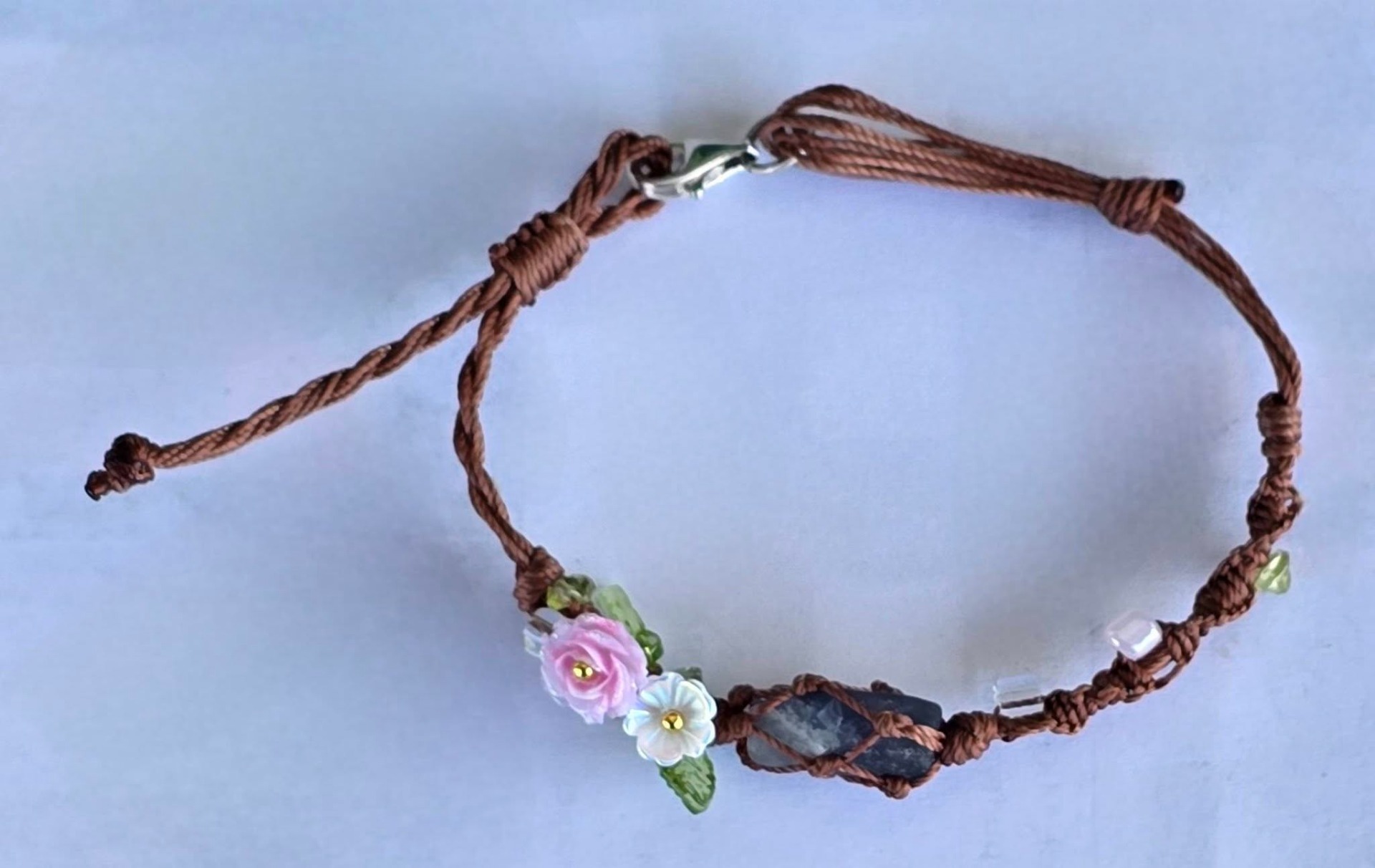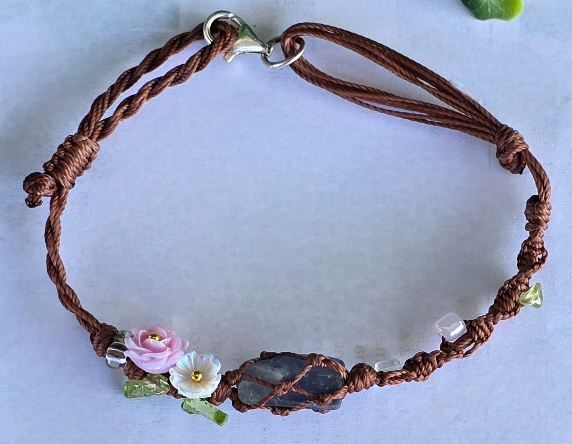 Brățară "handmade" contemporană "Boho-Chic", cu aquamarin brut, peridot și sidef dispuse pe șnur realizat prin tehnica "macramé", cu închizătoare din argint.